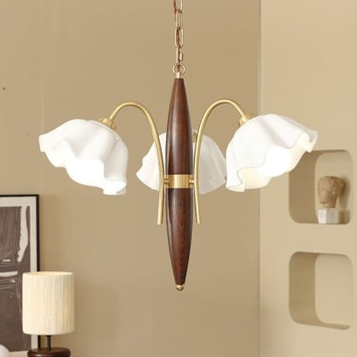 Vintage Ceramic Flower Shape Hanging Light Walnut Brass Chandelier