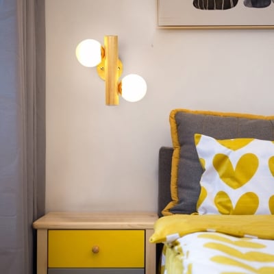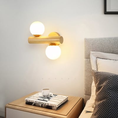 Modern Log Wood Double Glass Globe 2-Light Wall Sconce Lamp
