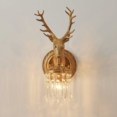 Vintage Luxury Deer Head Brass Crystal 1-Light Wall Sconce Lamp