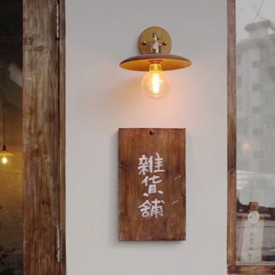 Contemporary Vintage Round Wood Grain Brass Wood 1-Light Wall Sconce Lamp For Living Room