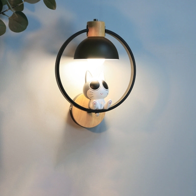 Contemporary Nordic Wood Iron Resin Round Cartoon Cat 1-Light Wall Sconce Lamp For Bedroom