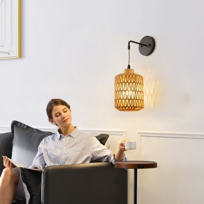 Traditional Vintage Lantern Shaped Weaving Rattan Wood Iron 1-Light Wall Sconce Lamp For Bedroom
