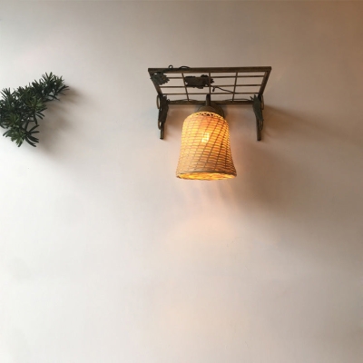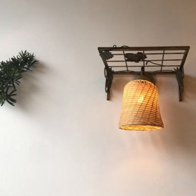 Traditional Rustic Rectangular Grid Cylinder Iron Bamboo Woven 1-Light Wall Sconce Lamp For Living Room