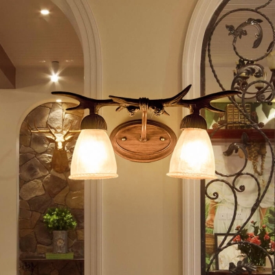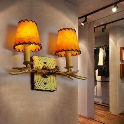 Traditionelle Vintage-Wandleuchte mit Geweih-Eisenharz-Kunstpergamentschirm, 2-flammig, für Wohnzimmer