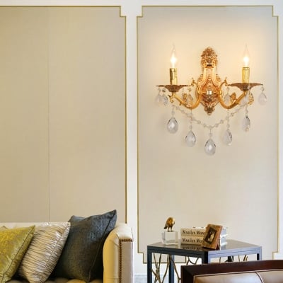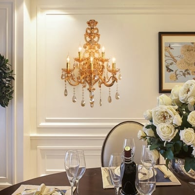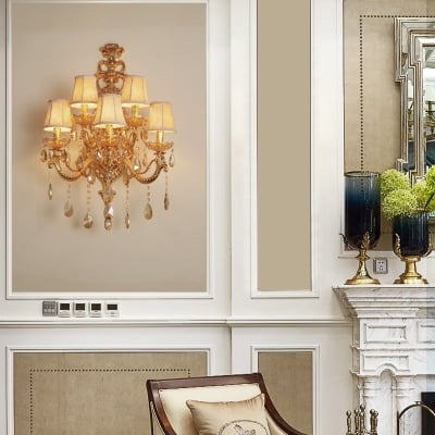 Traditionelle europäische goldene Kandelaber-Glas-Kristall-Hardware, 5-flammige Wandleuchte für Wohnzimmer