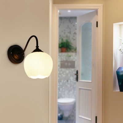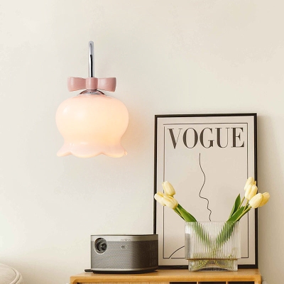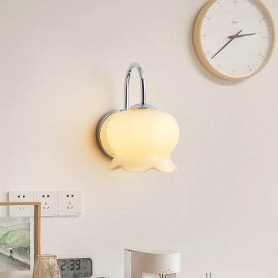 Moderne minimalistische cremefarbene Glocken-Orchideen-Blumen-Bogen-Eisenglas-Wandleuchte mit 1 Licht für Schlafzimmer