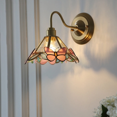 Traditionelle Vintage bunte Schmetterling dekorative konische Glasschirm Messing 1-flammige Wandleuchte Lampe für Schlafzimmer