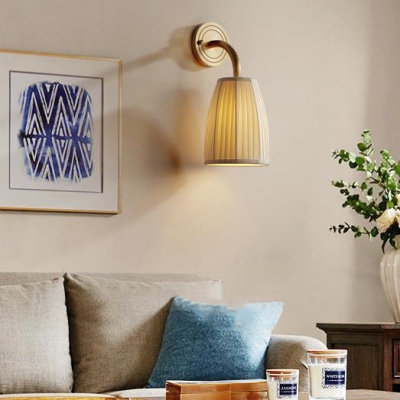 Traditionelle Vintage-Wandleuchte aus antikem Messing mit plissiertem Stoff, runder Schirm, 1-flammig, für Wohnzimmer