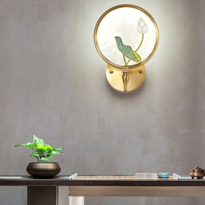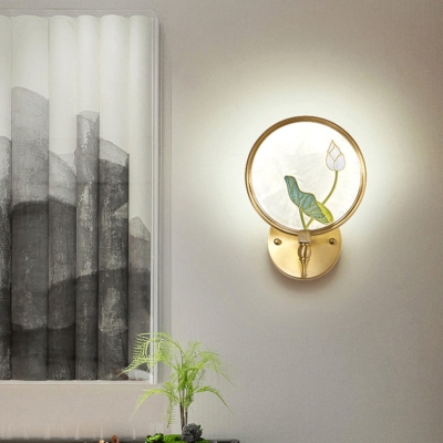 Traditionelle chinesische runde Pflaumenblüten-Lotusblatt-Aluminium-Acryl-LED-Wandleuchte für Wohnzimmer