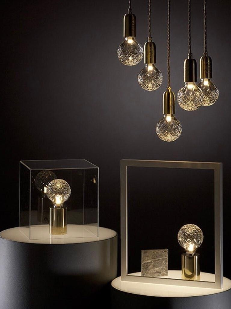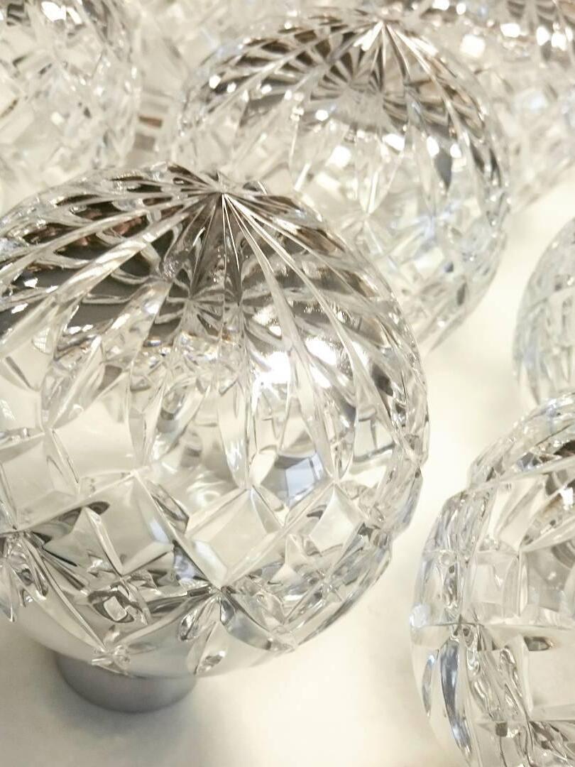 Die LED-Pendelleuchte Crystal Bulb mit mehreren Lichtern ist inspiriert vom exquisiten und sorgfältigen Verfahren des Kristallschleifens, das man häufig bei traditionellen Whiskygläsern und Karaffen sieht. Eine Gruppe kugelförmiger Kristallschirme schwebt in einer eleganten Komposition, die durch ihr raffiniertes handgeschliffenes Design hervorgehoben wird. Das von den Schirmen gestreute LED-Licht gipfelt in einem klaren Umgebungslicht, das das eingravierte Zierlogo auf jeder der Lampenfassungen aus Stahl hervorhebt.