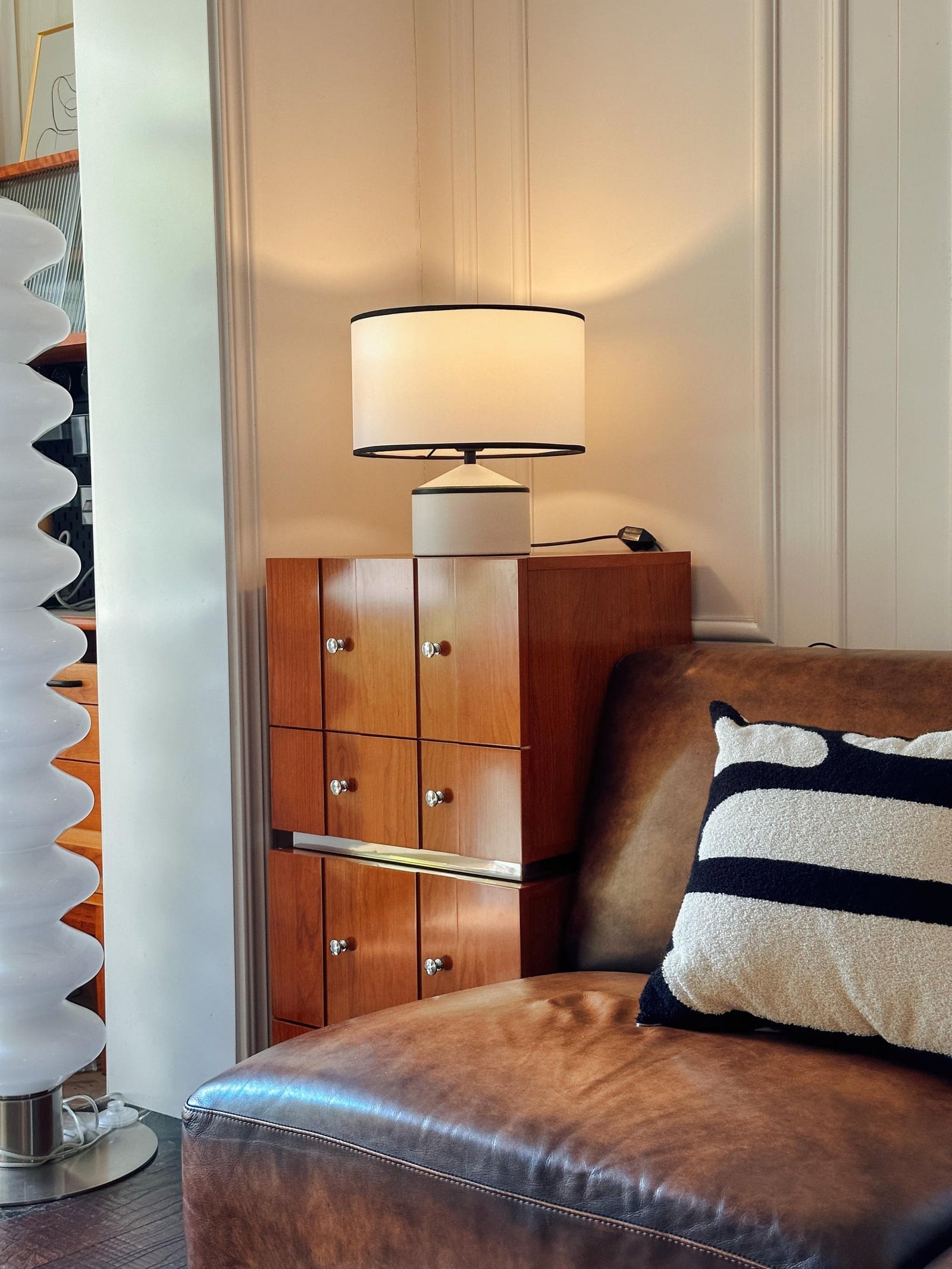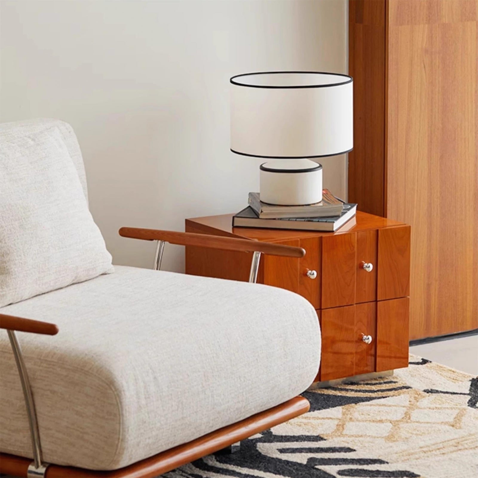 Die Cyls Minimalist Drum Shade Tischlampe verkörpert Einfachheit und moderne Eleganz und ist somit eine ideale Wahl für zeitgenössische Innenräume. Diese Lampe verfügt über einen schlanken, zylindrischen Sockel, der die Form ihres breiten, trommelförmigen Schirms widerspiegelt und eine kohärente und stromlinienförmige Silhouette schafft. Der Schirm strahlt ein sanftes, warmes Licht aus, das perfekt ist, um eine stimmungsvolle Beleuchtung in Schlafzimmern, Wohnzimmern oder Büros zu schaffen.