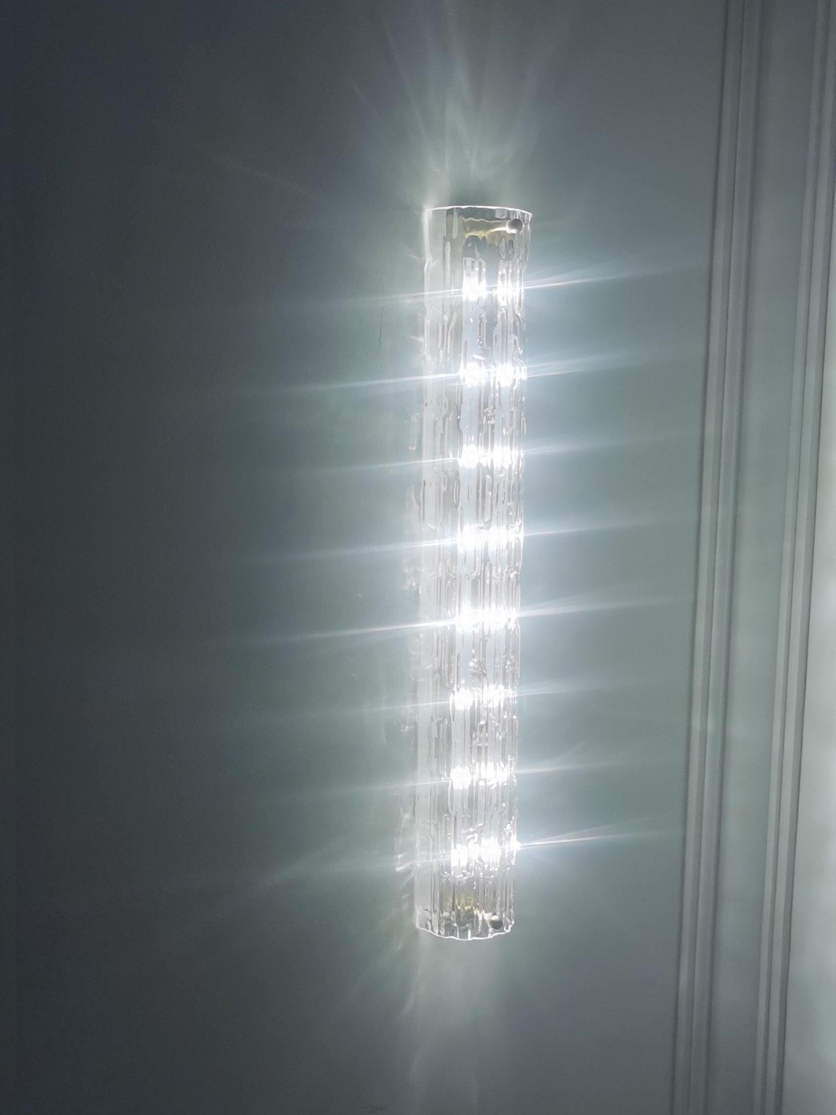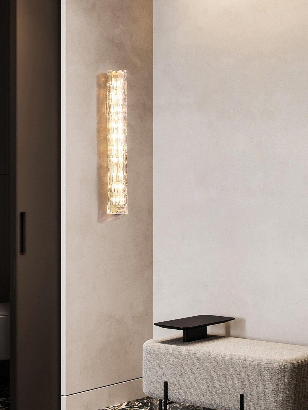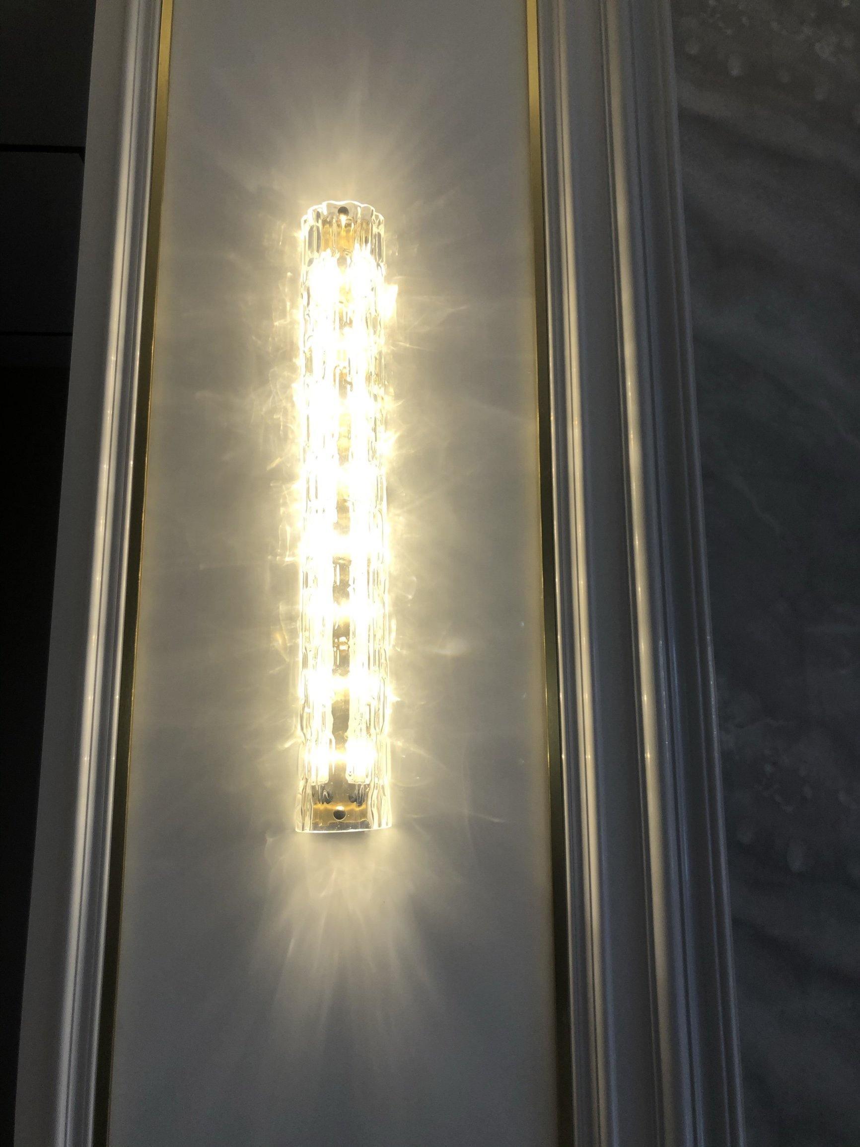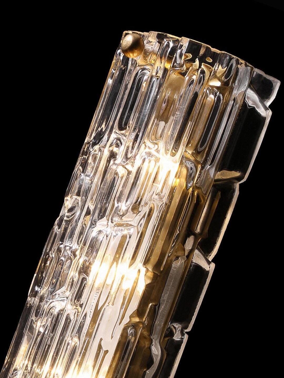 Mit einem in Italien hergestellten Glasschirm und einer in unserem Werk endbearbeiteten Vorrichtung zeugt die vielseitige Wandleuchte von unserem Erbe und unserer Leidenschaft für hochwertige Handwerkskunst. Der strukturierte Glasschirm streut das Licht im Stil eines traditionellen Kristallleuchters, während die Details für ein gehobenes, zeitloses Aussehen sorgen.