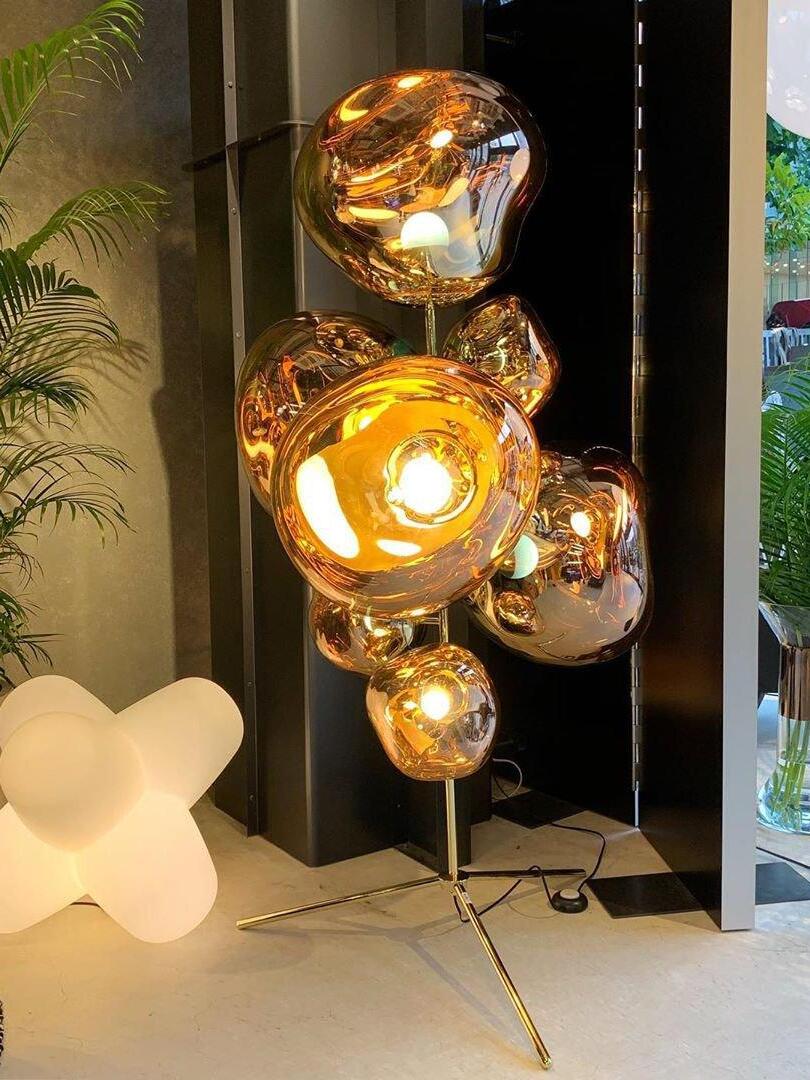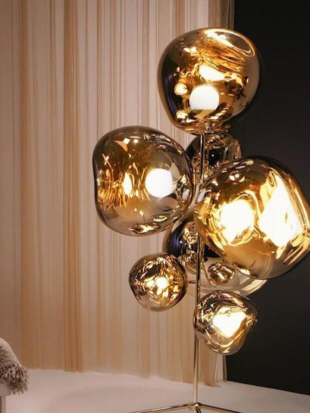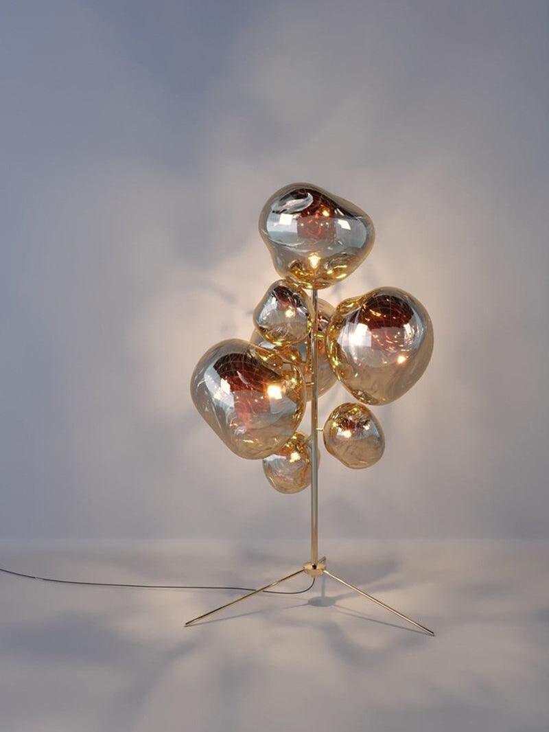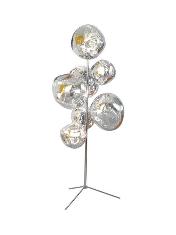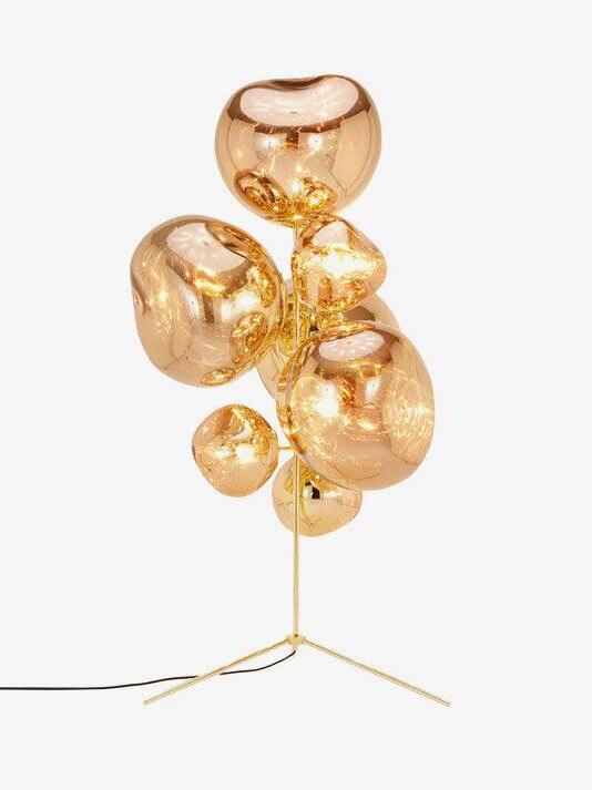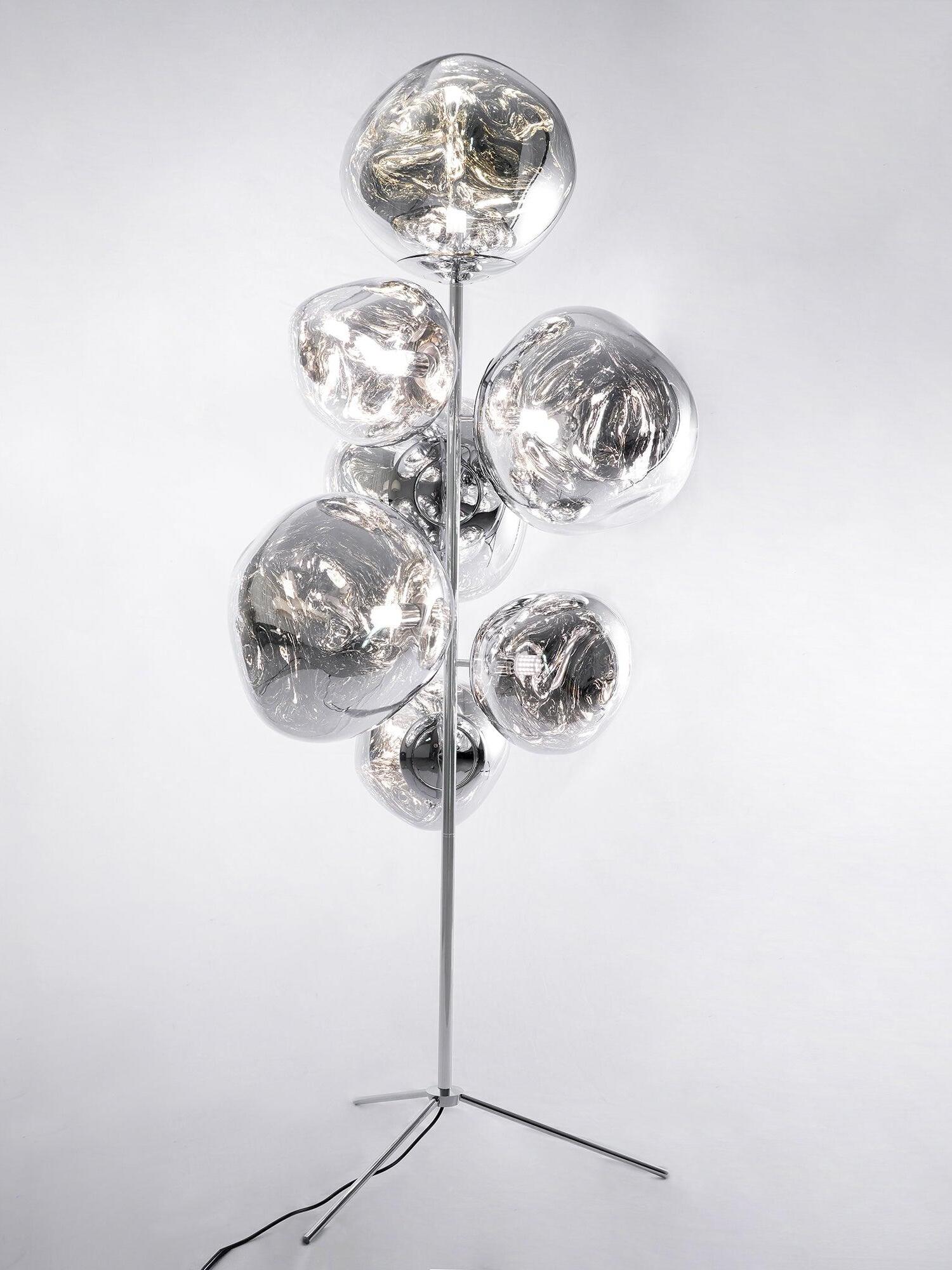 Ein außergewöhnlicher Bodenleuchter mit drei Melt Mini-Schirmen und vier Melt-Schirmen in modernem Gold-Finish. Er strahlt ein attraktives, leicht halluzinogenes Licht aus und erzeugt beim Einschalten einen faszinierenden schmelzenden Effekt aus heiß geblasenem Glas sowie einen spiegelnden Effekt, wenn er ausgeschaltet ist. Er strahlt ein attraktives, leicht halluzinogenes Licht aus. Melt-Stehleuchten sind in Kupfer, Chrom und Gold erhältlich.