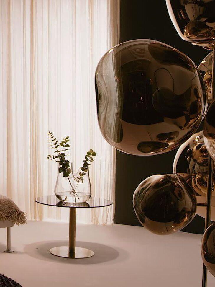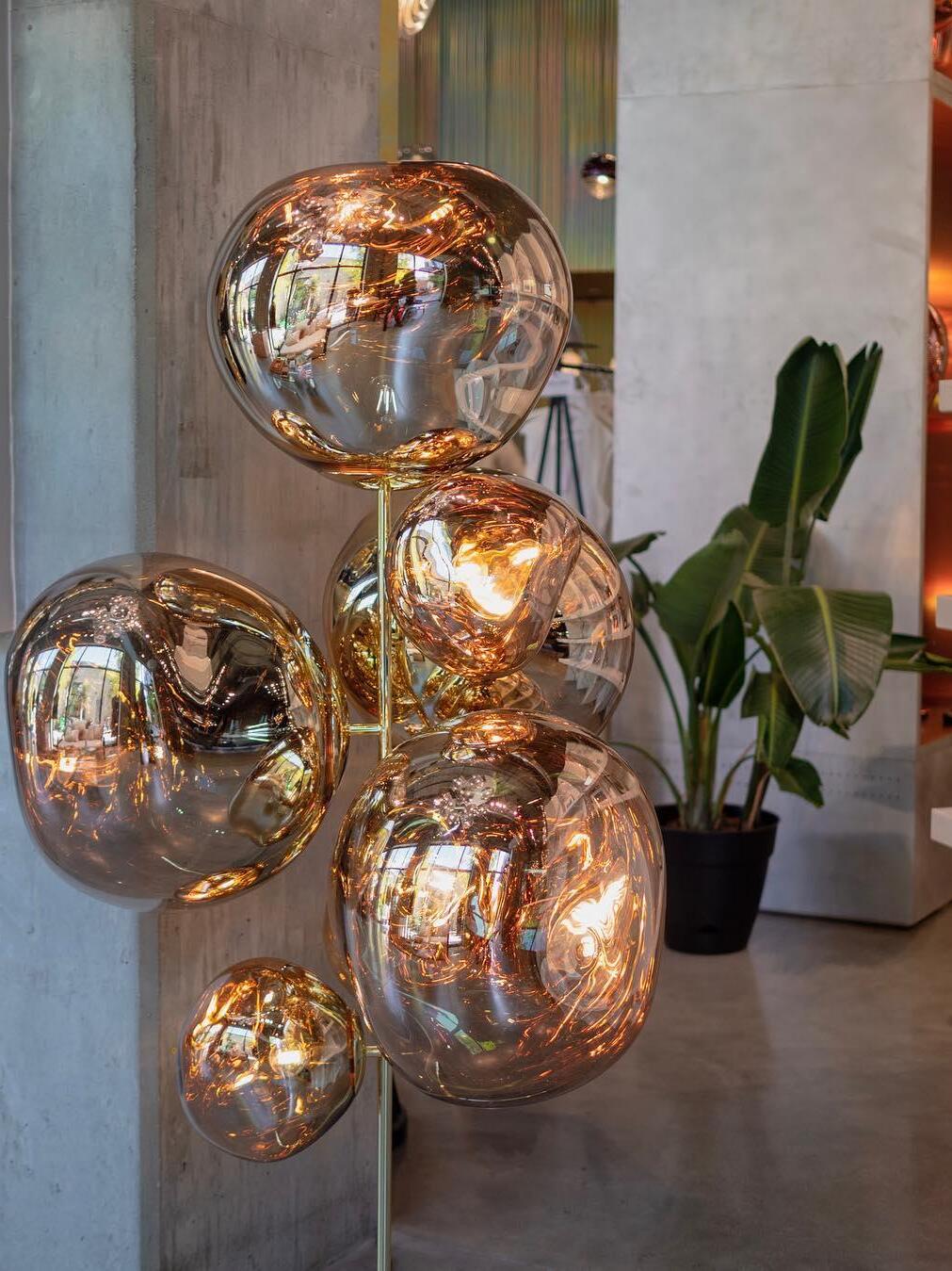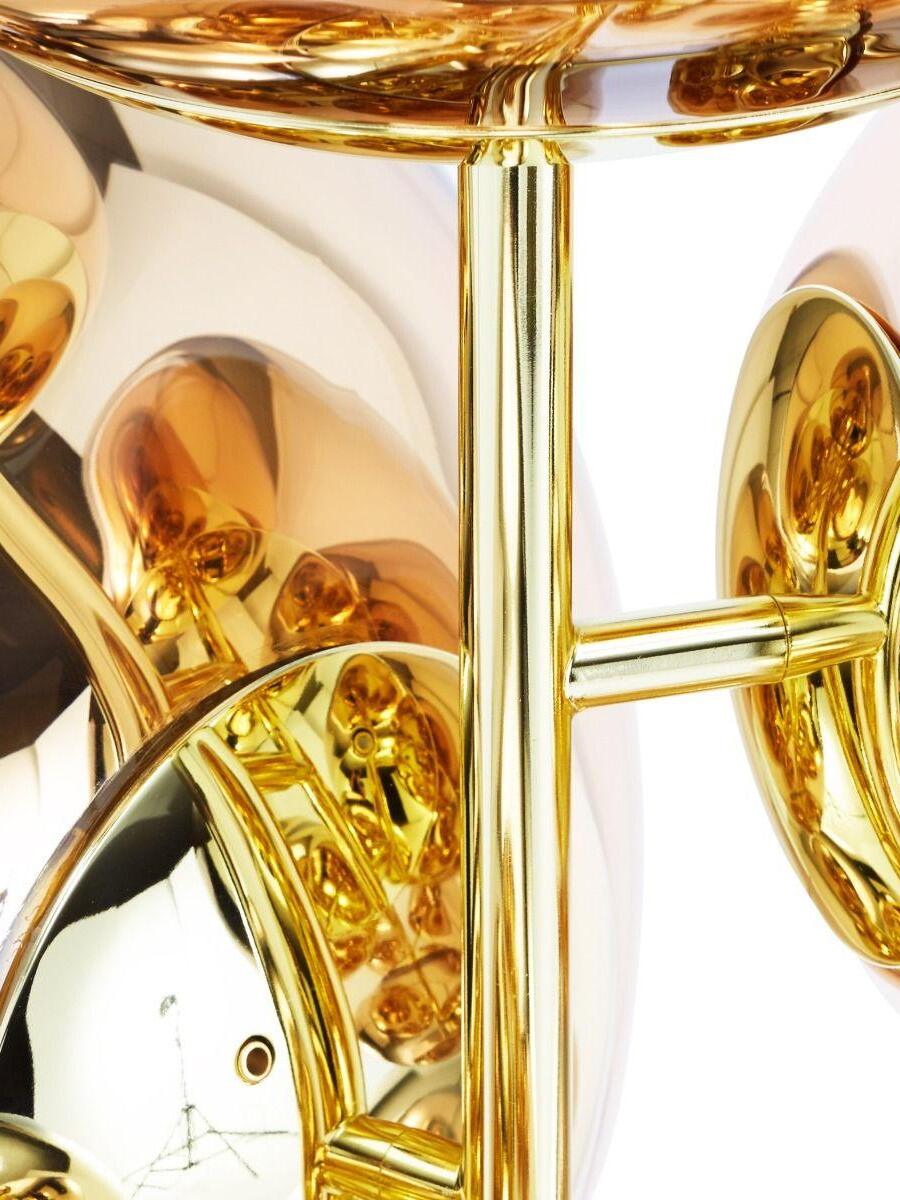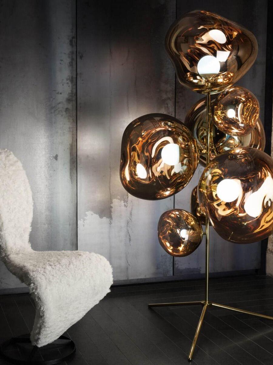 Ein außergewöhnlicher Bodenleuchter mit drei Melt Mini-Schirmen und vier Melt-Schirmen in modernem Gold-Finish. Er strahlt ein attraktives, leicht halluzinogenes Licht aus und erzeugt beim Einschalten einen faszinierenden schmelzenden Effekt aus heiß geblasenem Glas sowie einen spiegelnden Effekt, wenn er ausgeschaltet ist. Er strahlt ein attraktives, leicht halluzinogenes Licht aus. Melt-Stehleuchten sind in Kupfer, Chrom und Gold erhältlich.