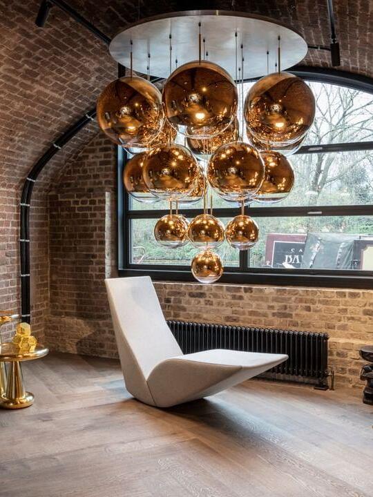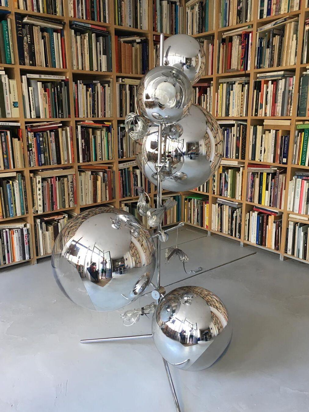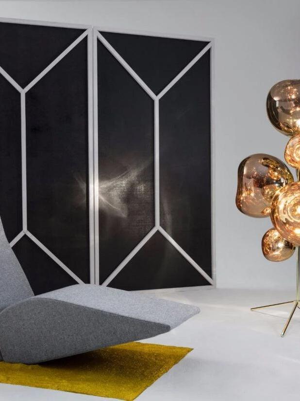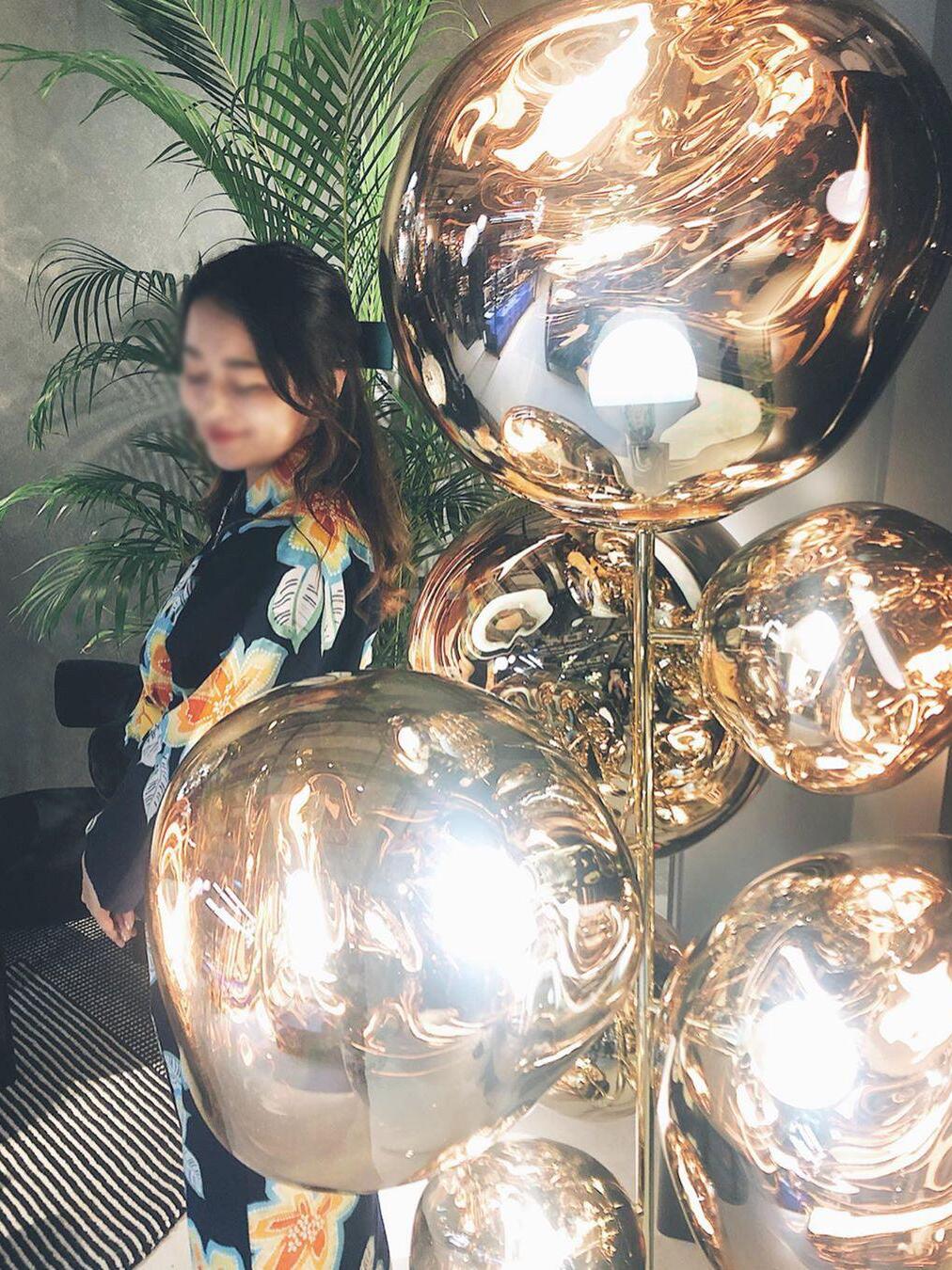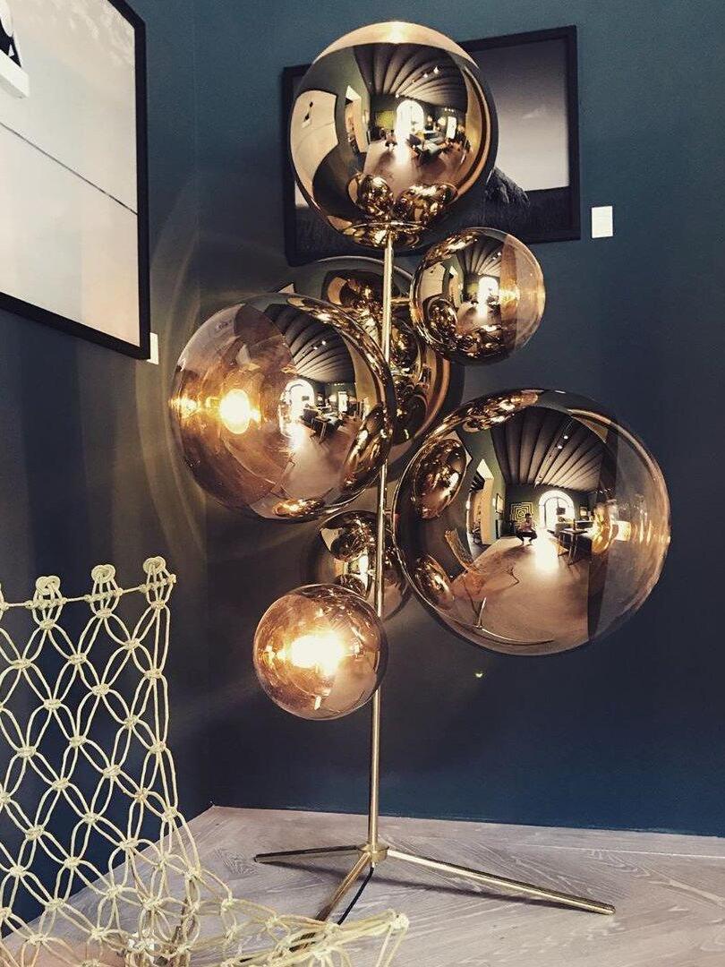 Ein außergewöhnlicher Bodenleuchter mit drei Melt Mini-Schirmen und vier Melt-Schirmen in modernem Gold-Finish. Er strahlt ein attraktives, leicht halluzinogenes Licht aus und erzeugt beim Einschalten einen faszinierenden schmelzenden Effekt aus heiß geblasenem Glas sowie einen spiegelnden Effekt, wenn er ausgeschaltet ist. Er strahlt ein attraktives, leicht halluzinogenes Licht aus. Melt-Stehleuchten sind in Kupfer, Chrom und Gold erhältlich.