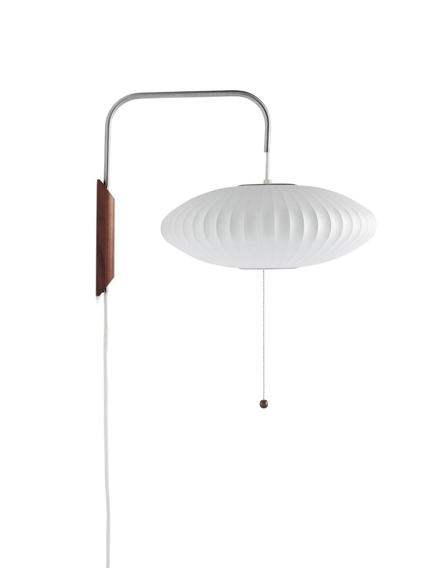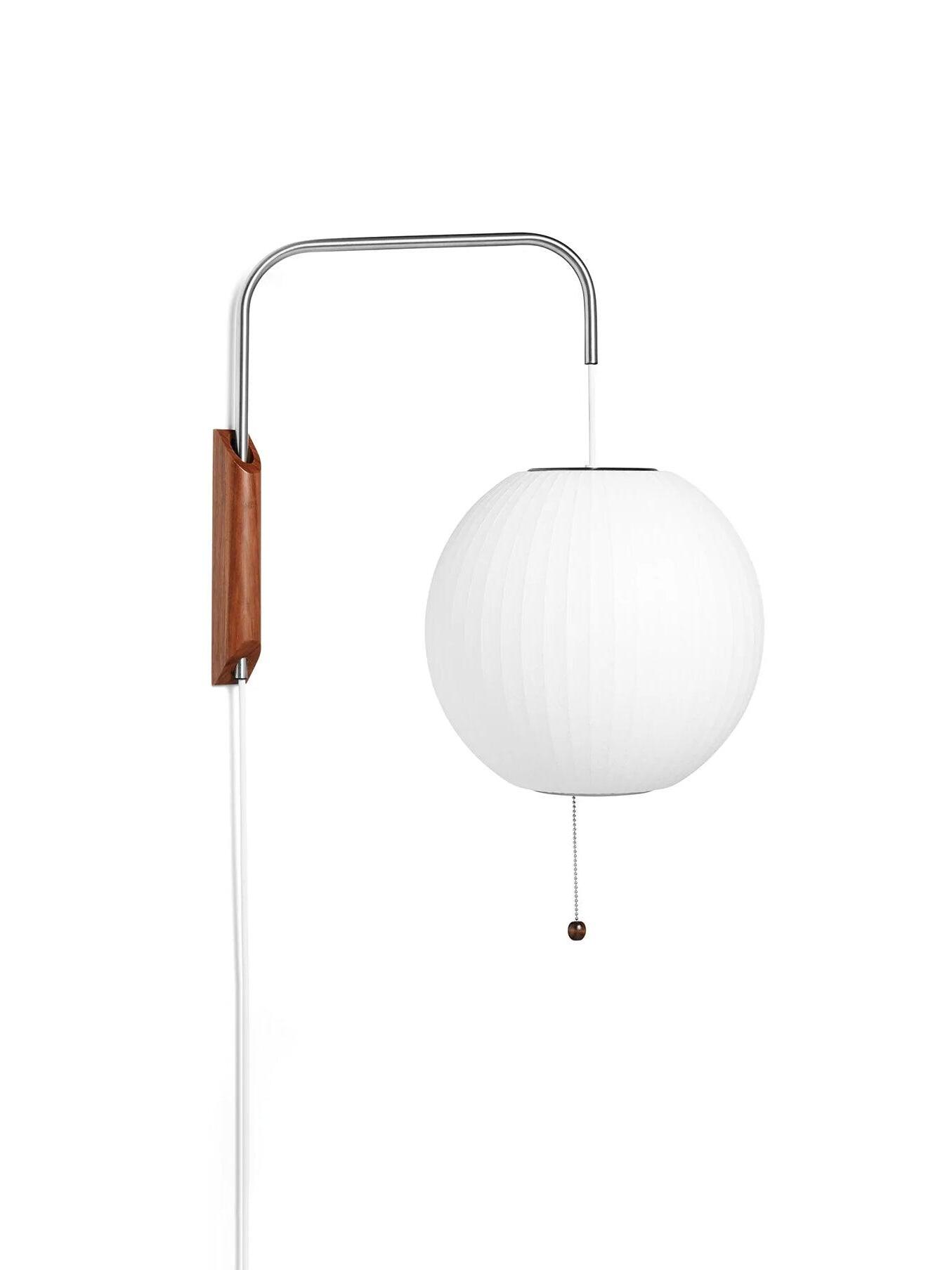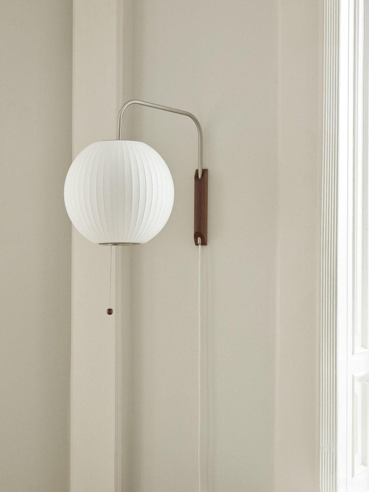 Variationen einer im Wesentlichen sphärischen Form, die Bubble Lamp-Serie ist ein distinguiertes und zeitloses Design. Die Nelson Ball Wandleuchte ist mit einem schwenkbaren Scharnier und einem verstellbaren Stecker-Kabel ausgestattet, das eine einfache Bewegung des Lampenschirms ermöglicht, ohne ihn an der Wand neu justieren zu müssen. Ihr hoher Preis hinderte ihn daran, eine zu kaufen, inspirierte ihn jedoch auch dazu, seine eigene zu entwerfen. Das Ergebnis war eine Serie von Lampen mit elementaren, sphärischen Formen wie einem runden Apfel, einer länglichen Zigarre und einer wohlgeformten Birne, unter anderem.