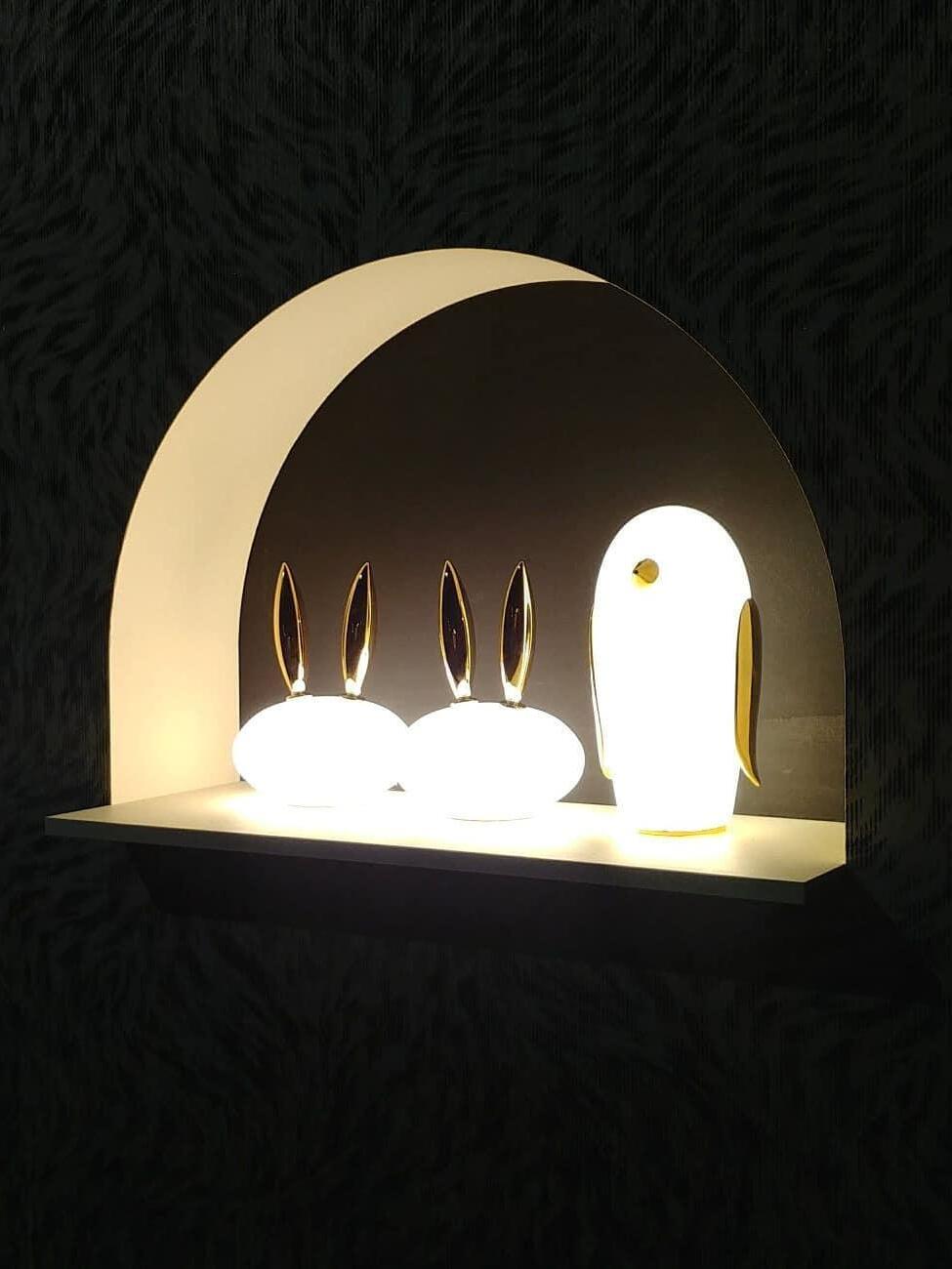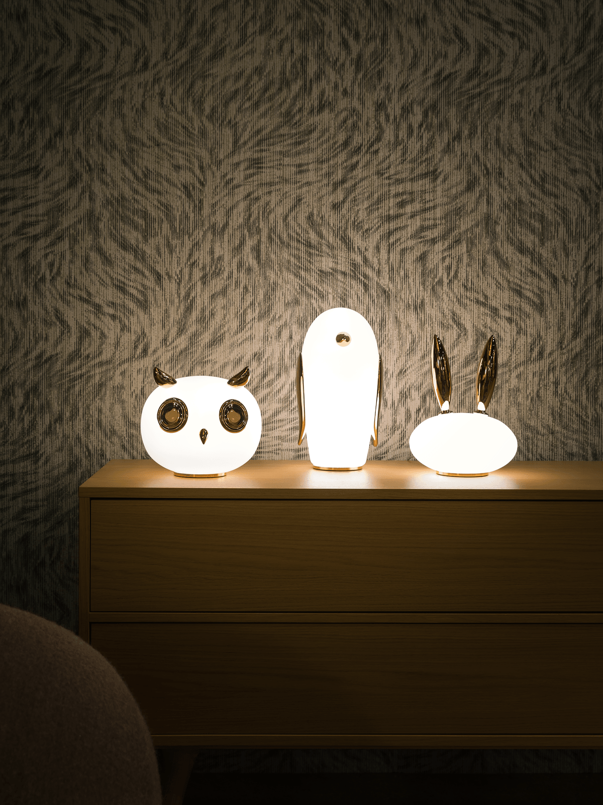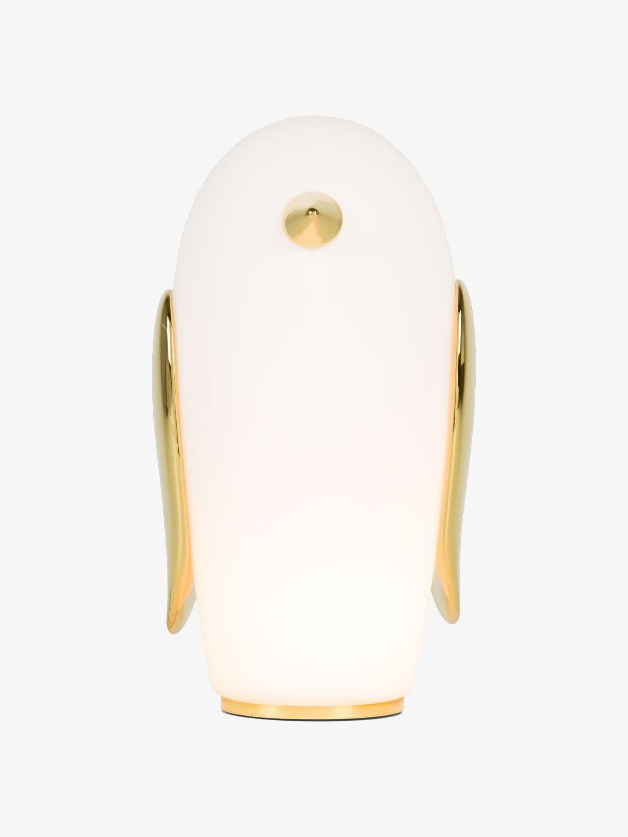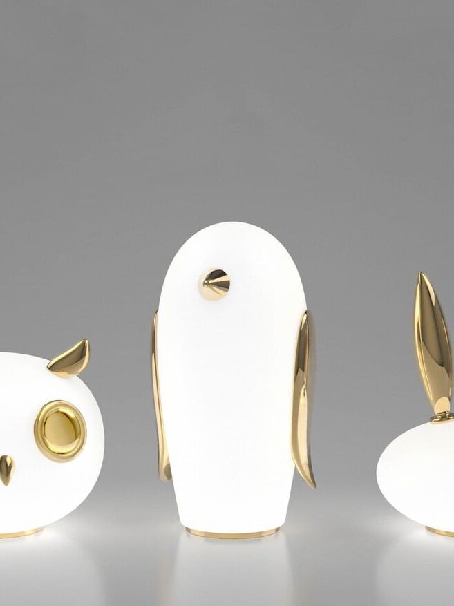 Uhuh, Purr & Noot Noot (Eule, Kaninchen & Pinguin) sind eine Reihe von Tischlampen in Tierform von Designern mit ganz eigenen Persönlichkeiten und Charakteristika. Rund, liebenswert und elegant finden sie in jedem Raumklima und jeder Umgebung ihren Platz. Ihre mattierten Glaskörper, verziert mit einem Hauch von Gold, strahlen ein sonniges, herzerwärmendes Licht aus. Wählen Sie Ihre Lieblingsfiguren aus einem Pinguin, einem Kaninchen und einer Eule und genießen Sie ein Wunderland voller Märchenfiguren mit viel Charme!