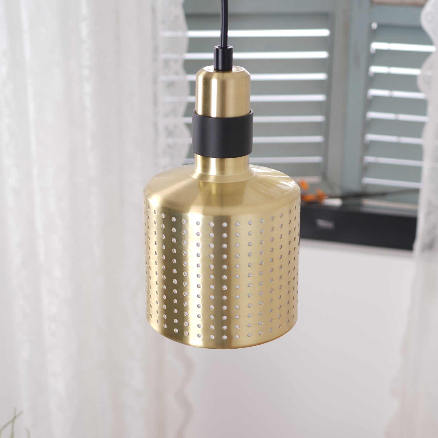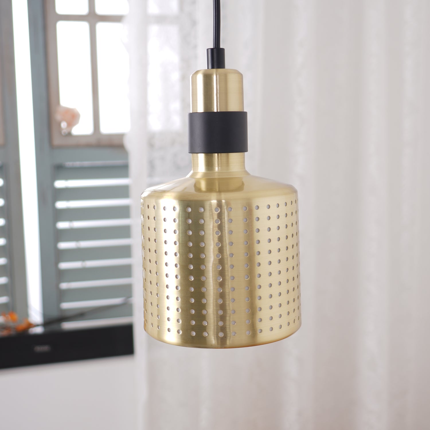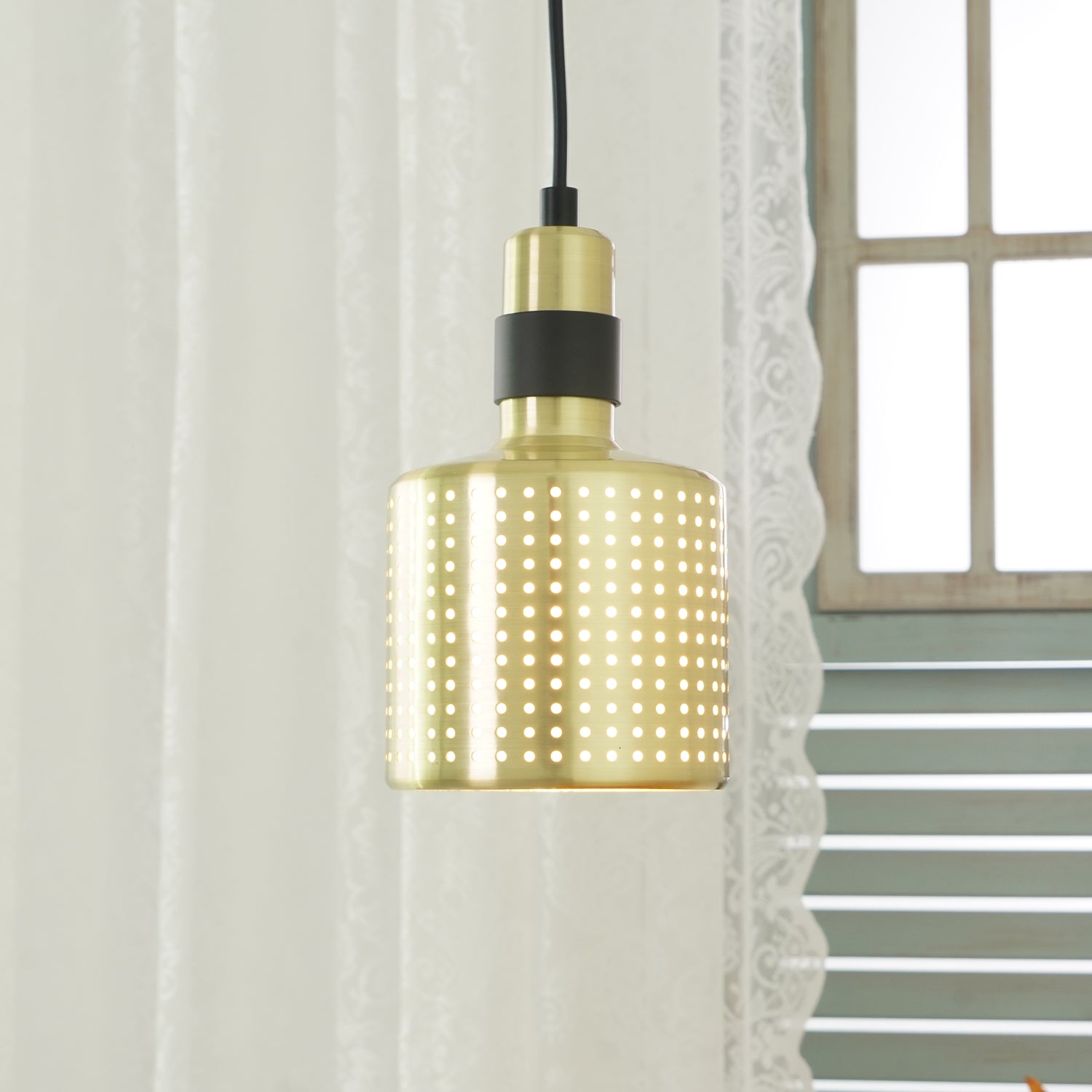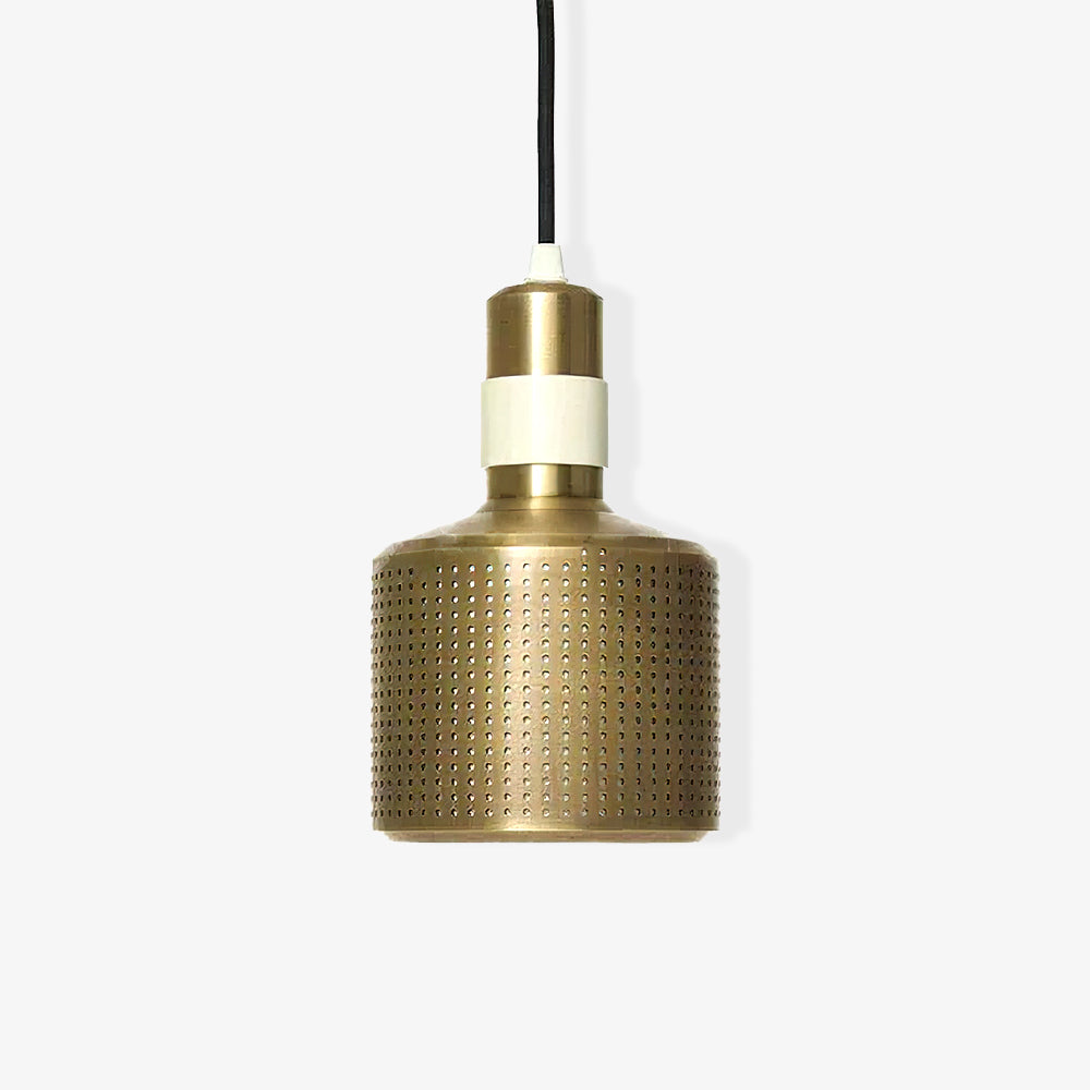 Die Riddle Pendelleuchte mit einem perforierten, maschinell bearbeiteten Metallschirm und einem Stoffeinsatz strahlt ein sanftes, warmes Licht aus. Das ideale Design, um es über einem Nachttisch, einer Kücheninsel oder einer Frühstücksbar zu positionieren.