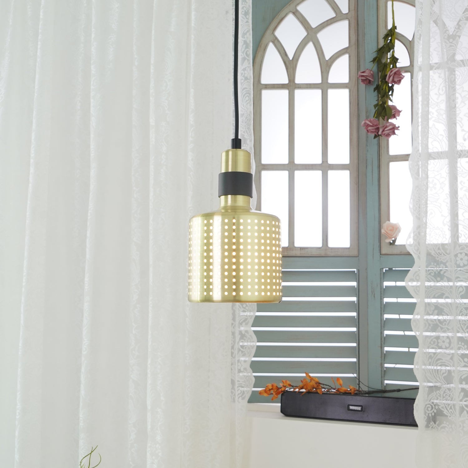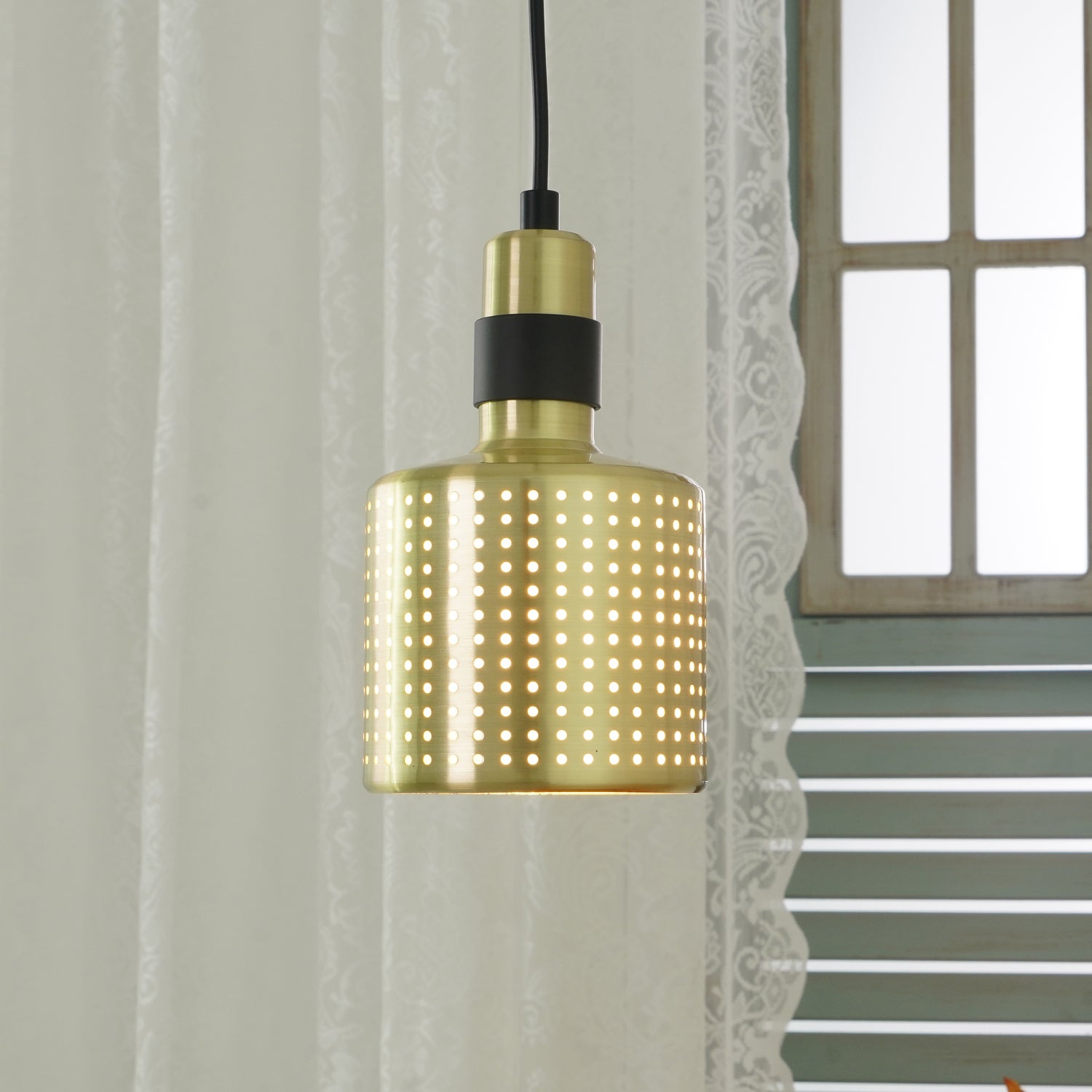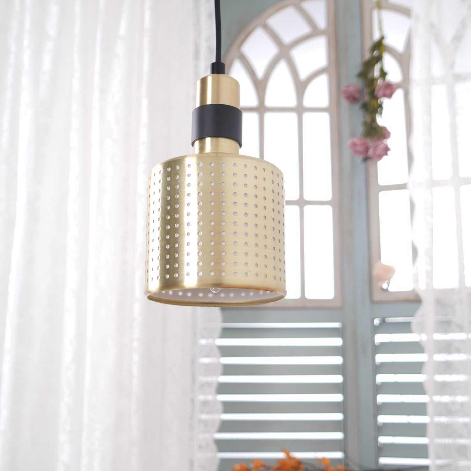 Die Riddle Pendelleuchte mit einem perforierten, maschinell bearbeiteten Metallschirm und einem Stoffeinsatz strahlt ein sanftes, warmes Licht aus. Das ideale Design, um es über einem Nachttisch, einer Kücheninsel oder einer Frühstücksbar zu positionieren.