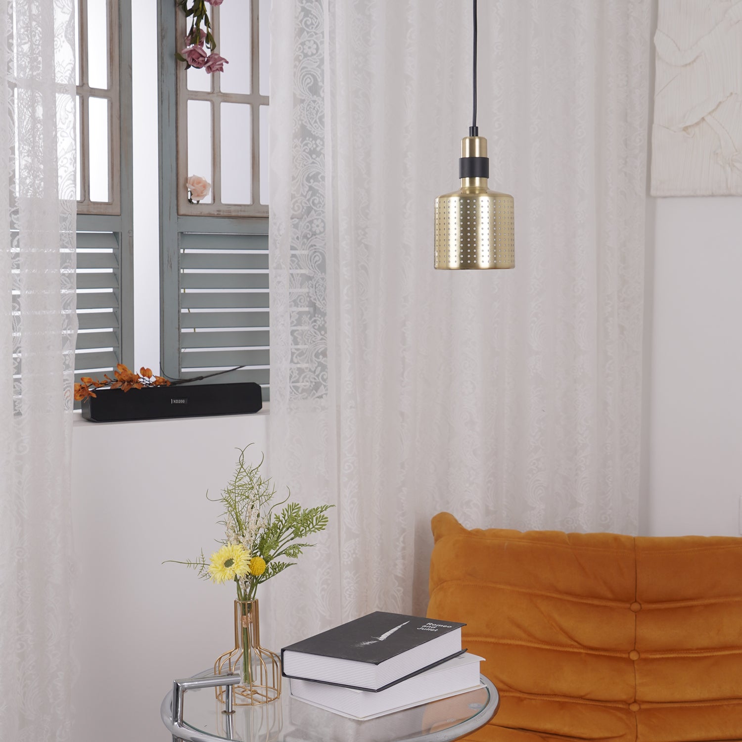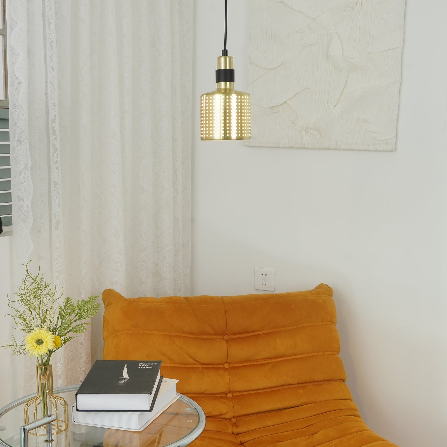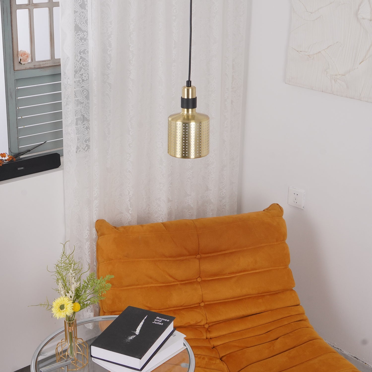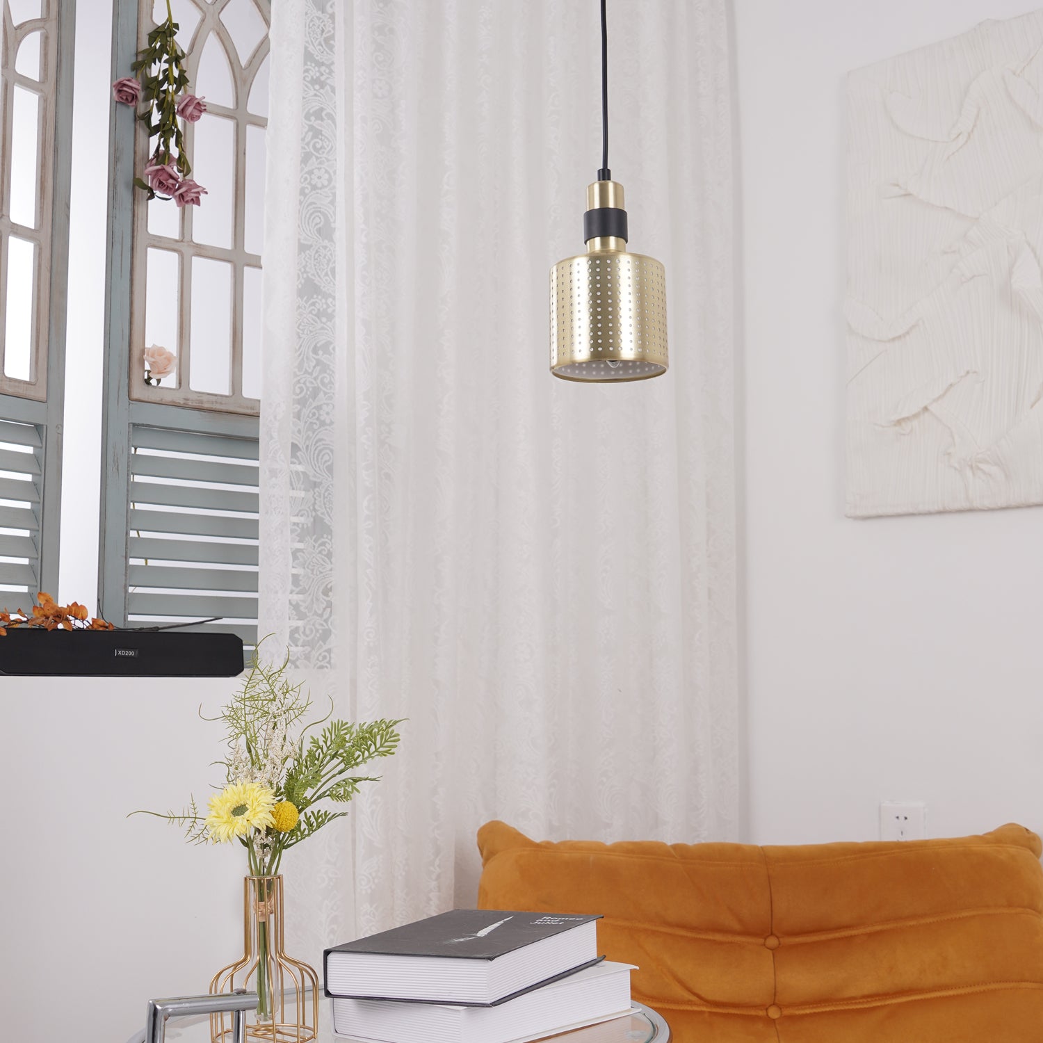 Die Riddle Pendelleuchte mit einem perforierten, maschinell bearbeiteten Metallschirm und einem Stoffeinsatz strahlt ein sanftes, warmes Licht aus. Das ideale Design, um es über einem Nachttisch, einer Kücheninsel oder einer Frühstücksbar zu positionieren.