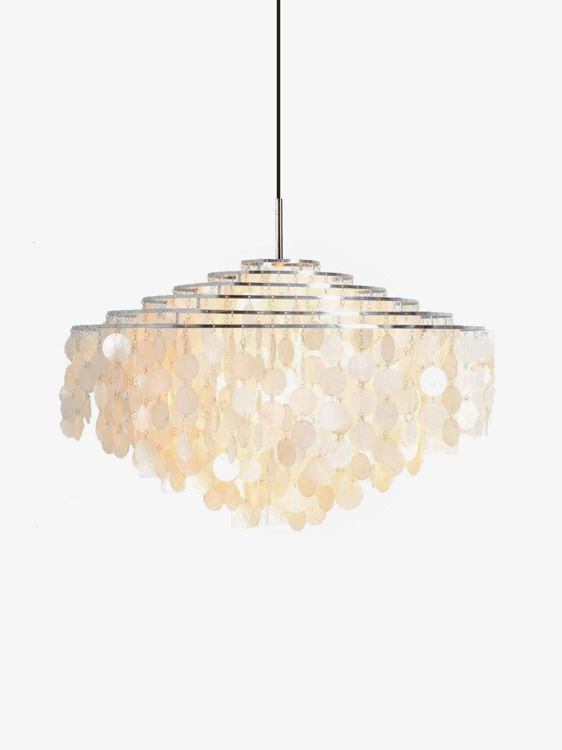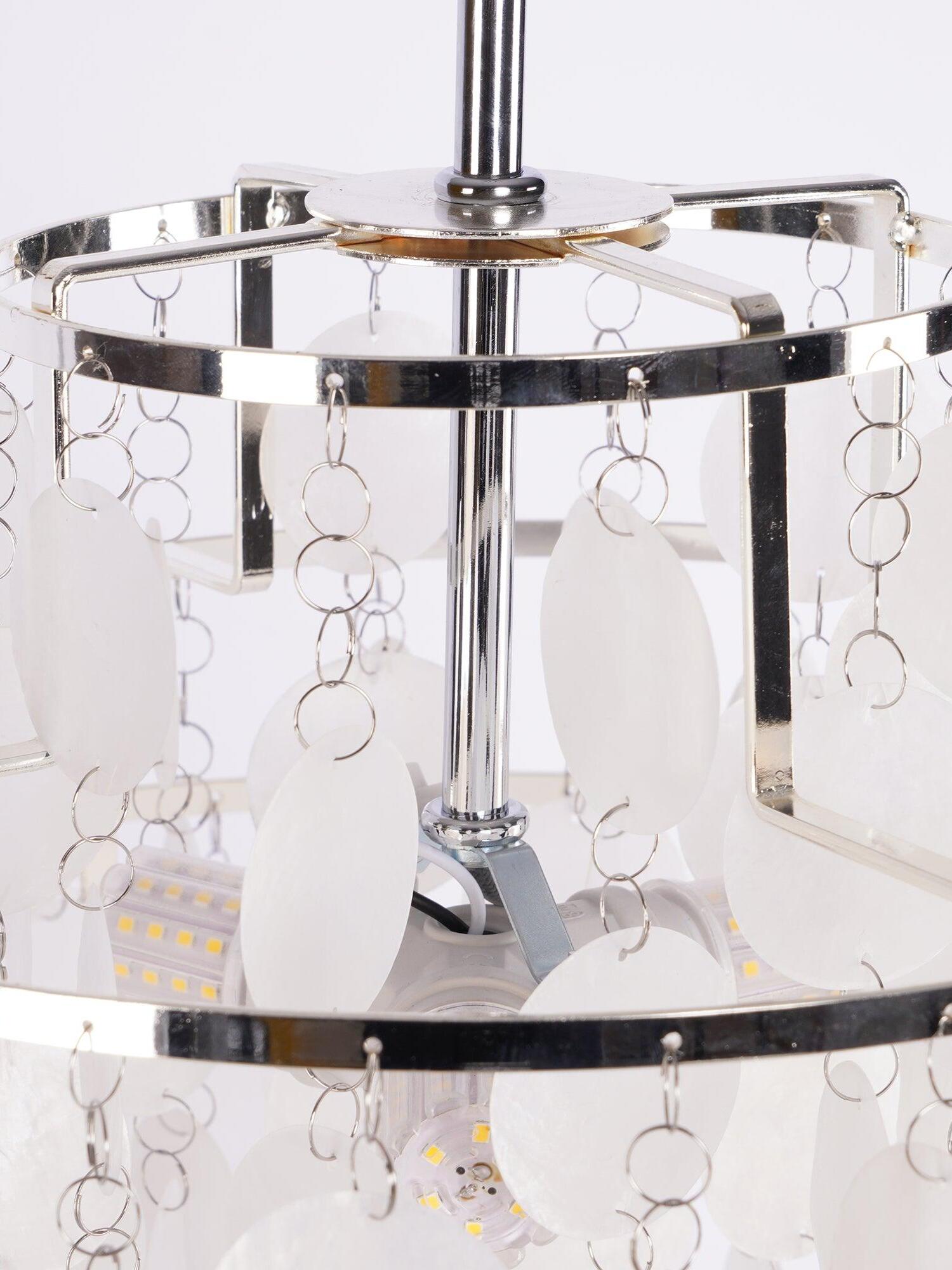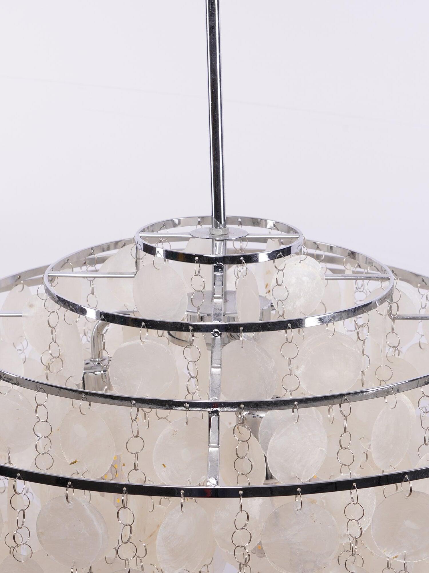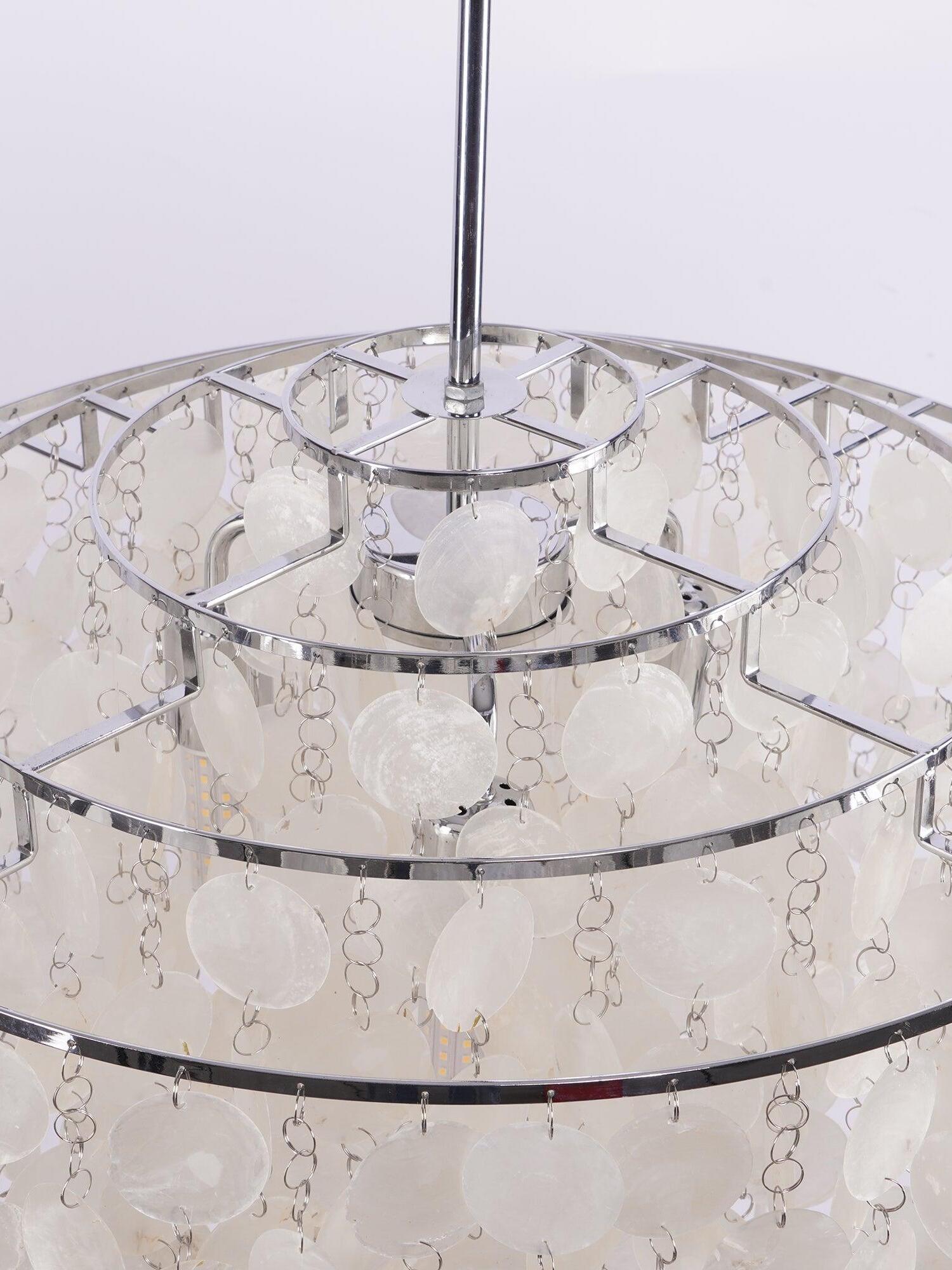 Der hochglänzende, verchromte Rahmen der FUN Shell Pendelleuchte verfügt über Metallringe unterschiedlicher Größen, die von oben nach unten zunehmen. An diesen Ringen hängen Schalen-Diskoketten in verschiedenen Längen. Die FUN Shell Pendelleuchte, deren durchscheinende Oberfläche als Lichtfilter und Reflexion wirkt. Decke und Wände werden in ein interessantes Spiel von Licht und Schatten getaucht.
