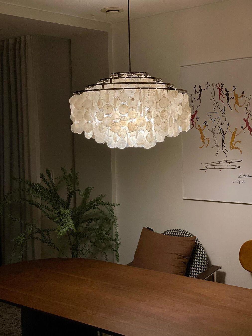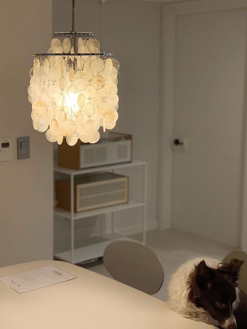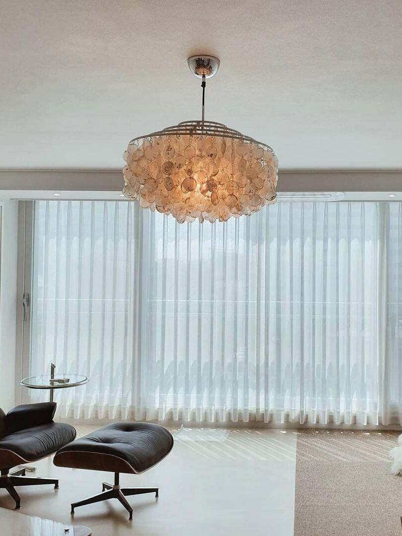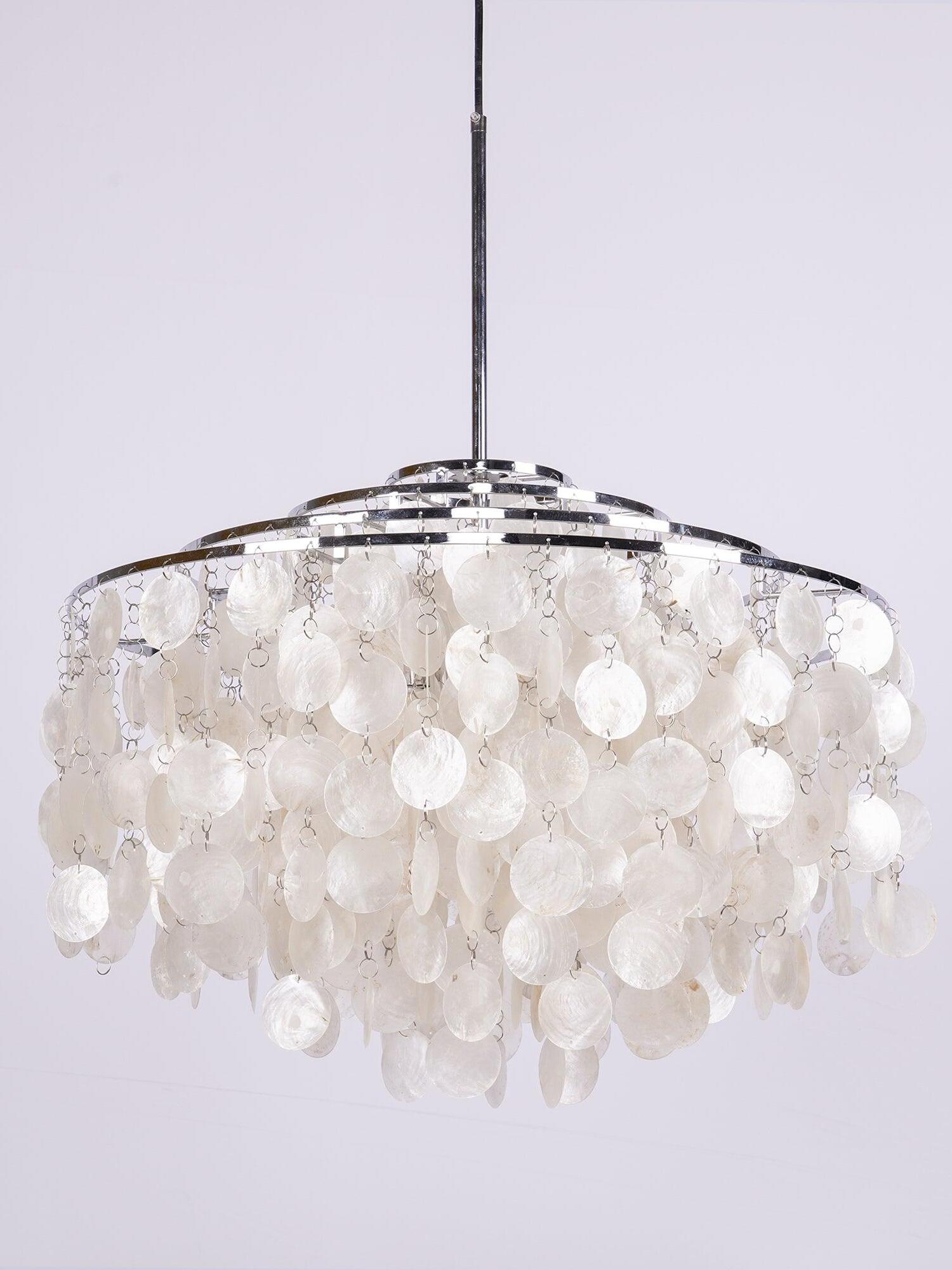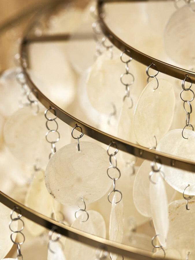 Der hochglänzende, verchromte Rahmen der FUN Shell Pendelleuchte verfügt über Metallringe unterschiedlicher Größen, die von oben nach unten zunehmen. An diesen Ringen hängen Schalen-Diskoketten in verschiedenen Längen. Die FUN Shell Pendelleuchte, deren durchscheinende Oberfläche als Lichtfilter und Reflexion wirkt. Decke und Wände werden in ein interessantes Spiel von Licht und Schatten getaucht.
