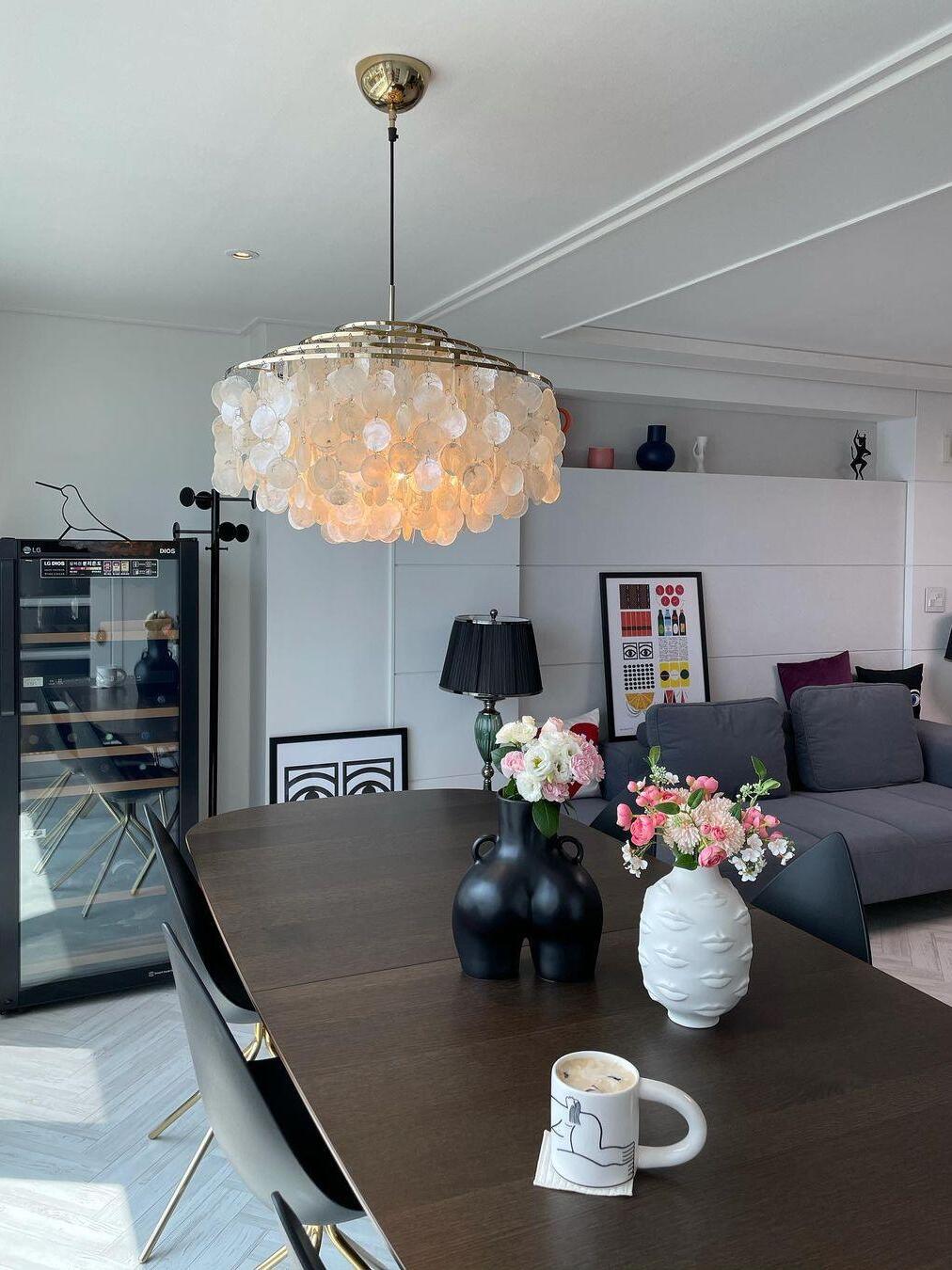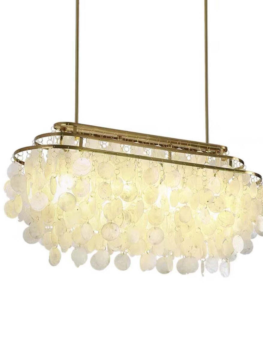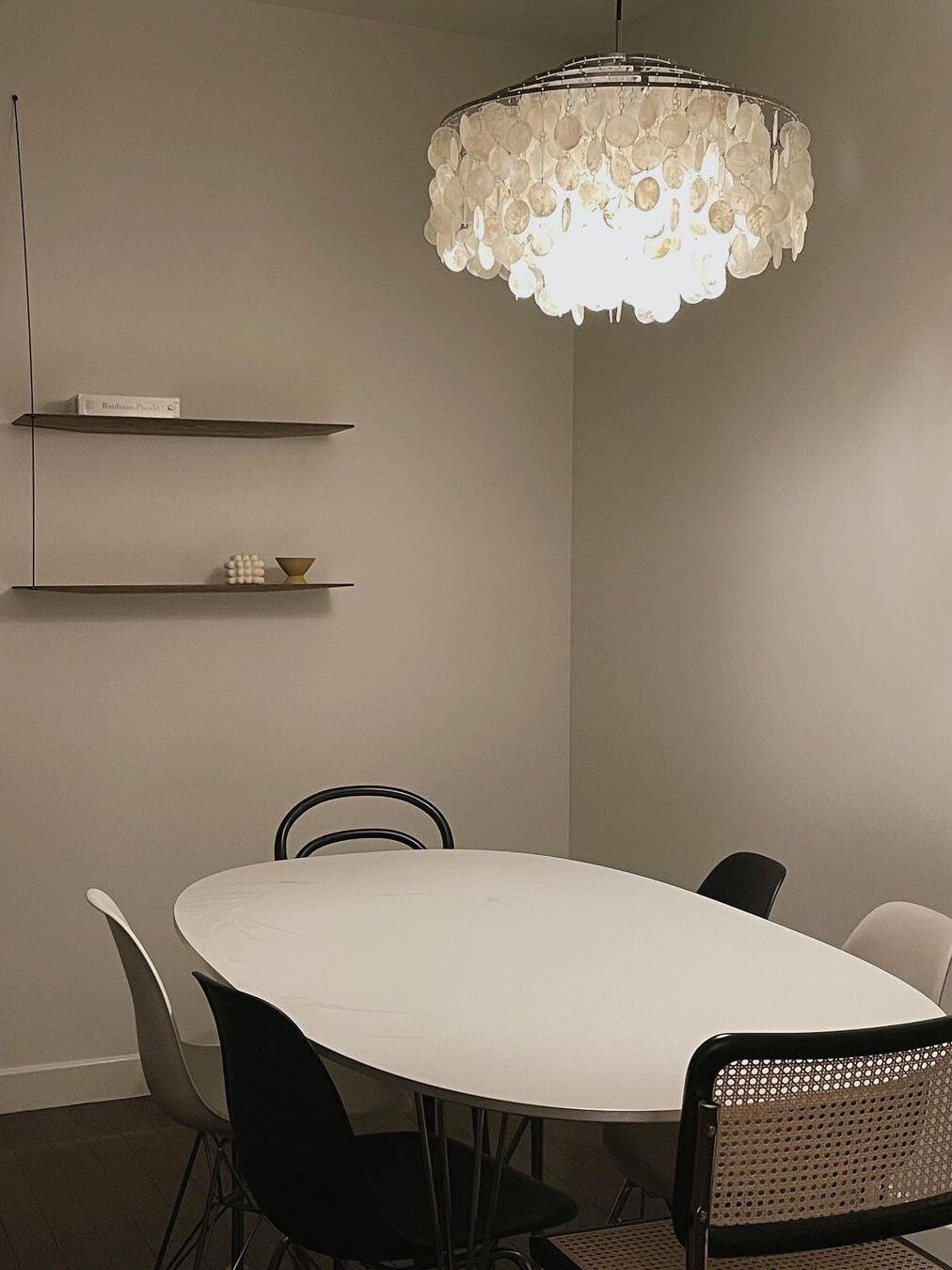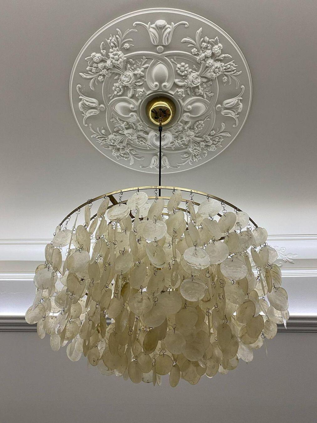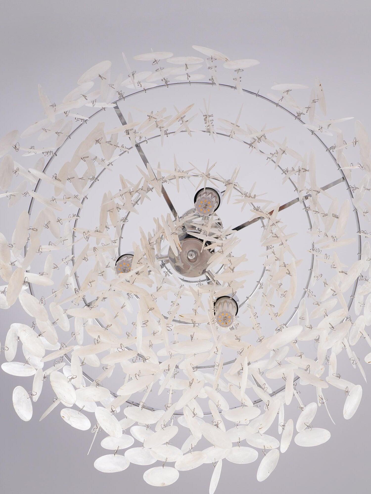 Der hochglänzende, verchromte Rahmen der FUN Shell Pendelleuchte verfügt über Metallringe unterschiedlicher Größen, die von oben nach unten zunehmen. An diesen Ringen hängen Schalen-Diskoketten in verschiedenen Längen. Die FUN Shell Pendelleuchte, deren durchscheinende Oberfläche als Lichtfilter und Reflexion wirkt. Decke und Wände werden in ein interessantes Spiel von Licht und Schatten getaucht.