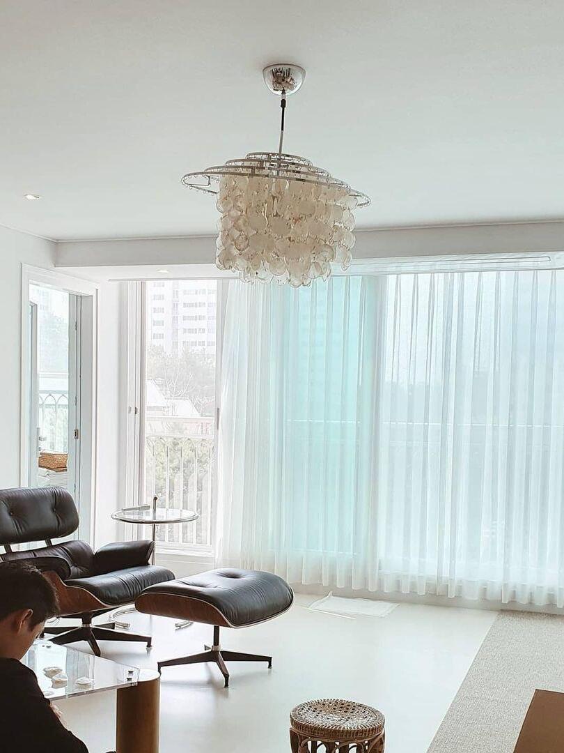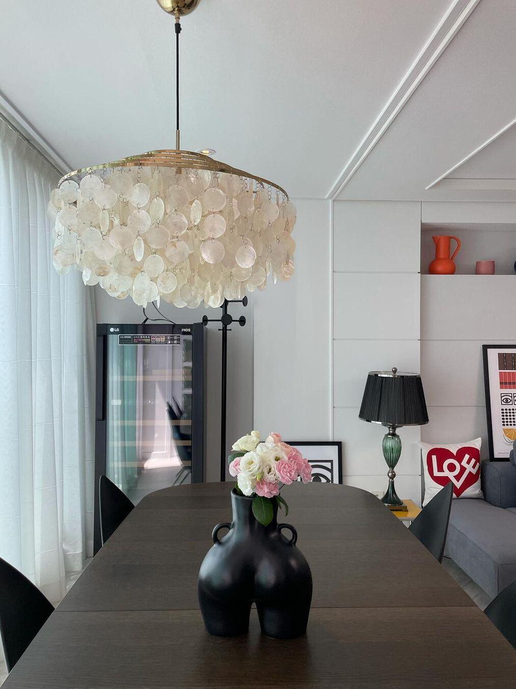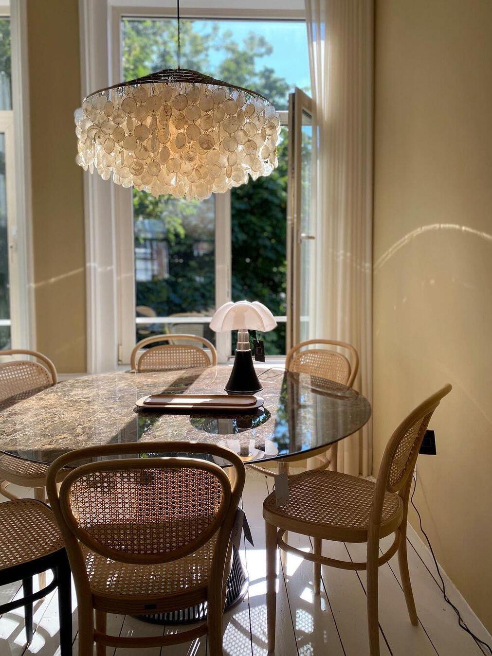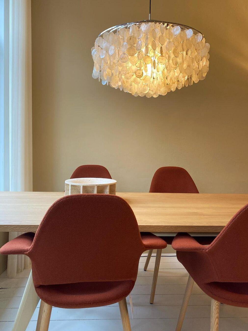 Der hochglänzende, verchromte Rahmen der FUN Shell Pendelleuchte verfügt über Metallringe unterschiedlicher Größen, die von oben nach unten zunehmen. An diesen Ringen hängen Schalen-Diskoketten in verschiedenen Längen. Die FUN Shell Pendelleuchte, deren durchscheinende Oberfläche als Lichtfilter und Reflexion wirkt. Decke und Wände werden in ein interessantes Spiel von Licht und Schatten getaucht.