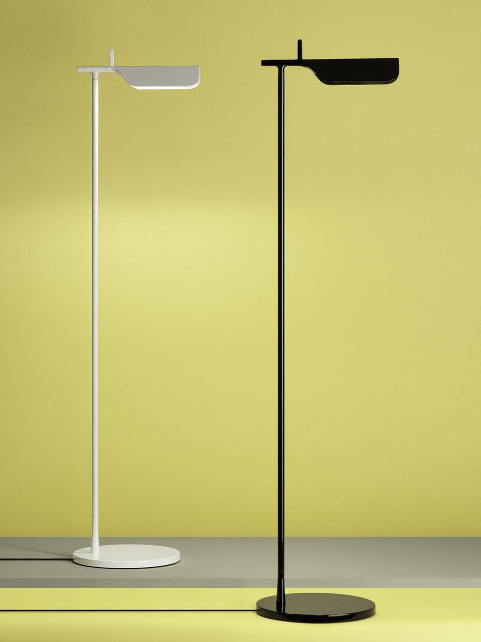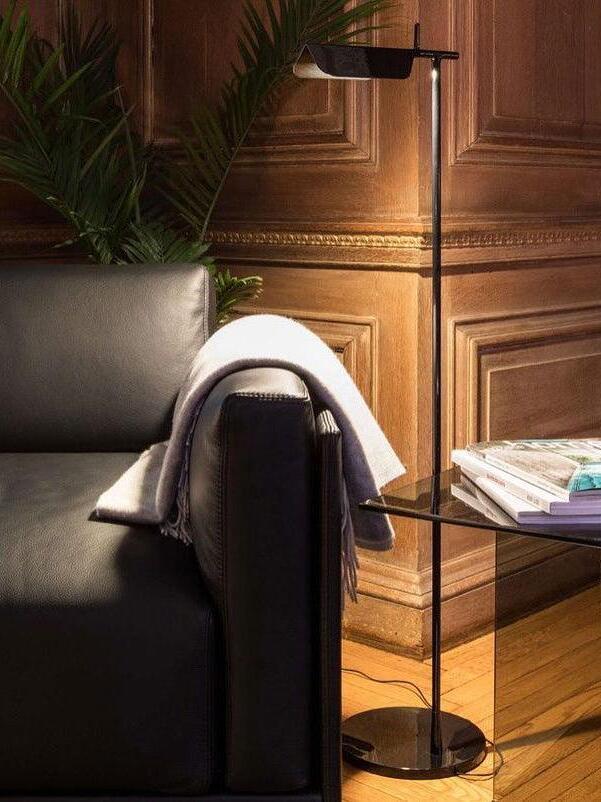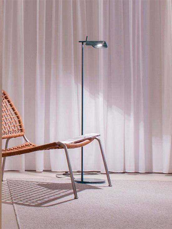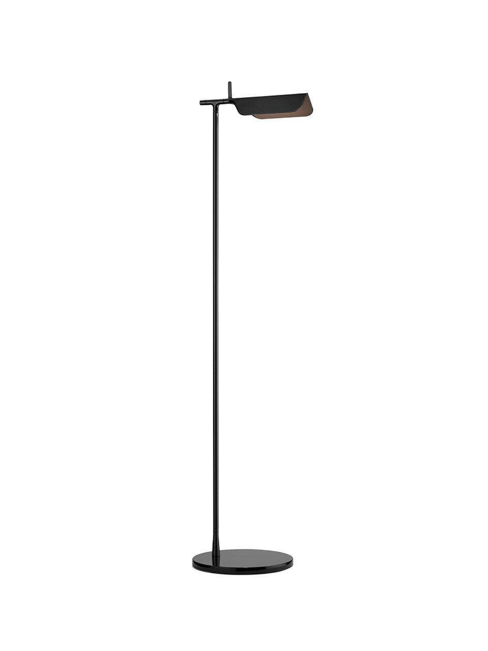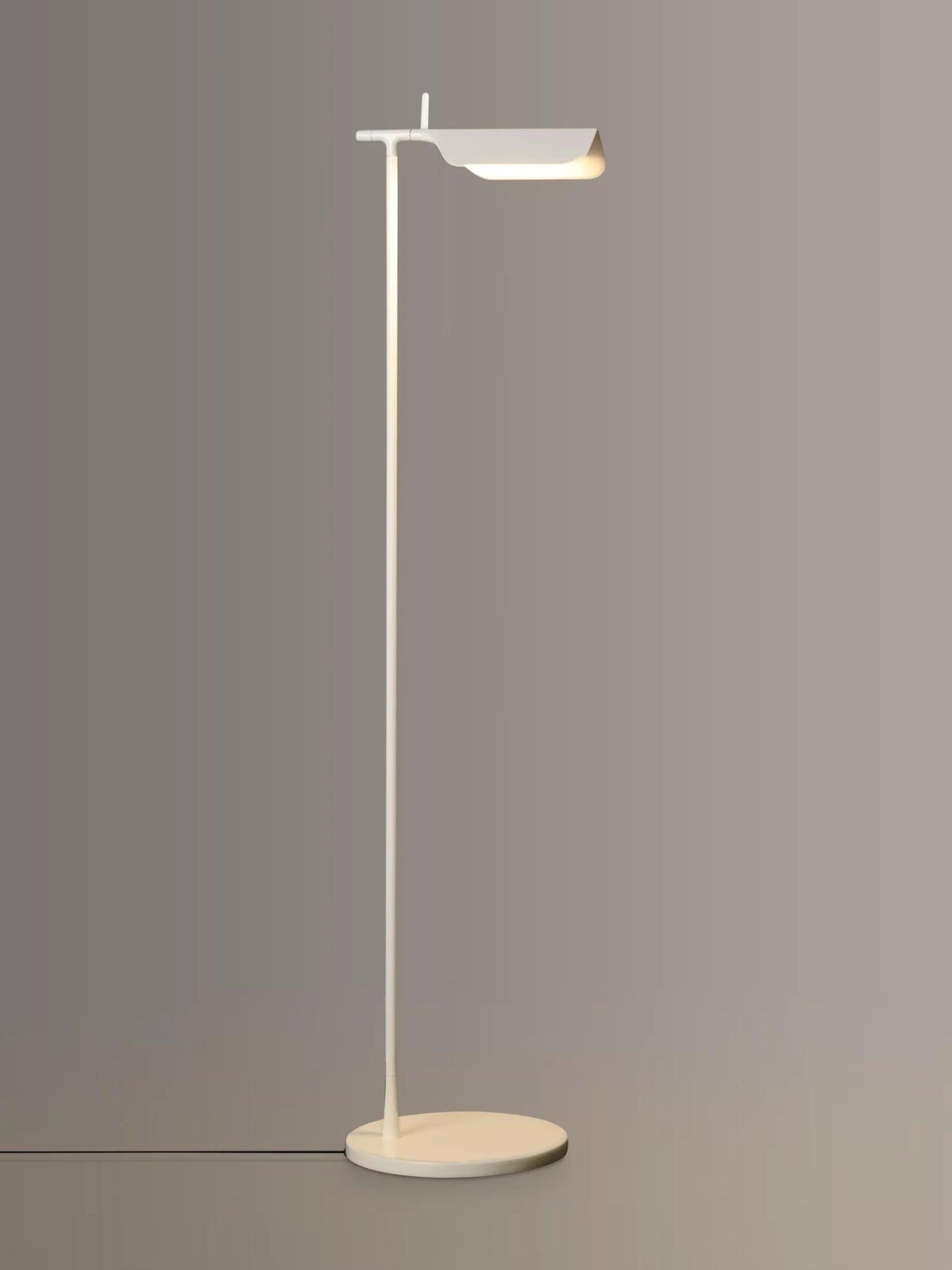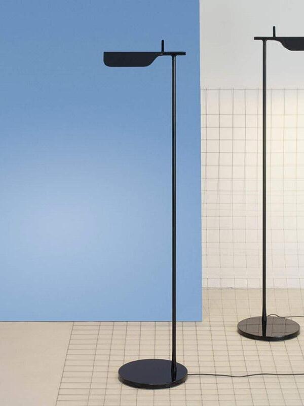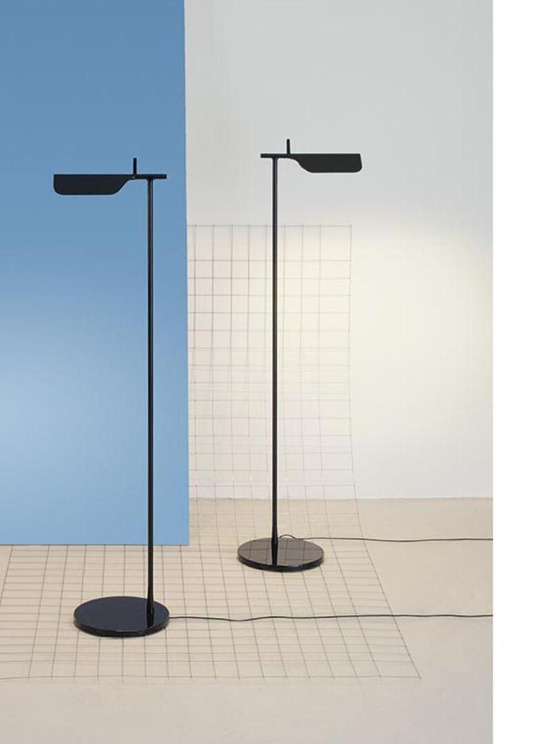 Die Tab-Stehleuchte verfügt über einen scheibenförmigen Sockel, eine säulenförmige Stütze und eine schwenkbare Haube aus Aluminiumdruckguss. Die einfache dreieckige, gefaltete Haube der Tab-Stehleuchte mit einer aufrechten „Lasche“ ermöglicht es dem Benutzer, den Diffusor auf verschiedene Arten zu schwenken, um das Licht auszurichten.