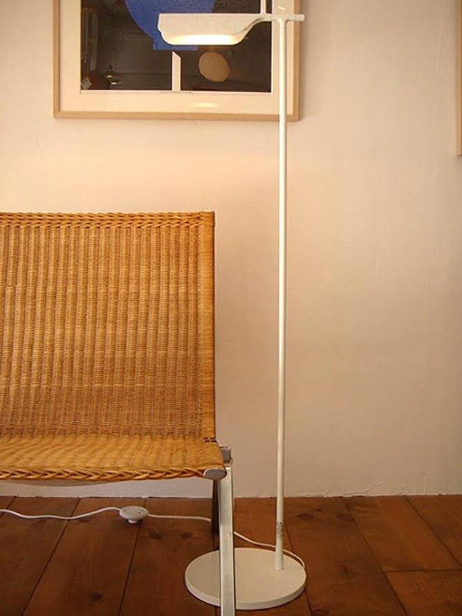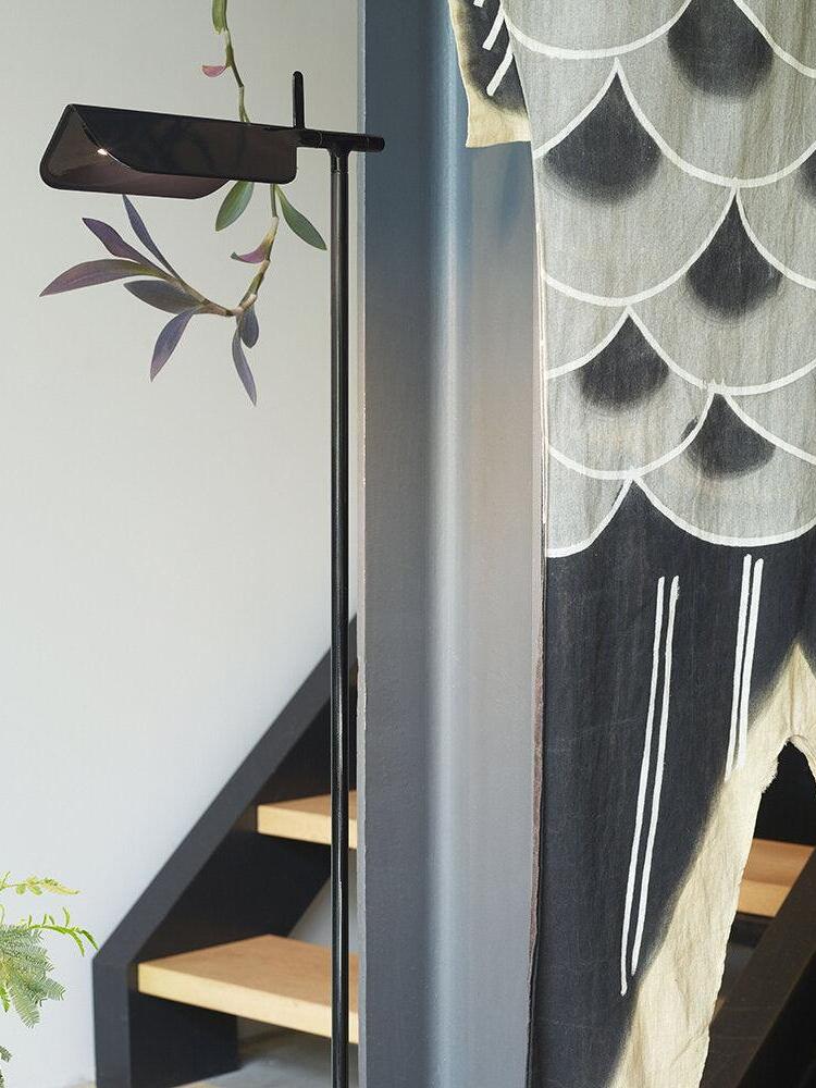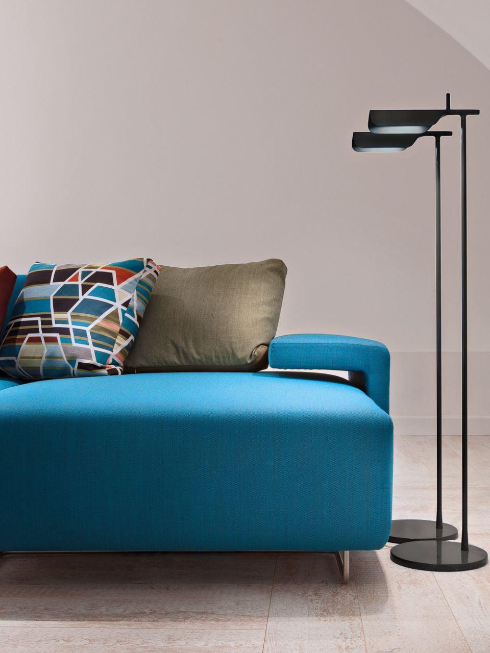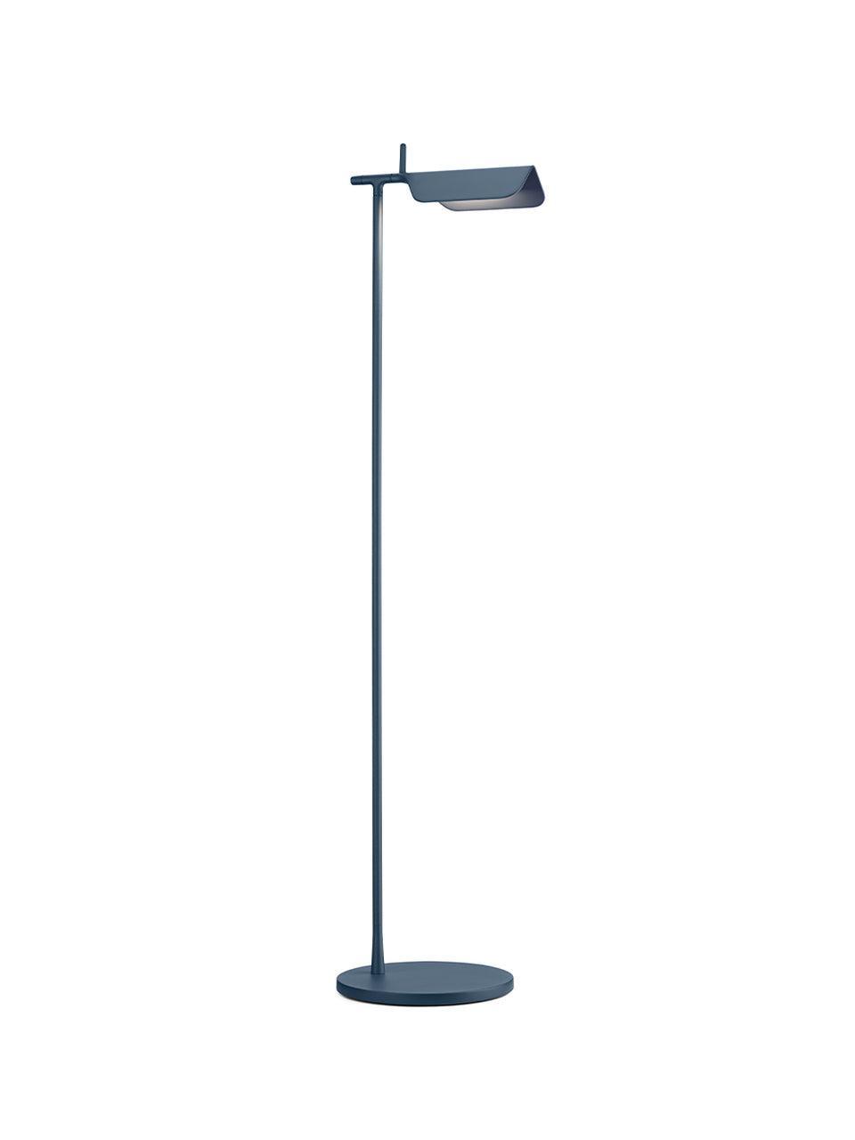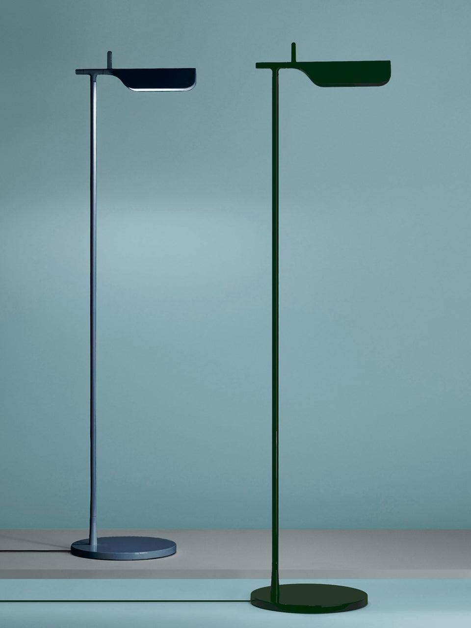 Die Tab-Stehleuchte verfügt über einen scheibenförmigen Sockel, eine säulenförmige Stütze und eine schwenkbare Haube aus Aluminiumdruckguss. Die einfache dreieckige, gefaltete Haube der Tab-Stehleuchte mit einer aufrechten „Lasche“ ermöglicht es dem Benutzer, den Diffusor auf verschiedene Arten zu schwenken, um das Licht auszurichten.
