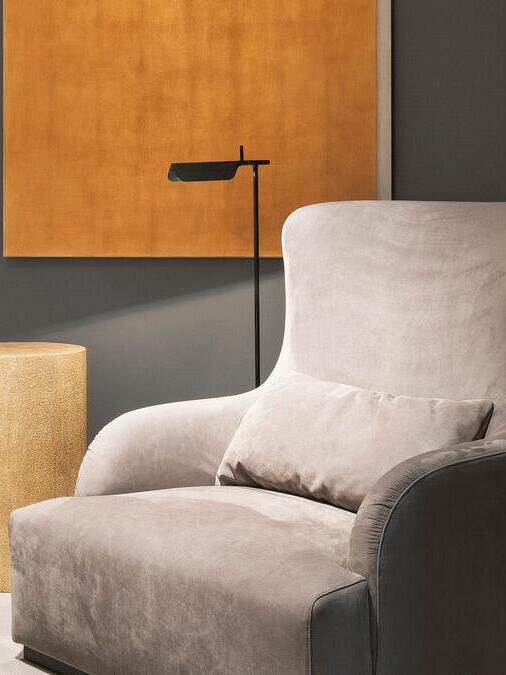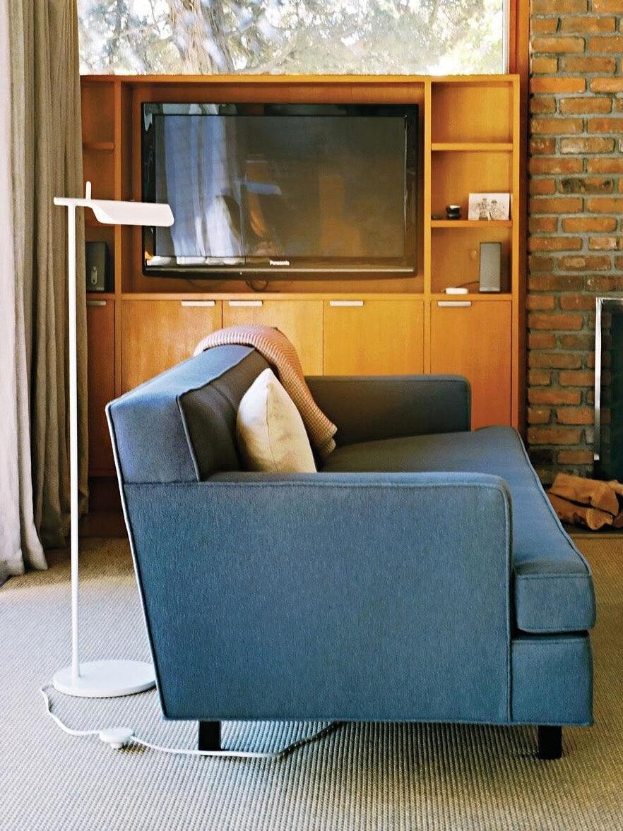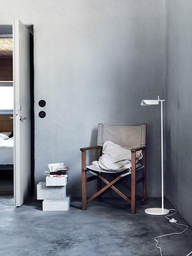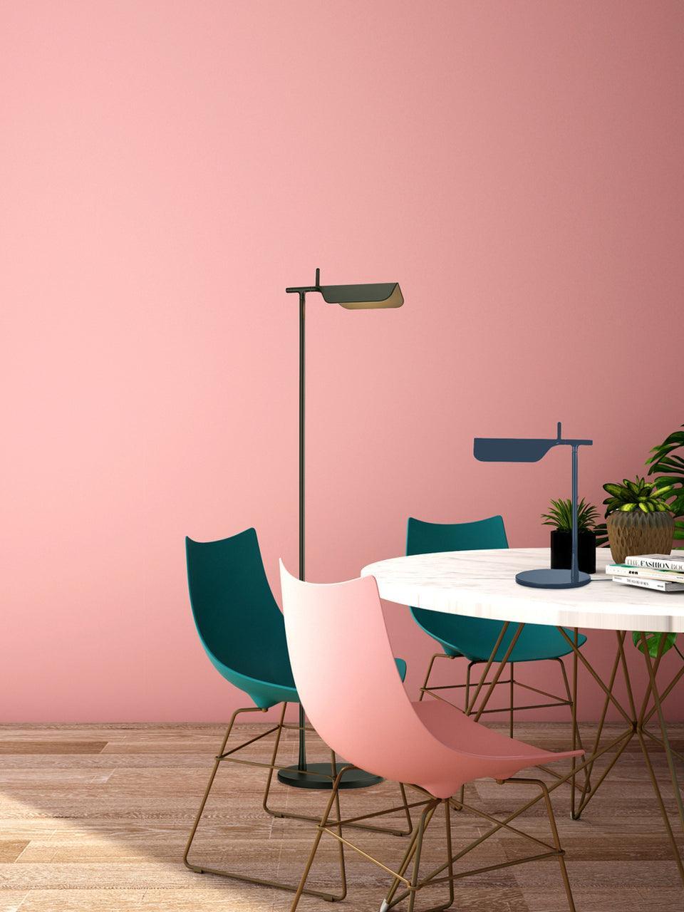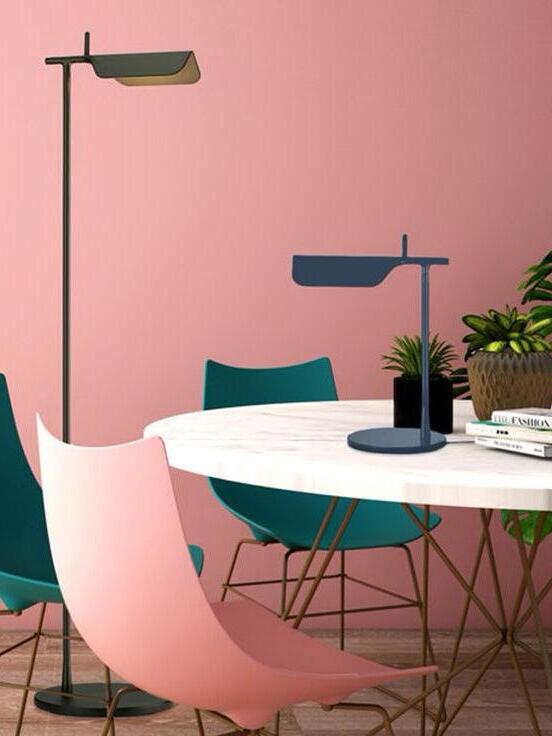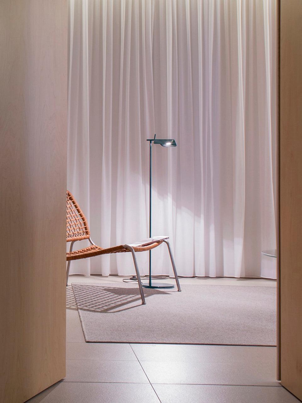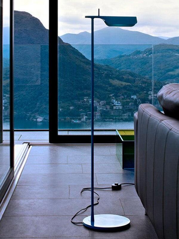 Die Tab-Stehleuchte verfügt über einen scheibenförmigen Sockel, eine säulenförmige Stütze und eine schwenkbare Haube aus Aluminiumdruckguss. Die einfache dreieckige, gefaltete Haube der Tab-Stehleuchte mit einer aufrechten „Lasche“ ermöglicht es dem Benutzer, den Diffusor auf verschiedene Arten zu schwenken, um das Licht auszurichten.