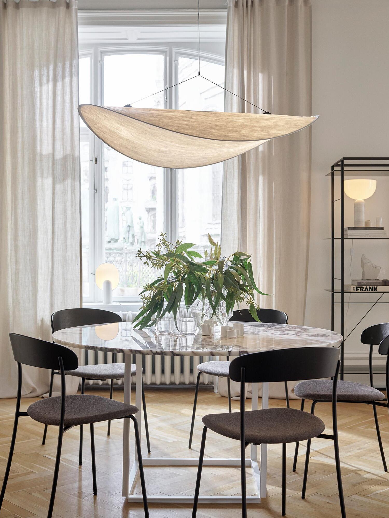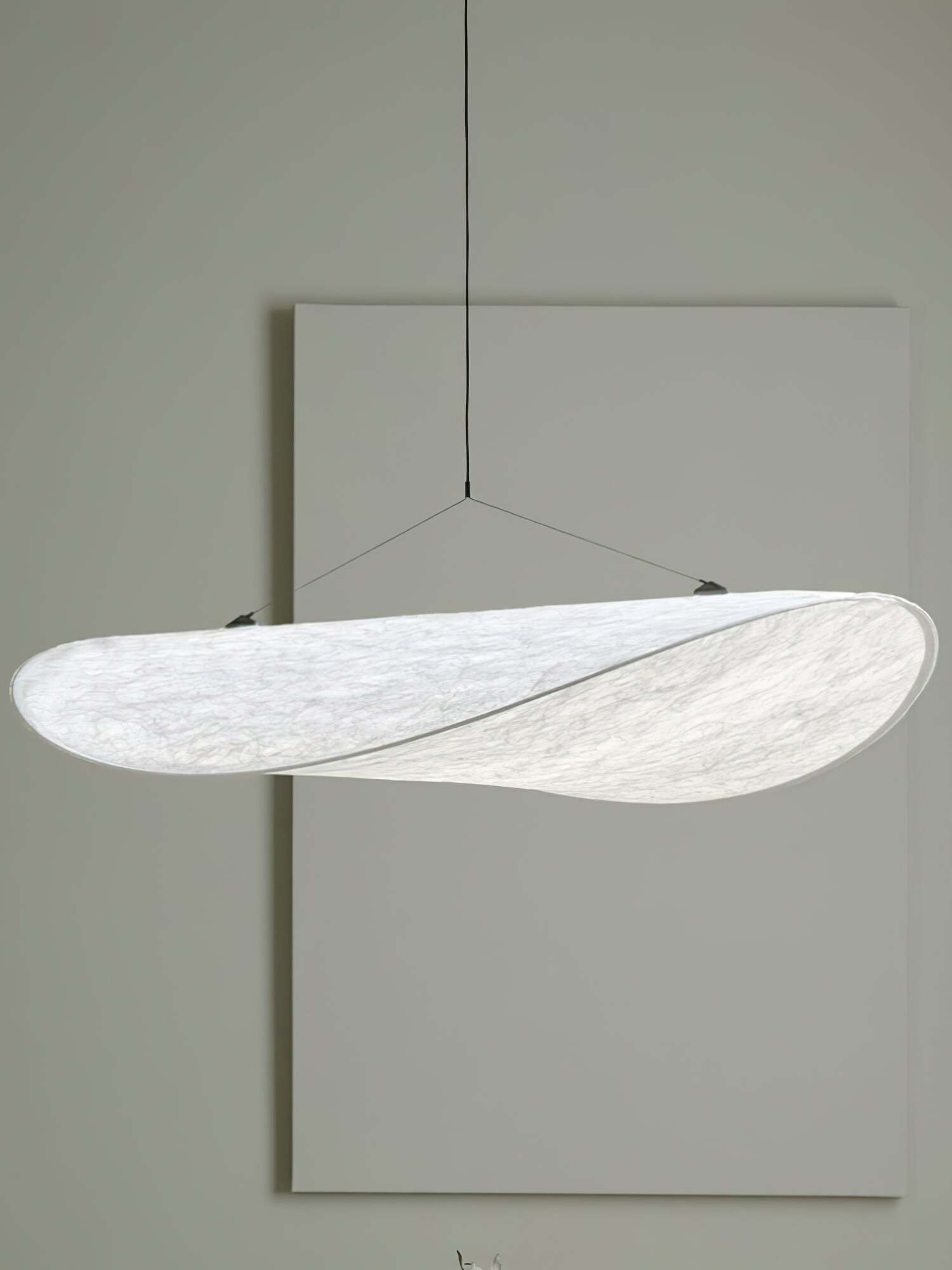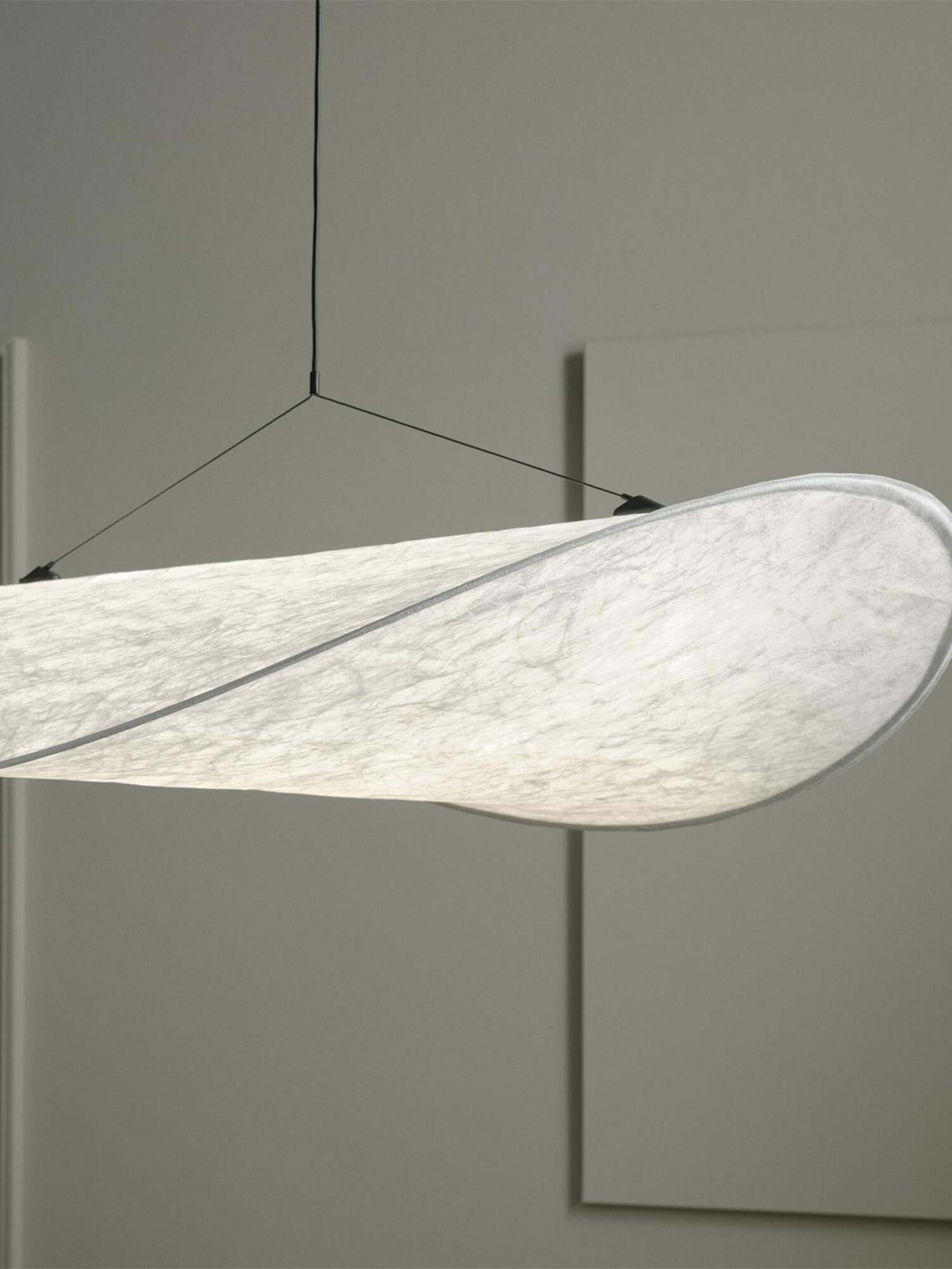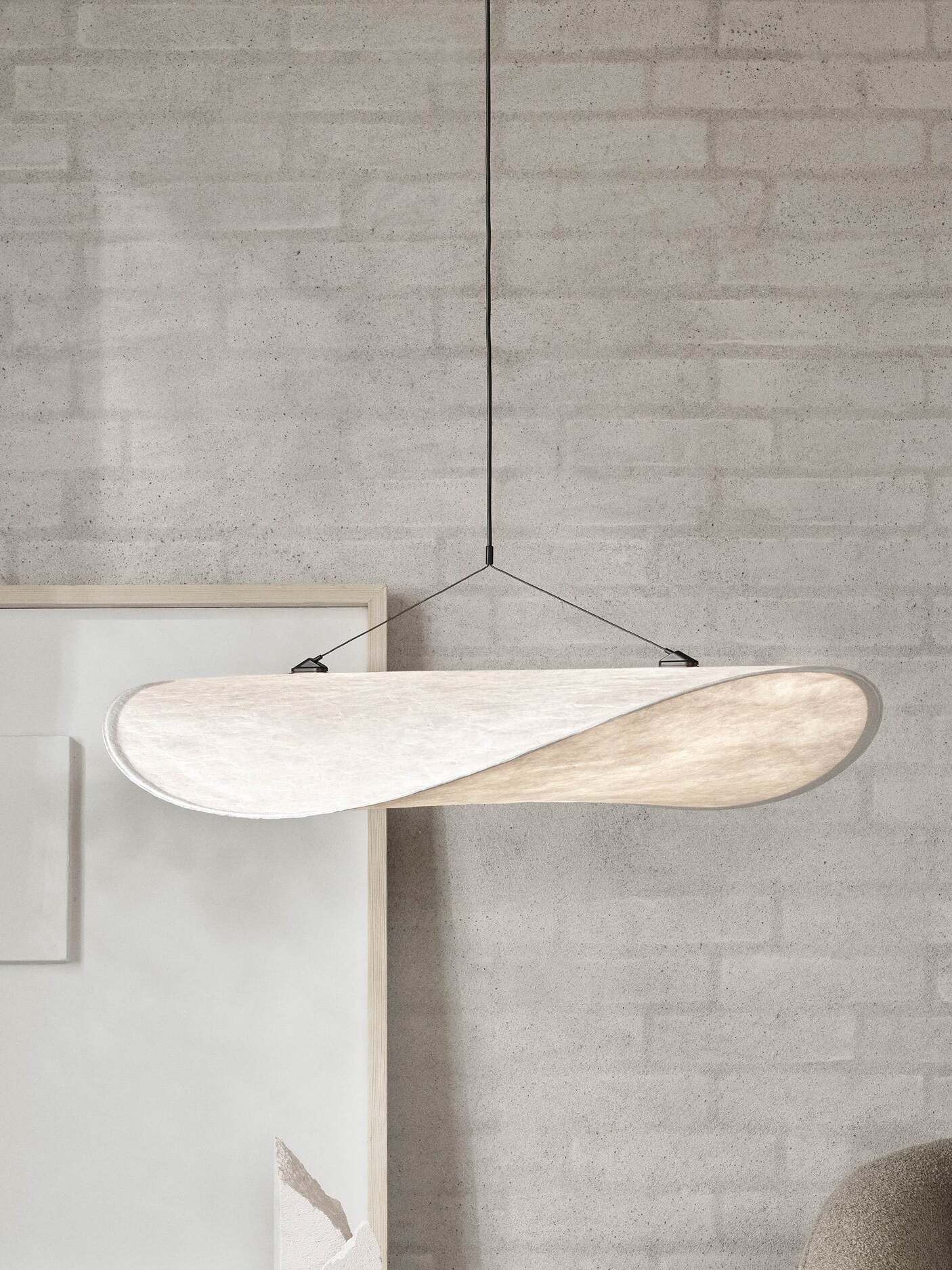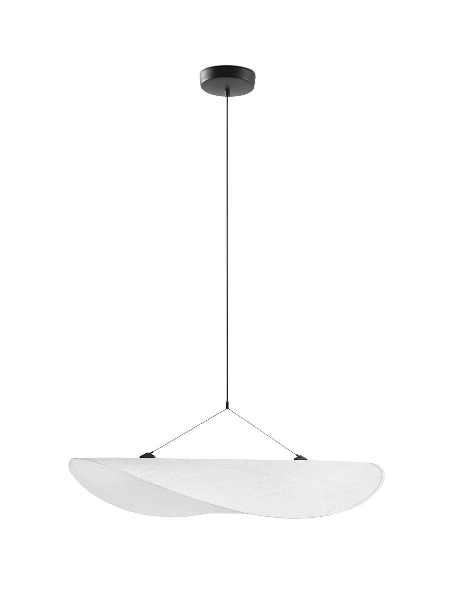 Mit einer Länge von 80 cm wirkt die TENSE Pendelleuchte wie eine sanfte Wolke, die schwebt. Der weiche Tyvek-Diffusor, eine wahrhaft moderne Konstruktion, ist ein langlebiges und dennoch sanftes Material, das zu 100 % recycelbar ist. Die Flexibilität dieses papierähnlichen Schirms ermöglicht es dem schlanken Rahmen, die wolkenartigen Eigenschaften der TENSE Pendelleuchte zu betonen. Die Leuchte ist mit einer schlanken LED-Lichtquelle ausgestattet, und alle Komponenten passen in eine schmale Box für einen einfachen Transport. Ein wirklich moderner Ansatz für Beleuchtung.