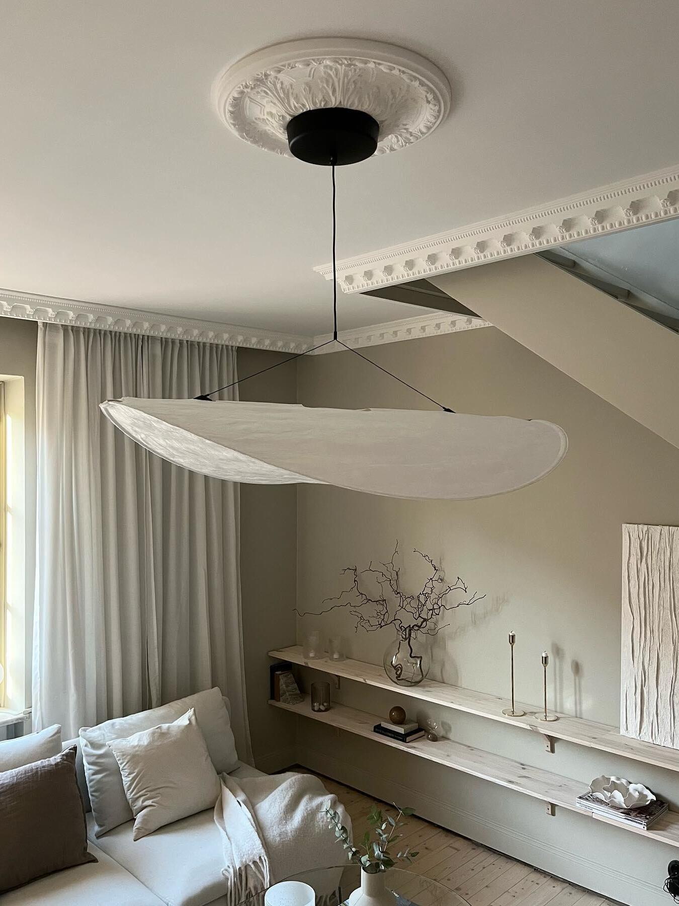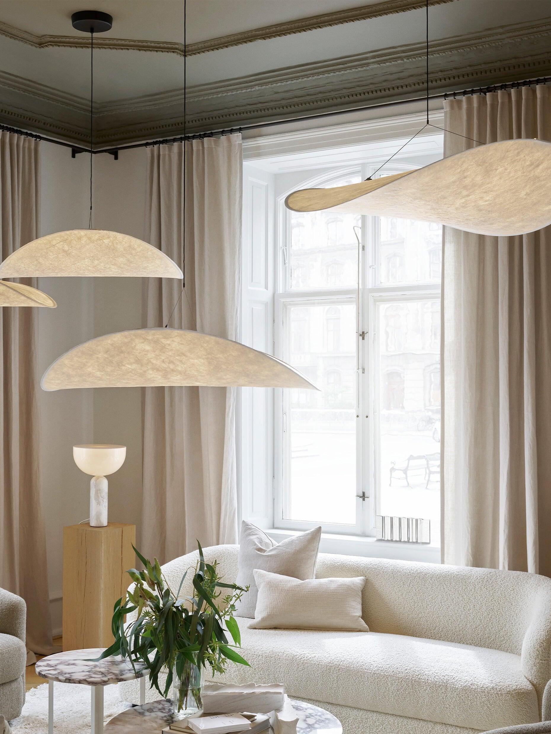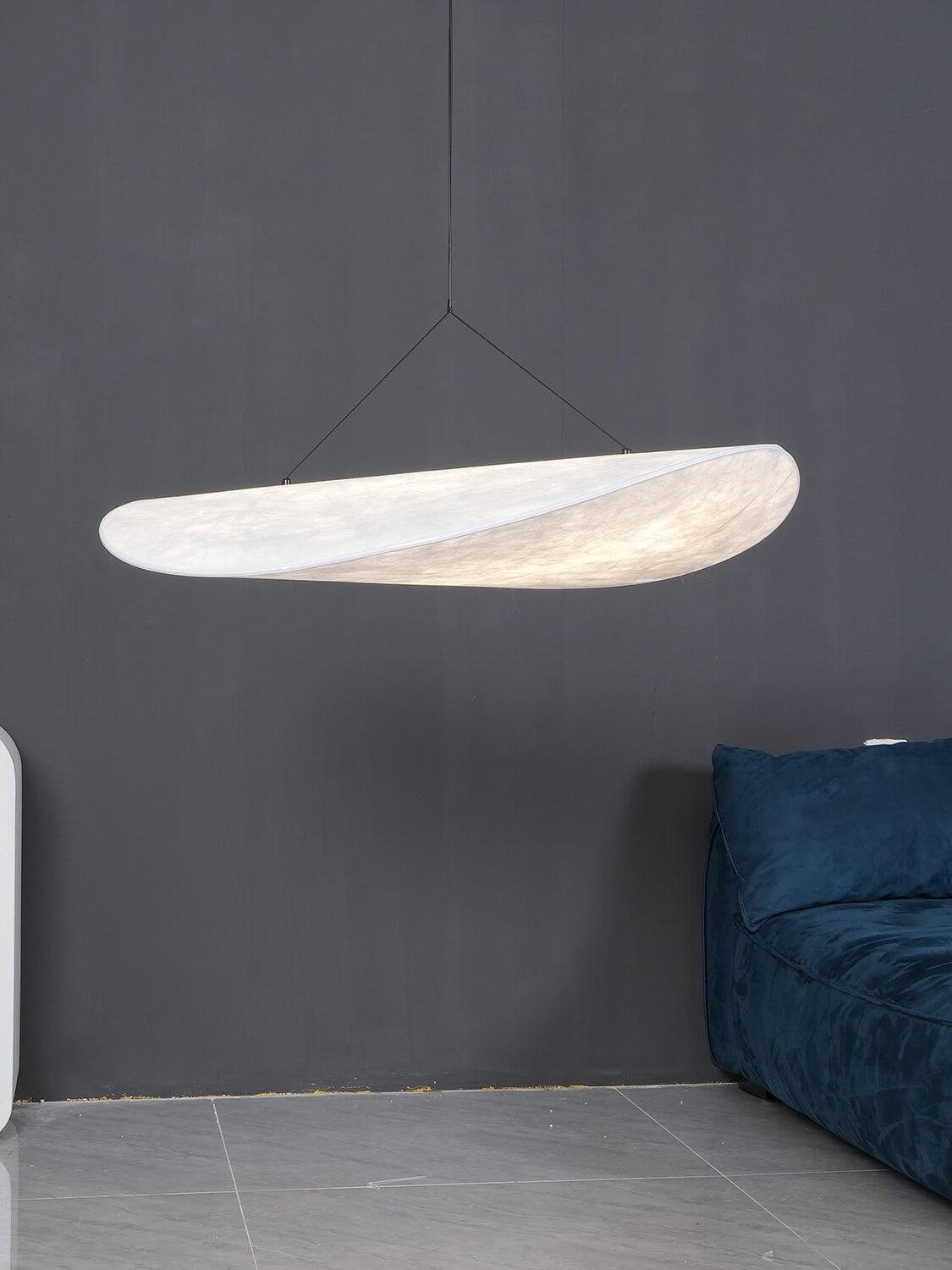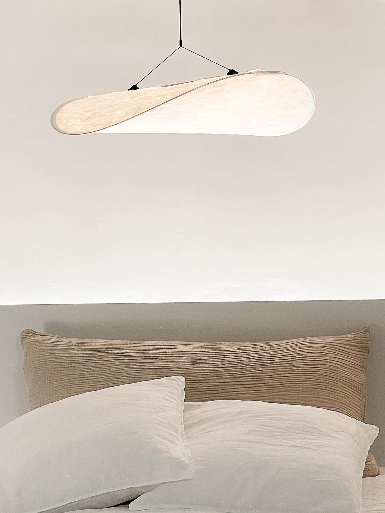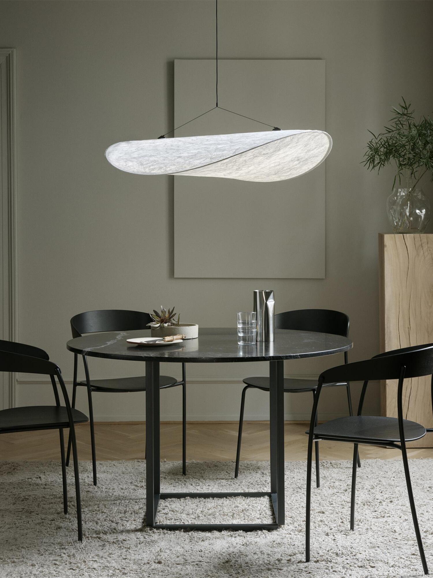 Mit einer Länge von 80 cm wirkt die TENSE Pendelleuchte wie eine sanfte Wolke, die schwebt. Der weiche Tyvek-Diffusor, eine wahrhaft moderne Konstruktion, ist ein langlebiges und dennoch sanftes Material, das zu 100 % recycelbar ist. Die Flexibilität dieses papierähnlichen Schirms ermöglicht es dem schlanken Rahmen, die wolkenartigen Eigenschaften der TENSE Pendelleuchte zu betonen. Die Leuchte ist mit einer schlanken LED-Lichtquelle ausgestattet, und alle Komponenten passen in eine schmale Box für einen einfachen Transport. Ein wirklich moderner Ansatz für Beleuchtung.