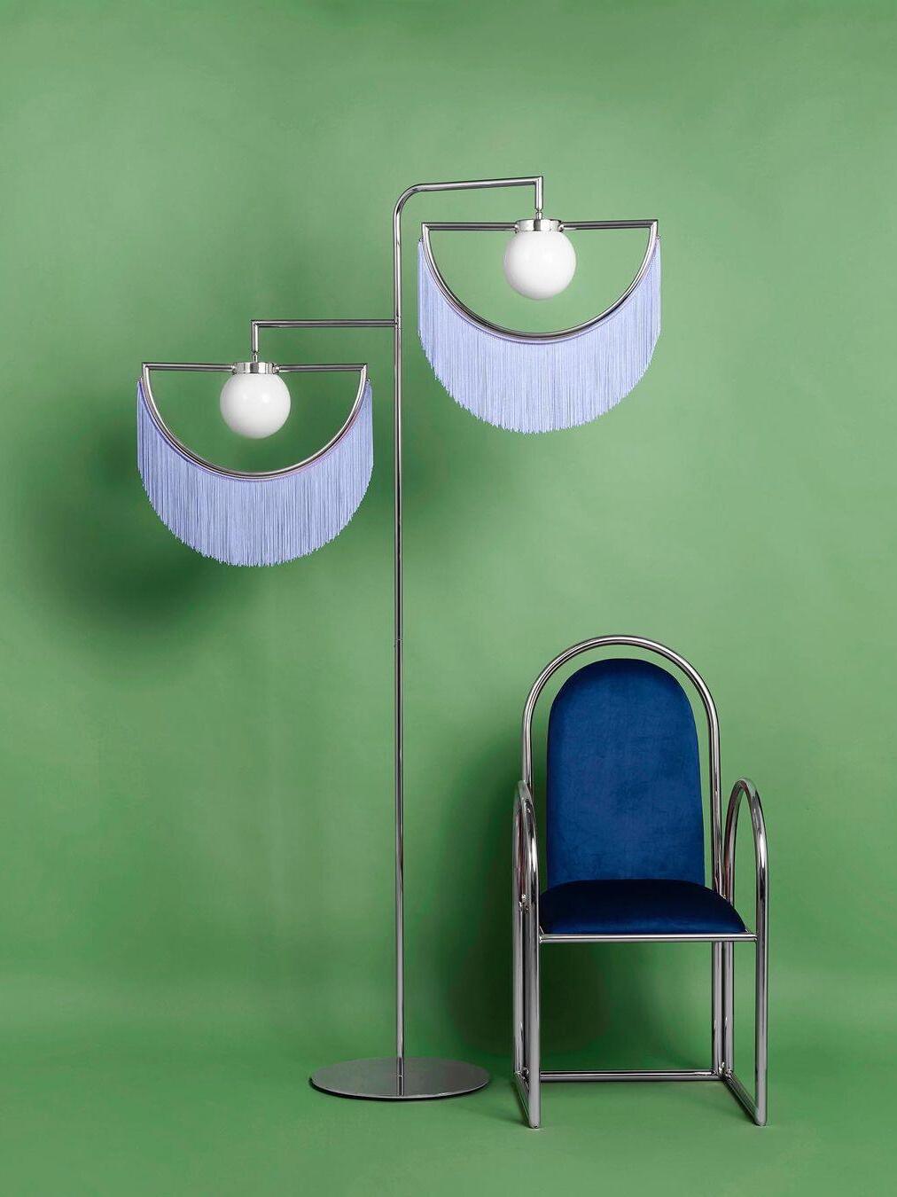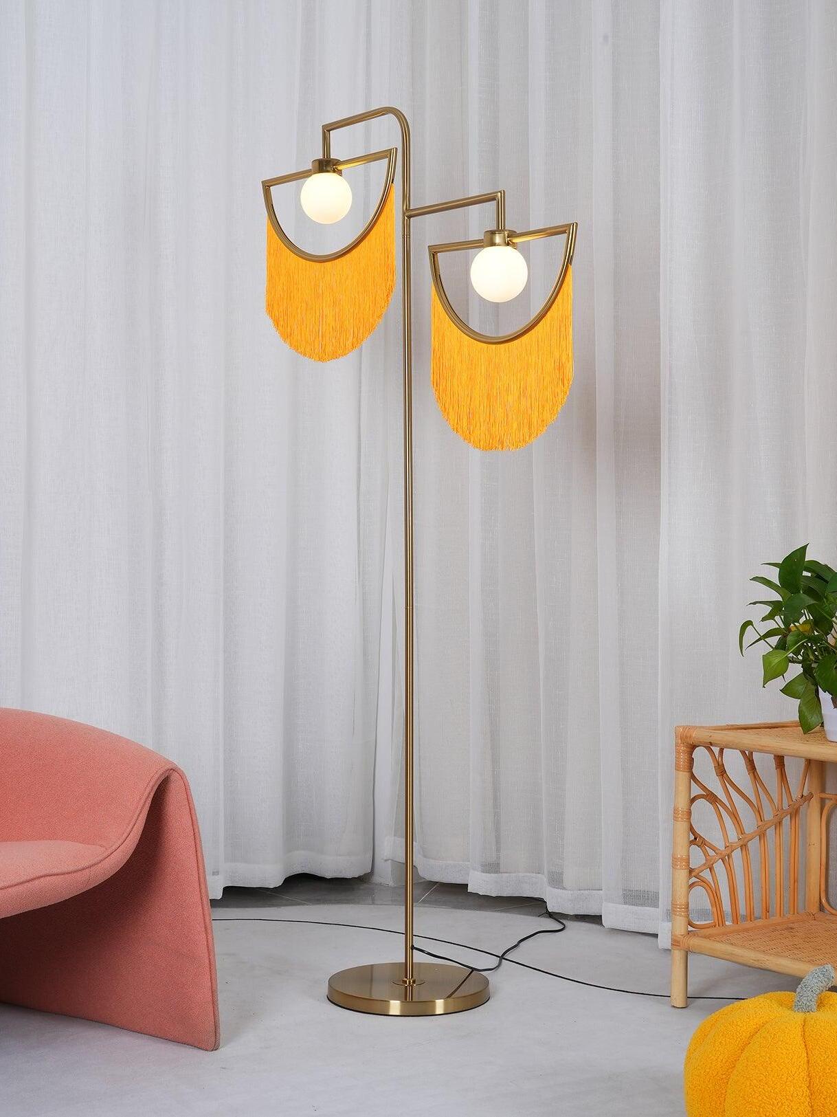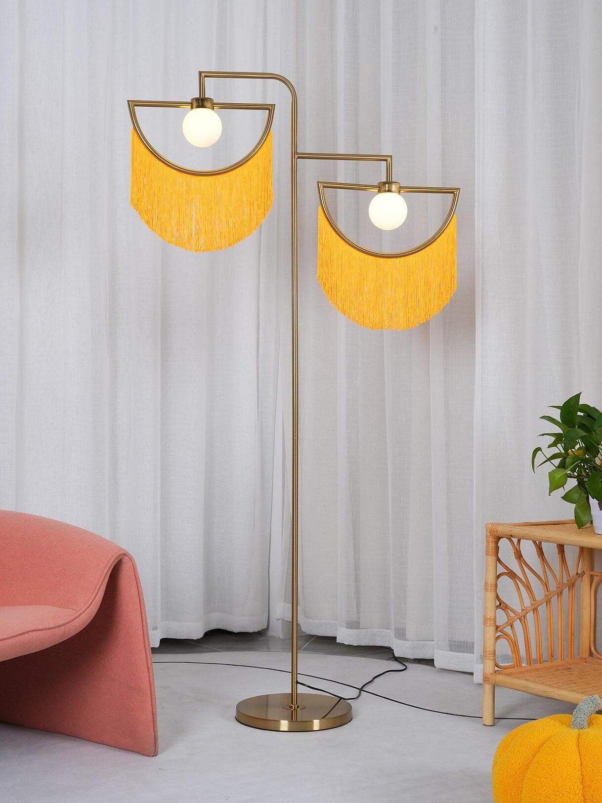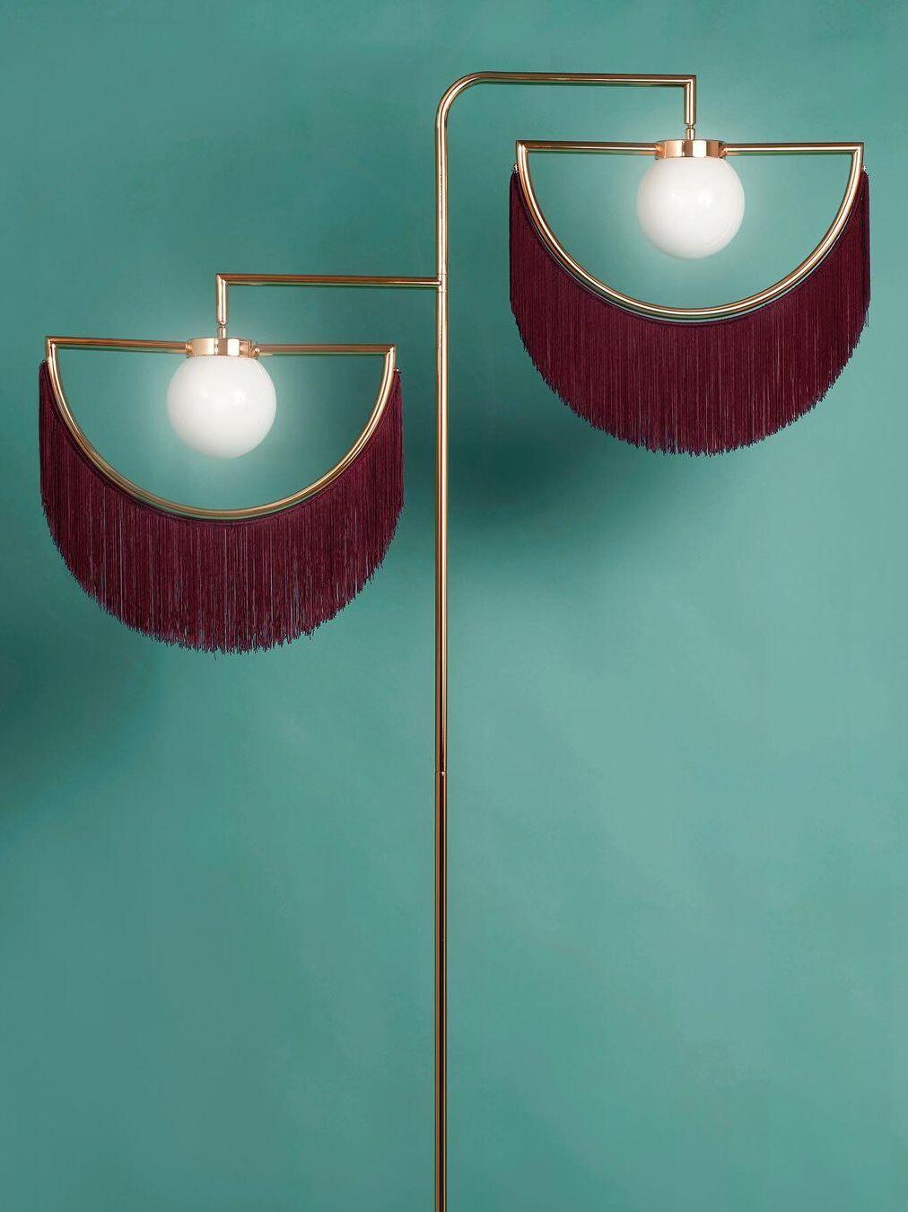 Wie ein kostbares Juwel schmücken die Fransen elegant die geometrische Struktur aus goldenem Metall. Die Starrheit des Regenbogens steht im Widerspruch zur Zerbrechlichkeit und Zartheit der Fransen. Dieser seidige und leichte Vorhang wirbelt sanft unter der Wirkung der Luftströmungen ... Wink zieht sowohl das Auge als auch die Hand an: Sie möchten ihn streicheln und mit den Händen hindurchfahren und sie in diesen Wasserfall aus Wolle eintauchen lassen, der sich warm anfühlt. Die Glühbirne ist in einer zarten weißen Glaskugel untergebracht.
