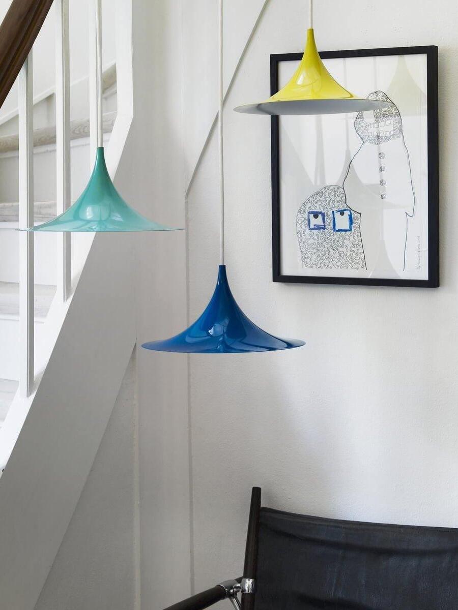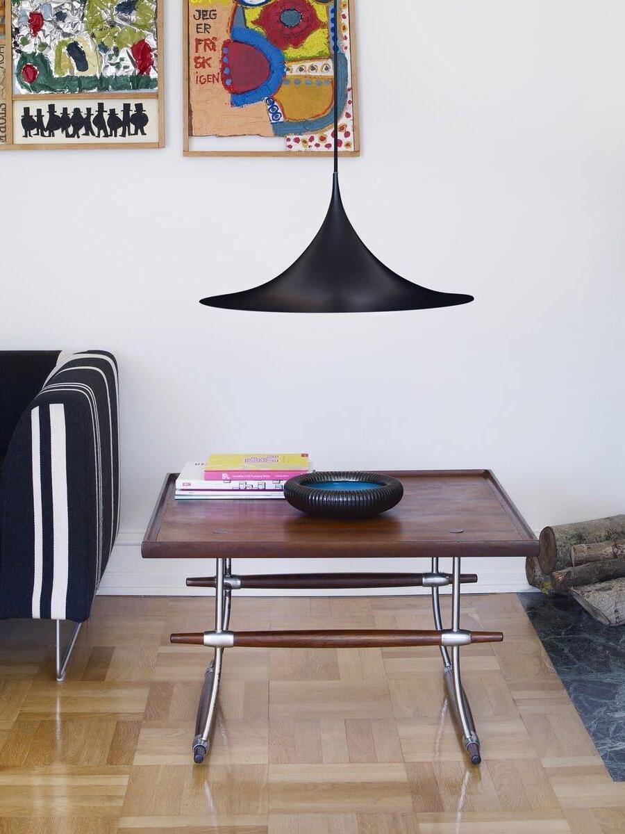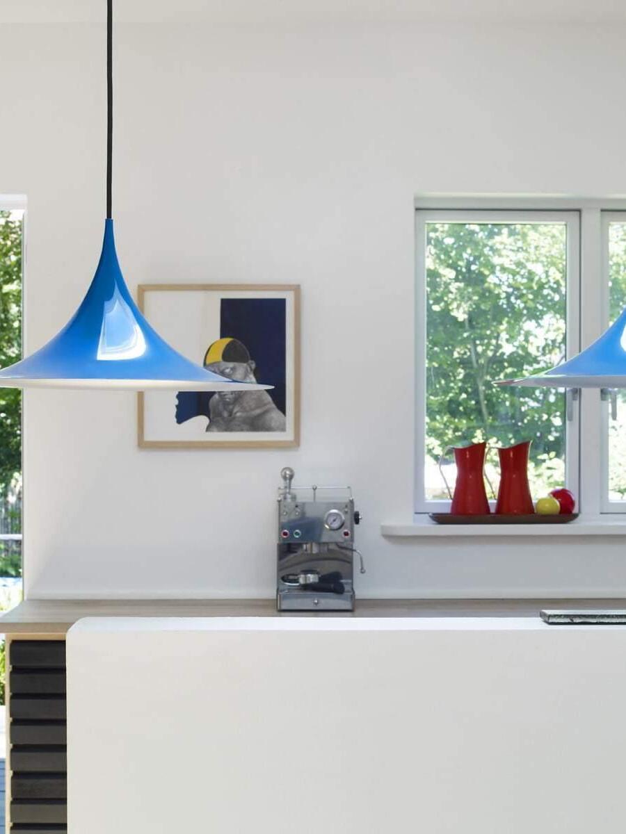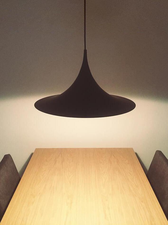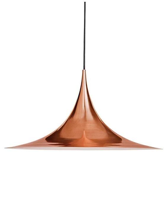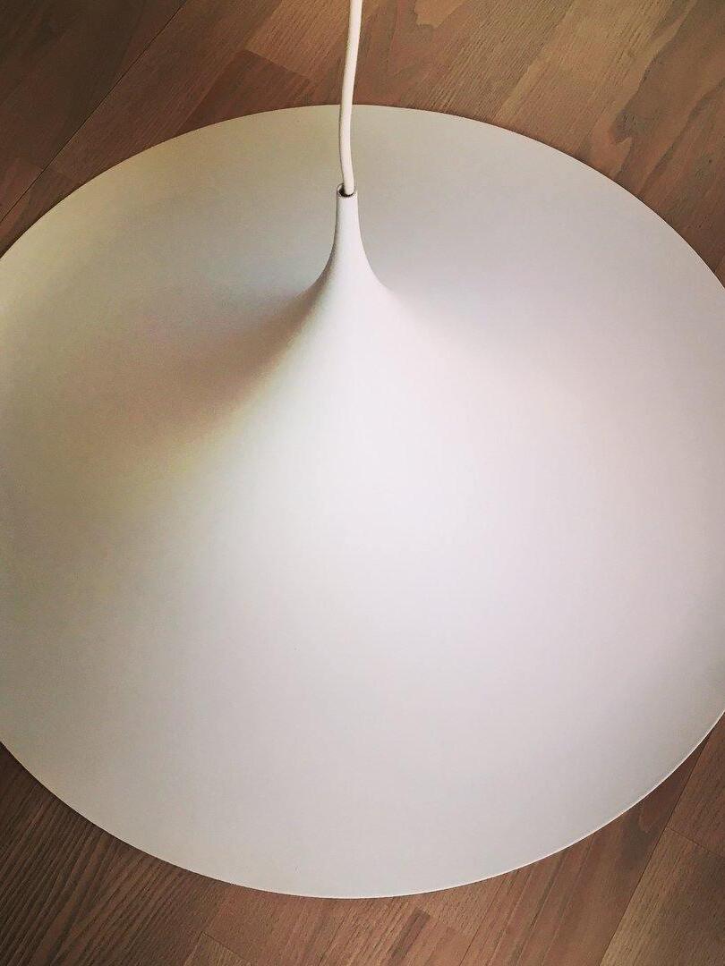 Semi is a unique pendant lamp, based on two quarter-circles put together, back-to-back. With its distinctive arch-shaped, enameled metal shade, lightness of form and unique, timeless design, the elegant Semi lamp achieved great success in the 1980's and became, at that time, the best-selling Danish design, gaining worldwide recognition and iconic status. It´s distinctive arch-shaped shade in lacquered, spun aluminum creates a diffused, cone-shaped light, ideal over a dining table or kitchen work surface.