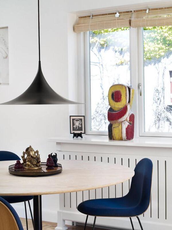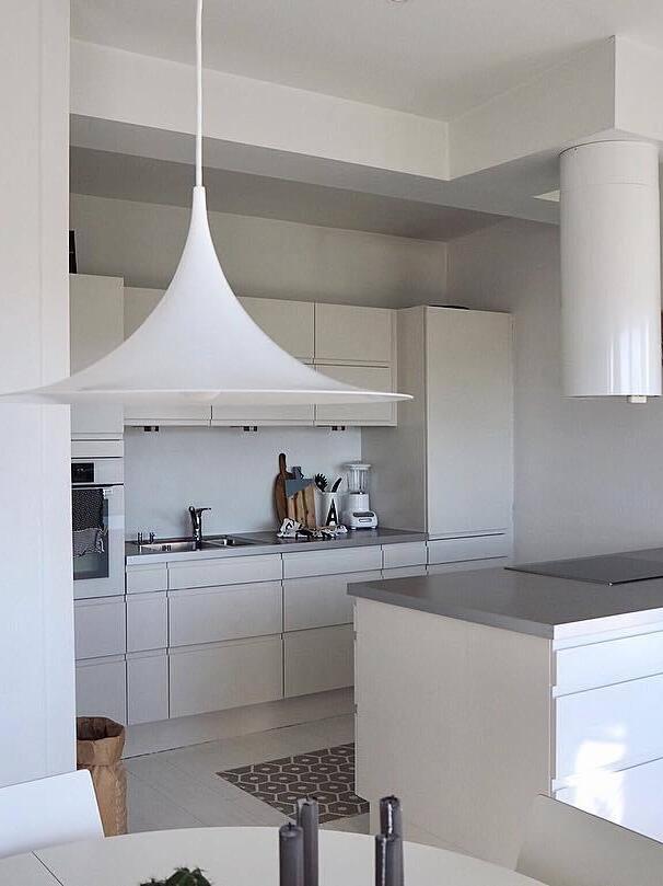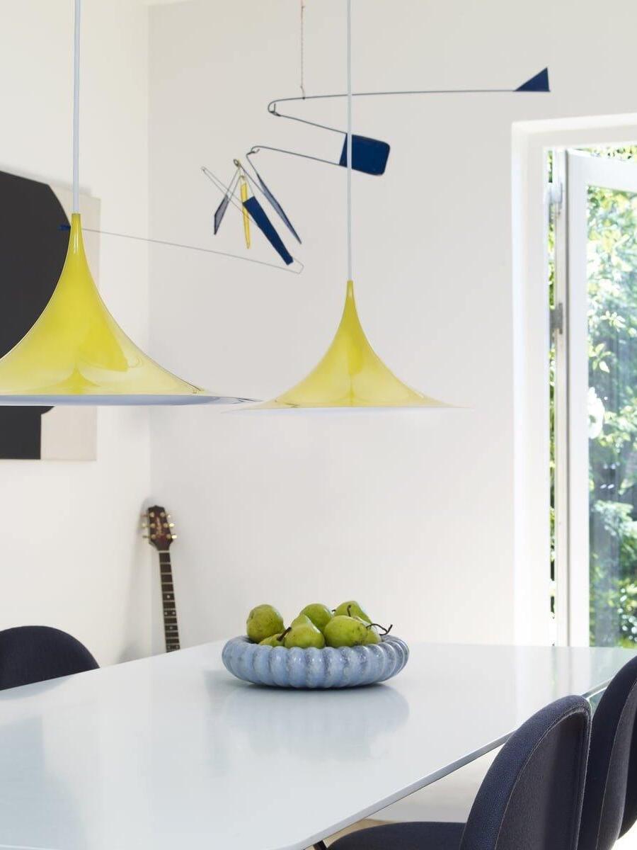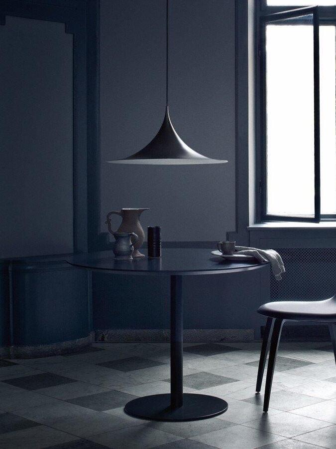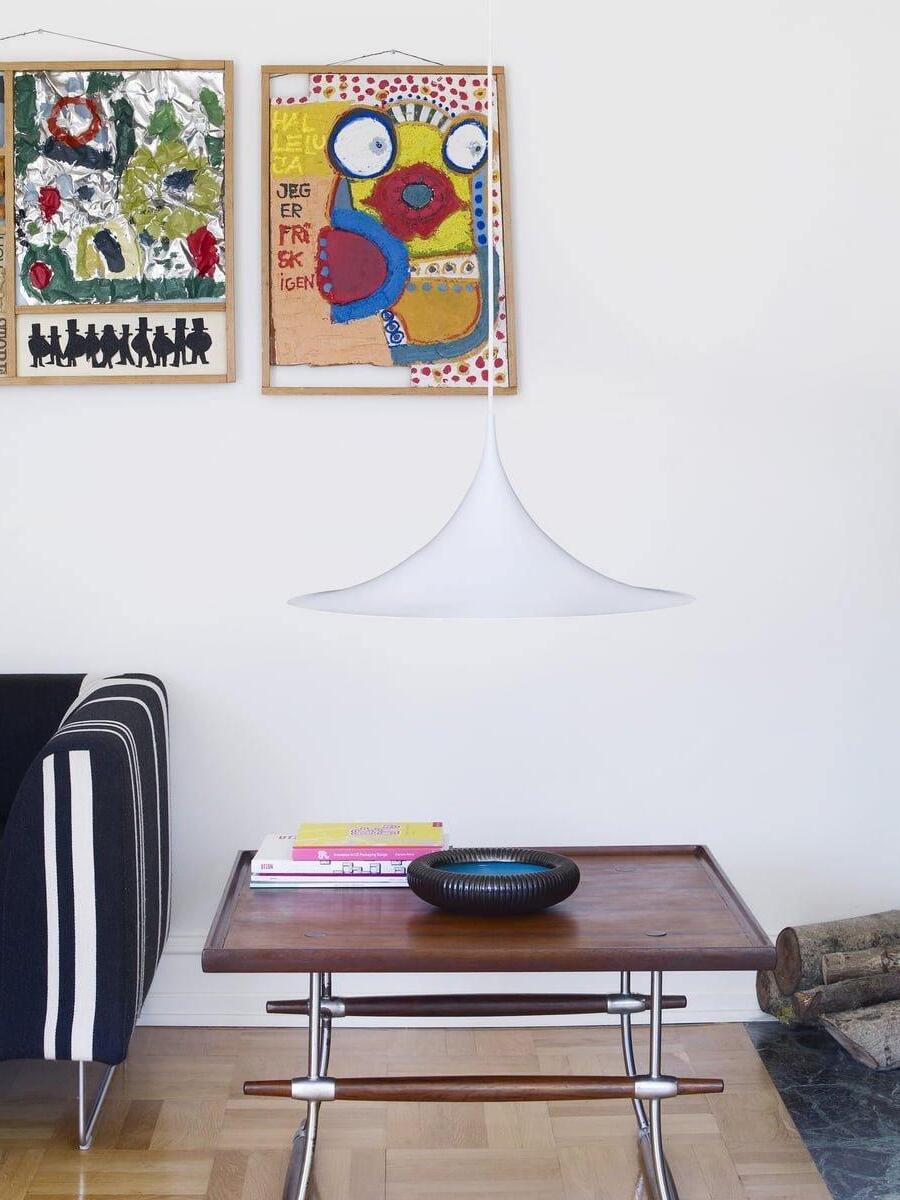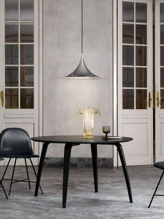 Semi is a unique pendant lamp, based on two quarter-circles put together, back-to-back. With its distinctive arch-shaped, enameled metal shade, lightness of form and unique, timeless design, the elegant Semi lamp achieved great success in the 1980's and became, at that time, the best-selling Danish design, gaining worldwide recognition and iconic status. It´s distinctive arch-shaped shade in lacquered, spun aluminum creates a diffused, cone-shaped light, ideal over a dining table or kitchen work surface.