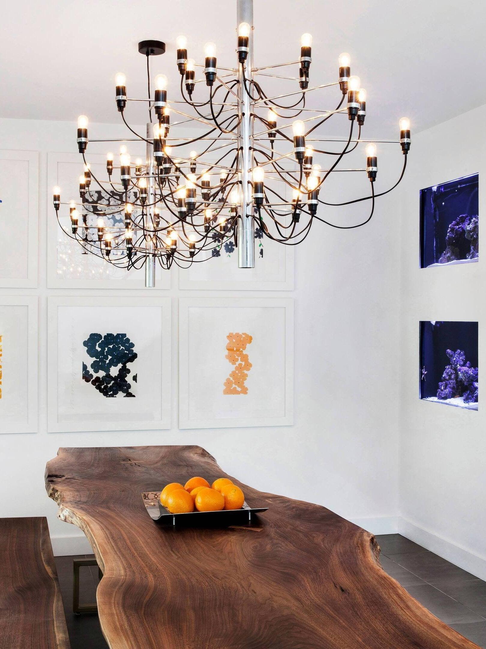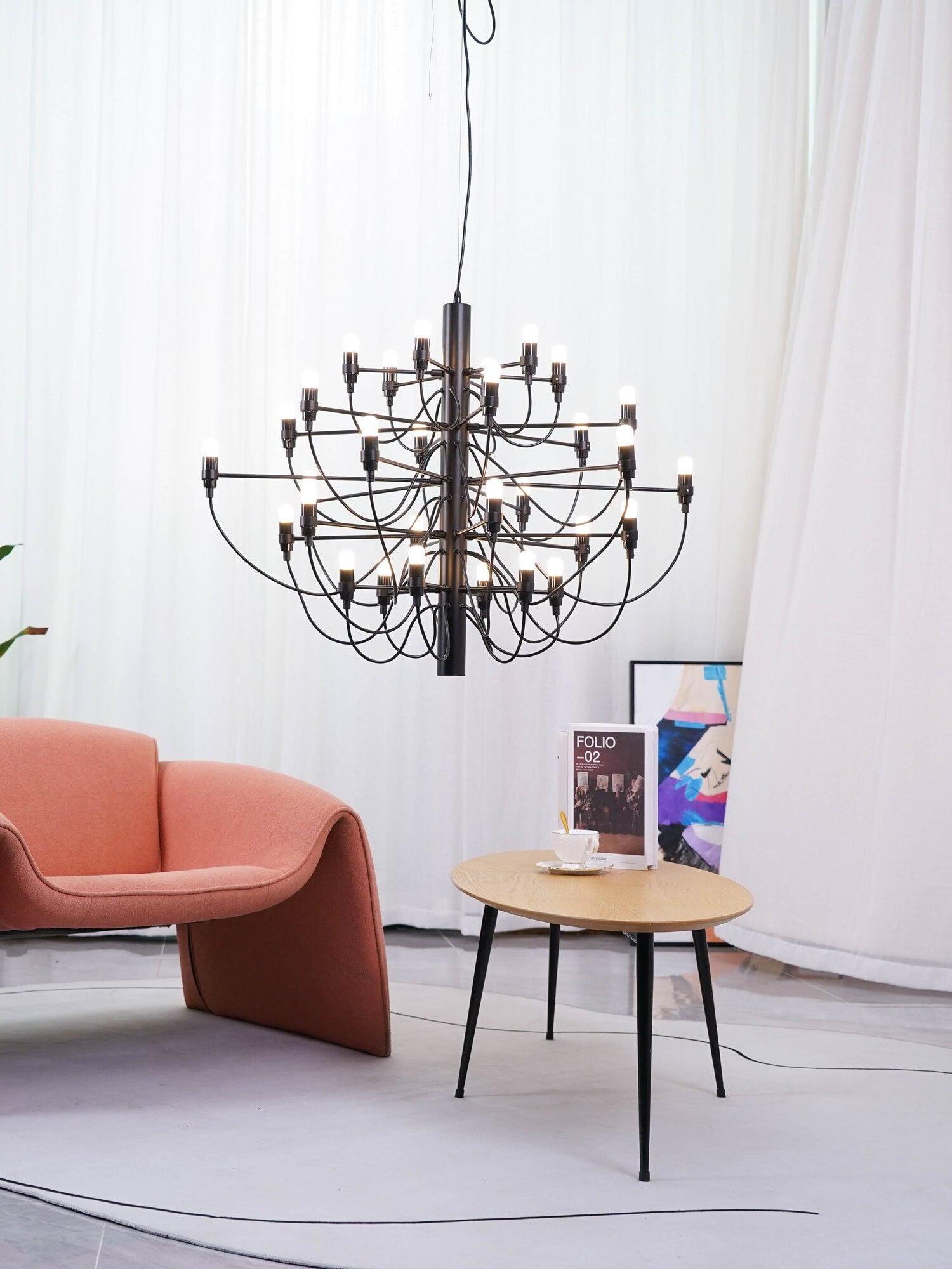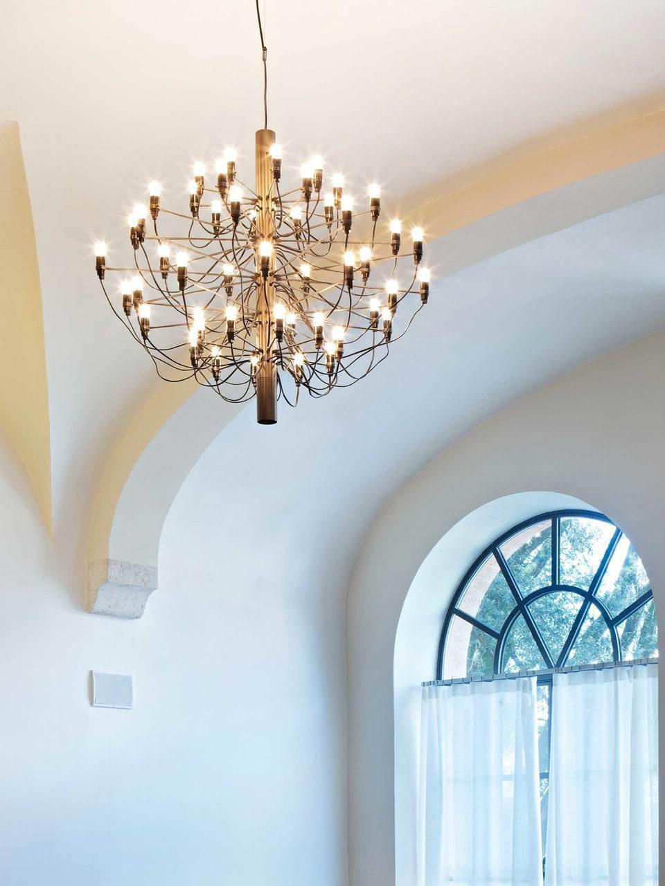 Desde 1958, este diseño icónico de lámpara colgante 2097 ha servido como una representación ultramoderna de la lámpara de araña tradicional de mediados de siglo. Cada detalle de esta lámpara de techo de última generación es excepcional, desde el acabado pulido tipo espejo de su estructura principal de acero hasta la forma en que cada bombilla está equipada con su propio brazo horizontal y el elegante cableado que serpentea por el tallo.*100002 *