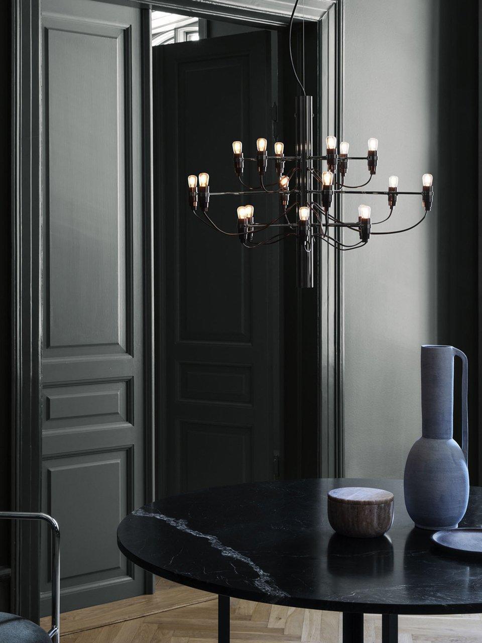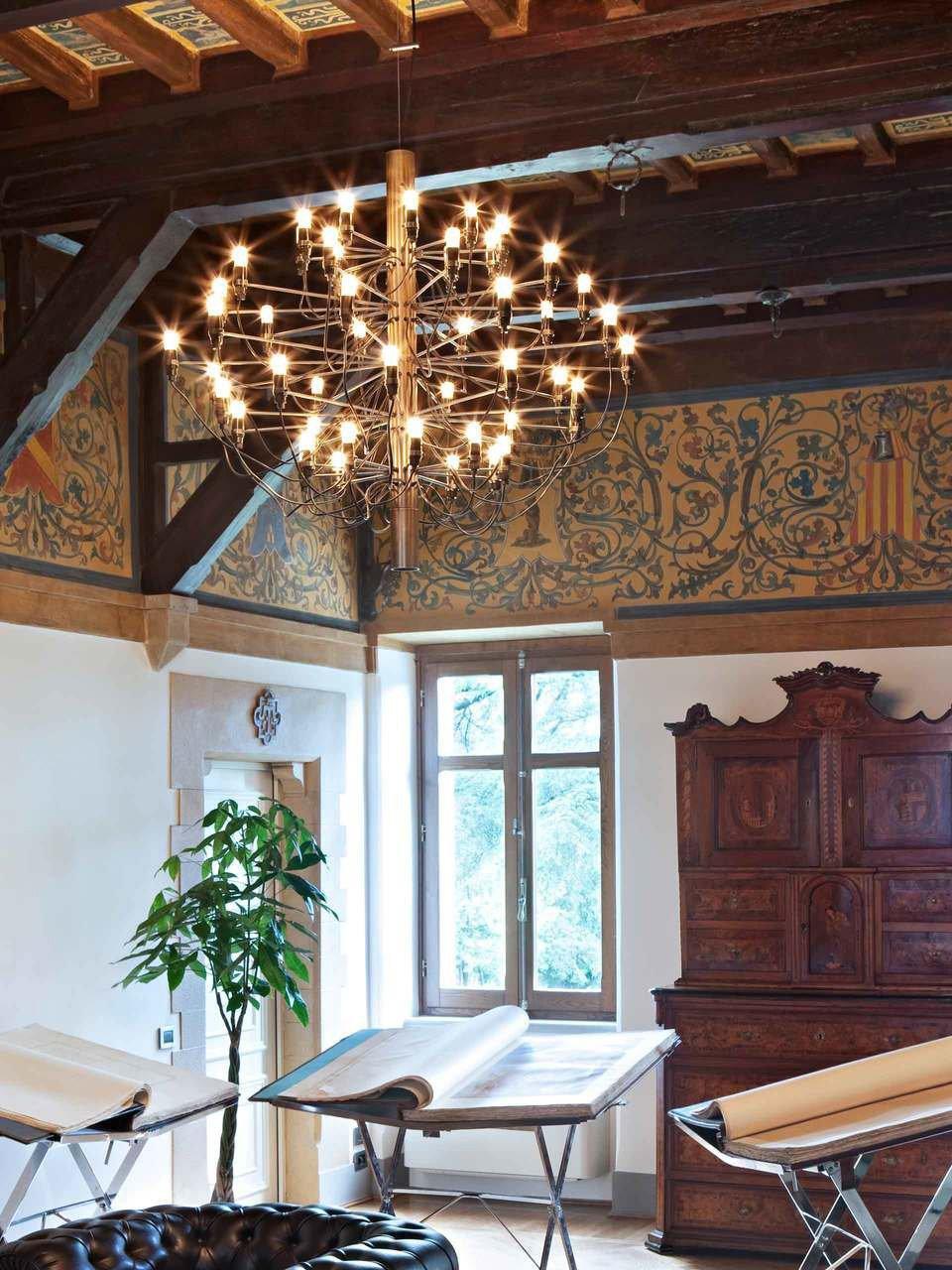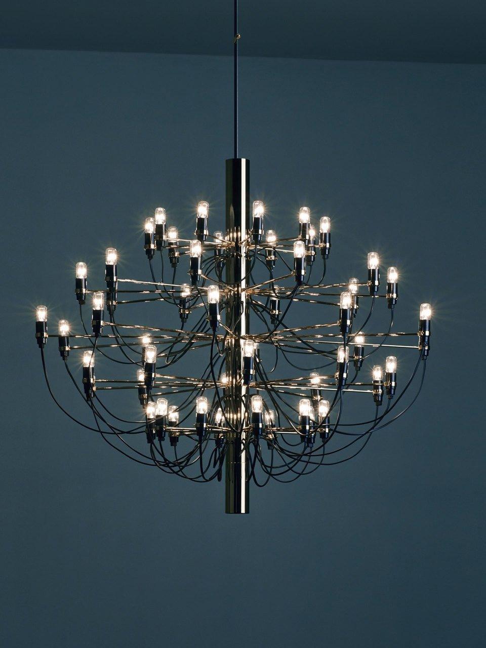 2097 Lámpara de suspensión con capacidad para 18, 30 o 50 bombillas incandescentes. Lámpara de suspensión que proporciona luz difusa. Estructura central de acero con brazos de latón, ambos disponibles en cromado, negro o dorado. Herraje de techo de acero.