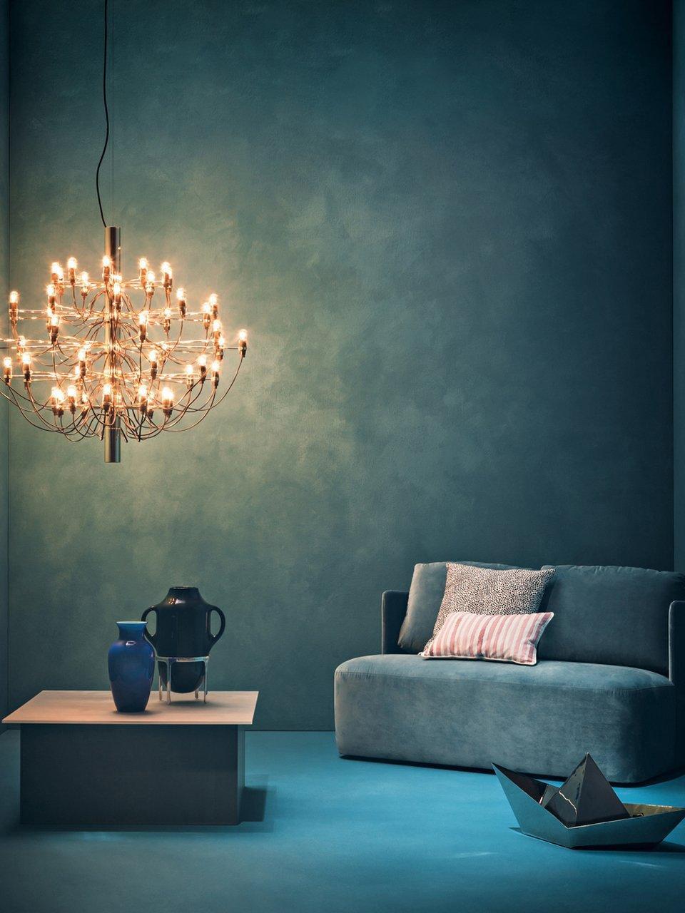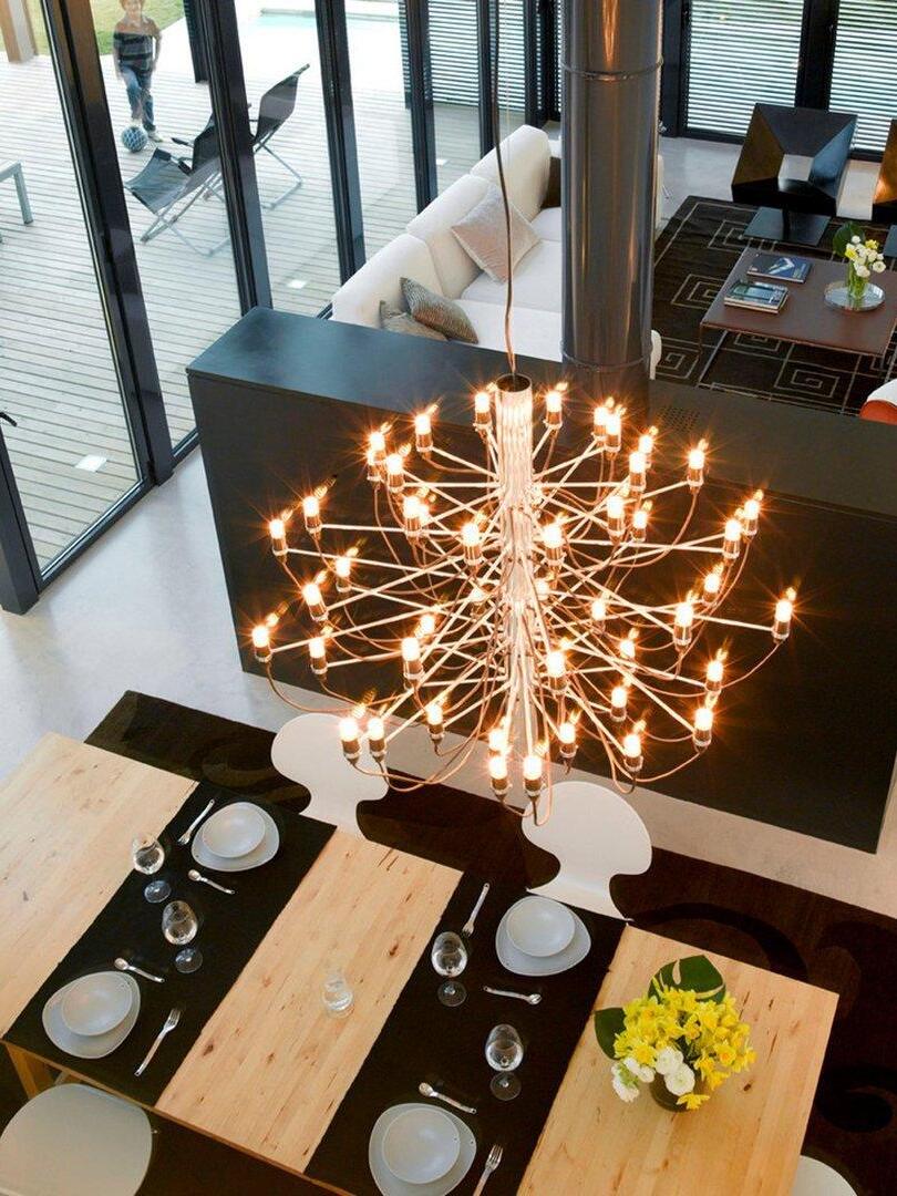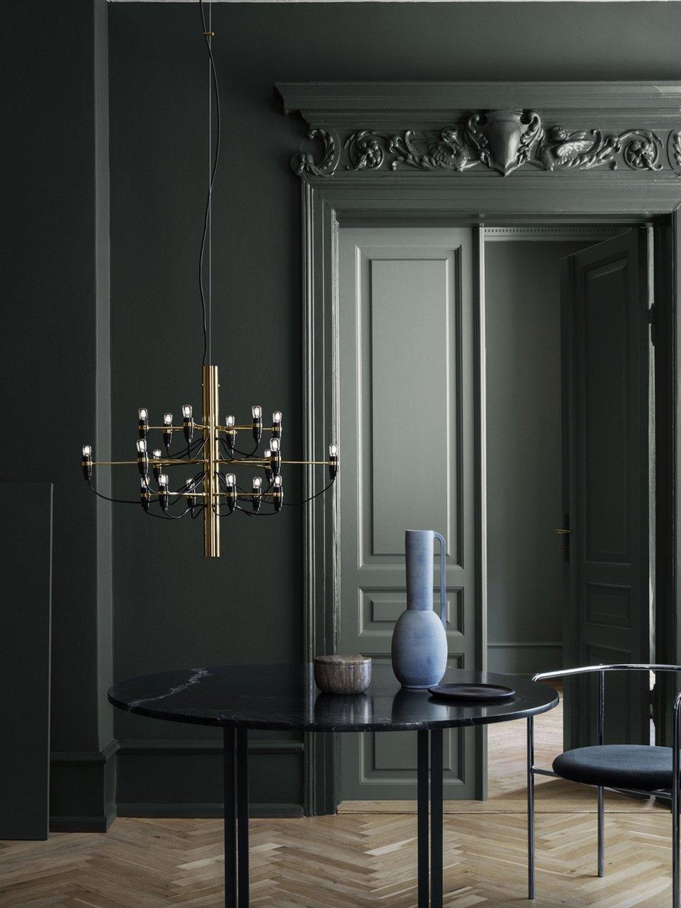 2097 Lámpara de suspensión con capacidad para 18, 30 o 50 bombillas incandescentes. Lámpara de suspensión que proporciona luz difusa. Estructura central de acero con brazos de latón, ambos disponibles en cromado, negro o dorado. Herraje de techo de acero.