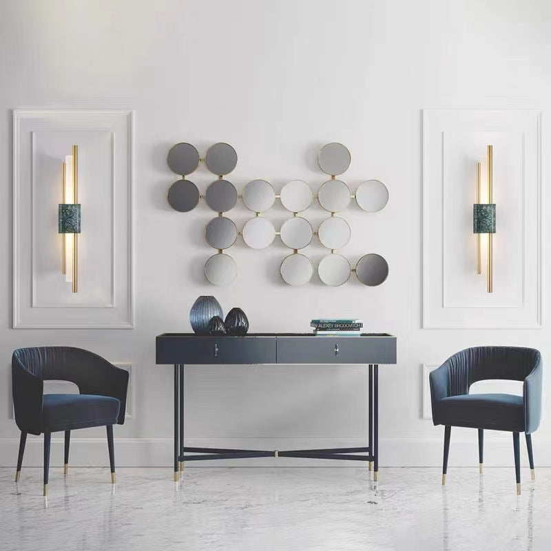 - Una encarnación de simetría y gracia, la lámpara presenta un diseño de aplique distintivo que alberga dos lámparas que proyectan su resplandor hacia arriba y hacia abajo. Esta iluminación simétrica crea una encantadora interacción de luces y sombras, realzando el ambiente de cualquier habitación con un toque de estilo artístico.