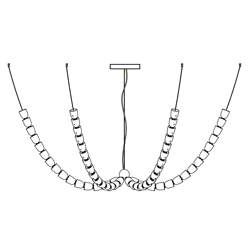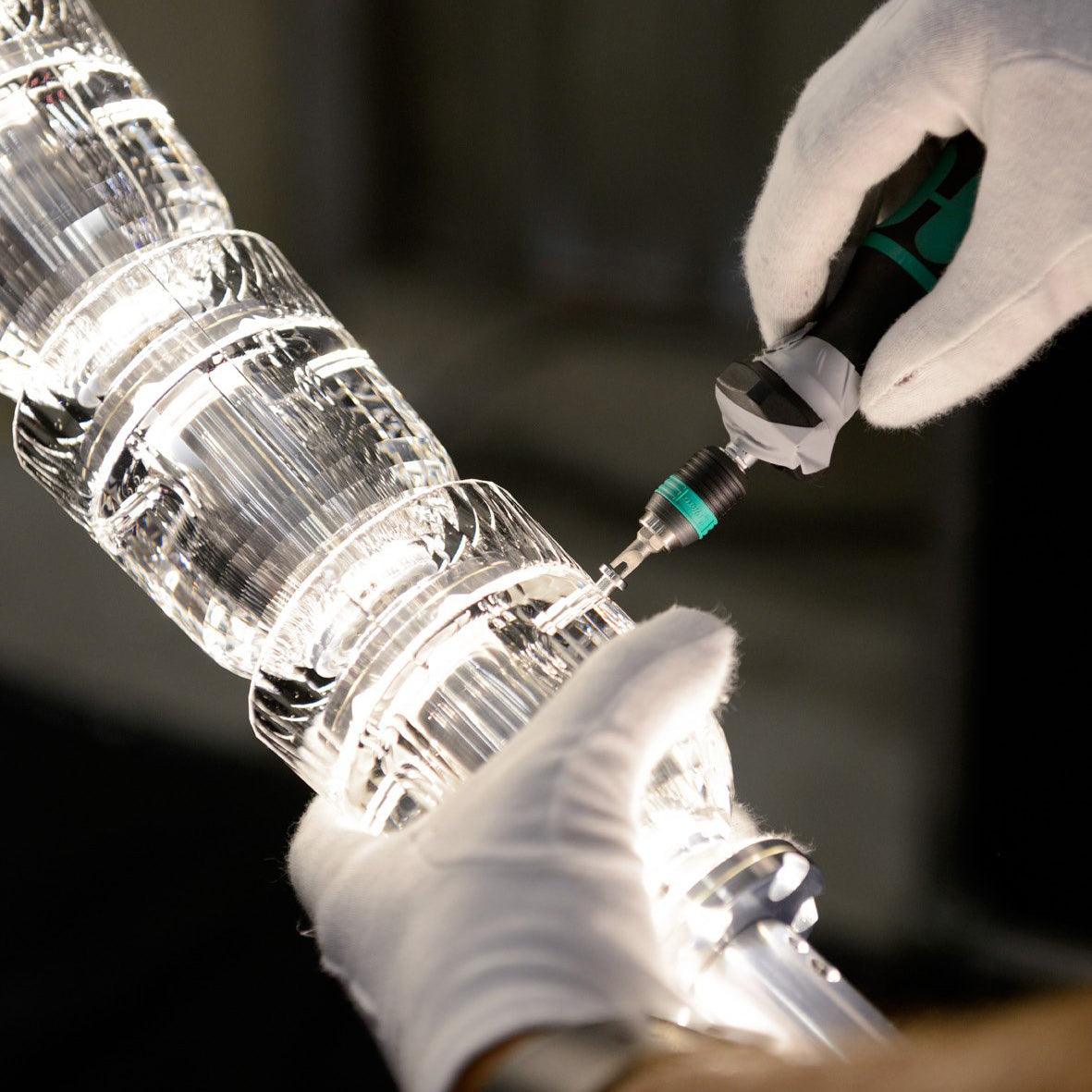 El galardonado diseñador creó una majestuosa lámpara de araña de cristal cuya elegancia y líneas modernas se combinan armoniosamente con el lugar histórico. La pieza cuelga del techo como una serpiente brillante y transparente. Consta de tres líneas entrelazadas, cada una formada por cientos de cristales, iluminadas por una fuente de luz LED brillante que emite una luz suave, continua y envolvente.