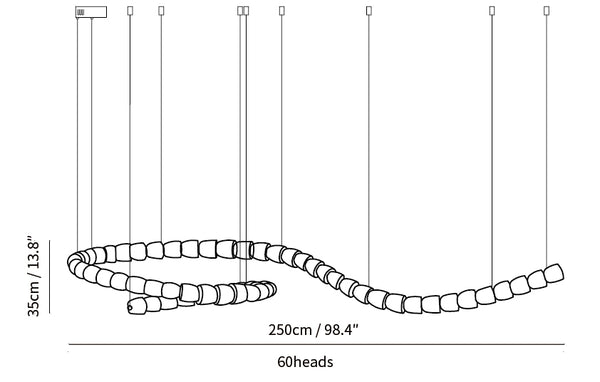 45+28+28=101 cabezas: L 250 cm x H 63 cm / L 98,4 ″ x H 24,8 ″