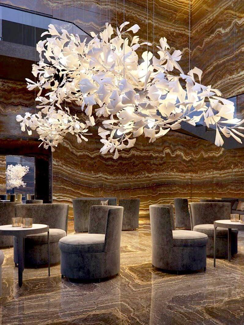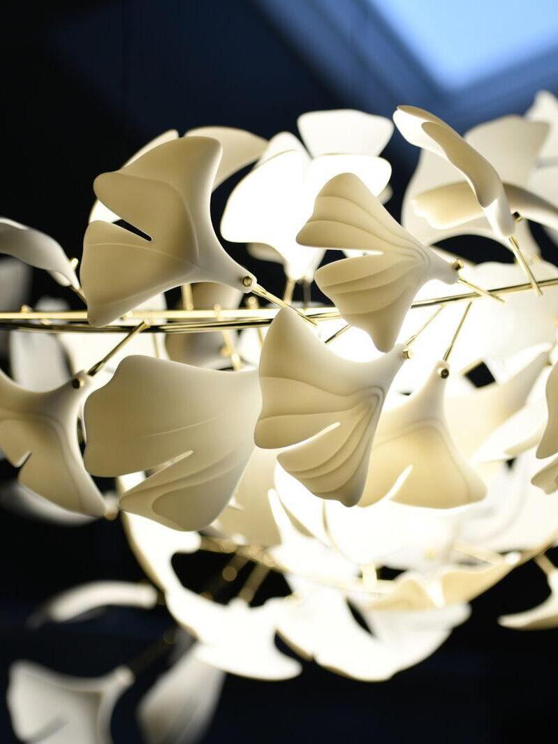 Los candelabros Gingko son impresionantes instalaciones hechas a medida, compuestas de hojas de porcelana hechas a mano. La interacción entre cerámica y luz tiene el poder de crear una sensación de bienestar y una atmósfera cálida. La escultura luminosa va mucho más allá de su finalidad funcional de iluminar un espacio. Al iluminarse, define su propia forma y presencia, convirtiéndose en una obra de arte fascinante. Como una planta viva, tiene una energía natural y dinámica que nos calma y revitaliza. El diseño de las instalaciones va de la mano del espacio arquitectónico y de las ideas de los arquitectos e interioristas.