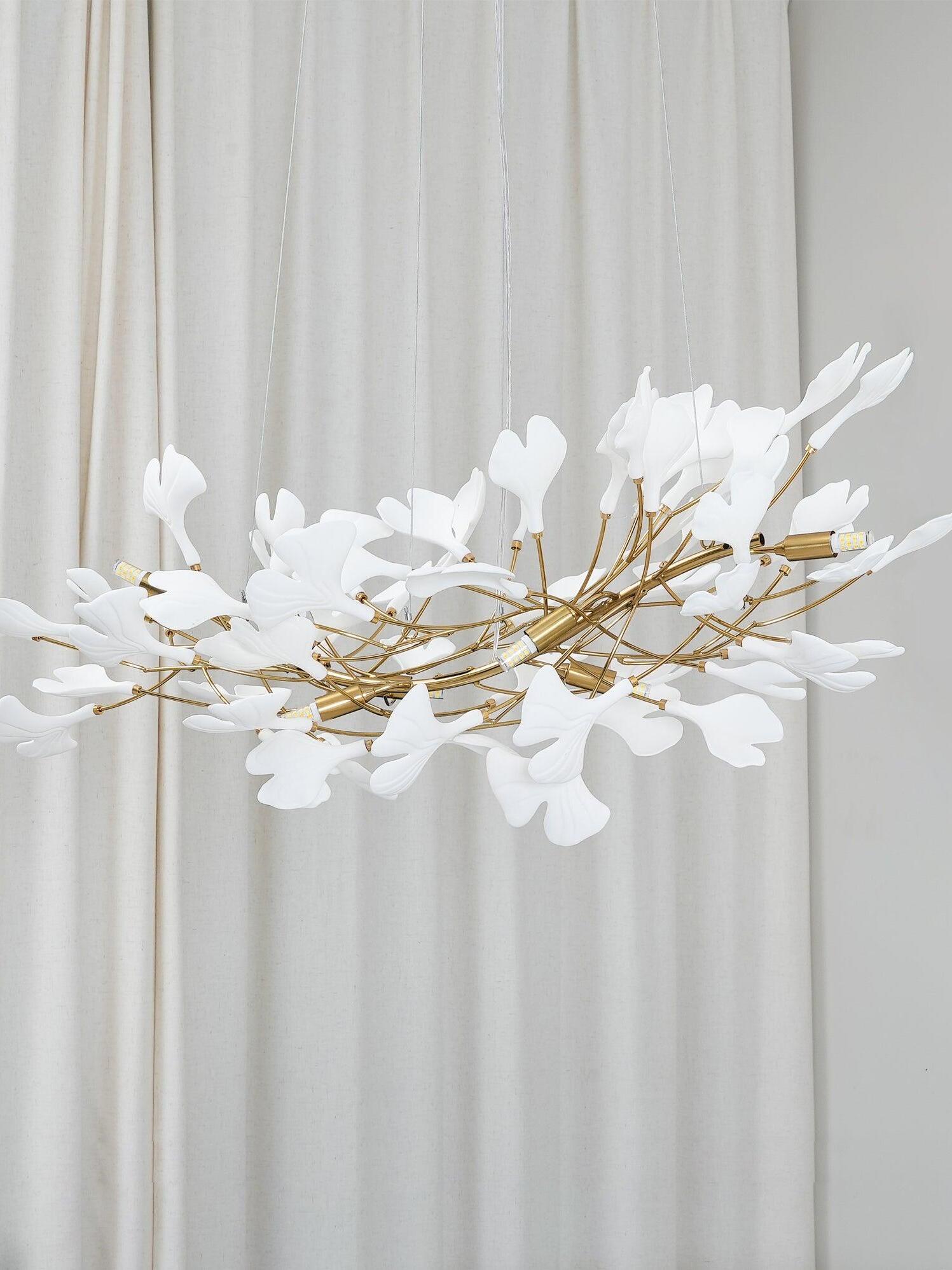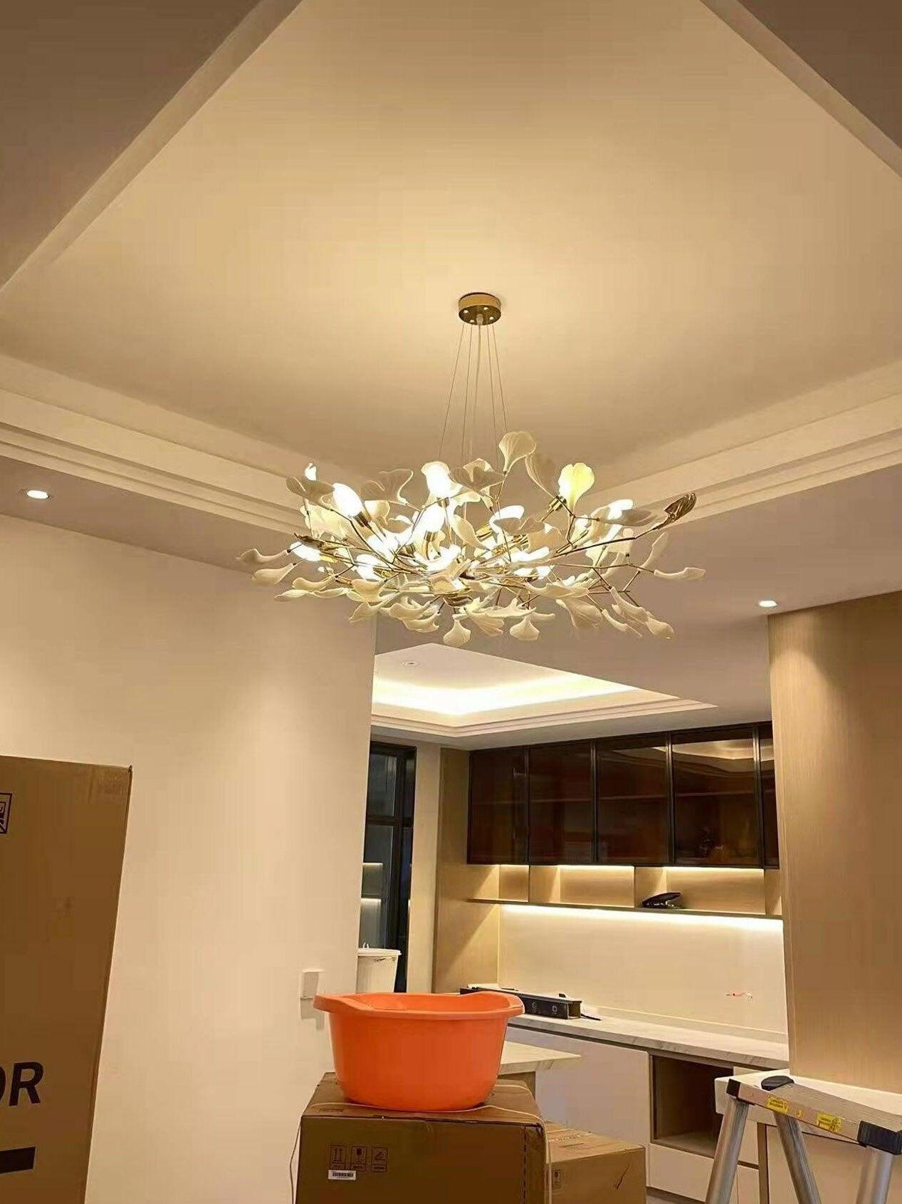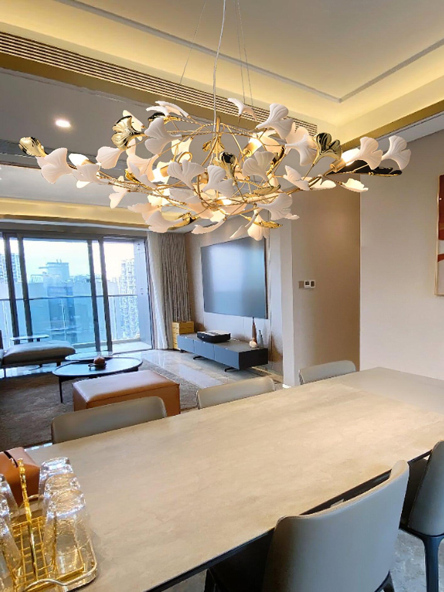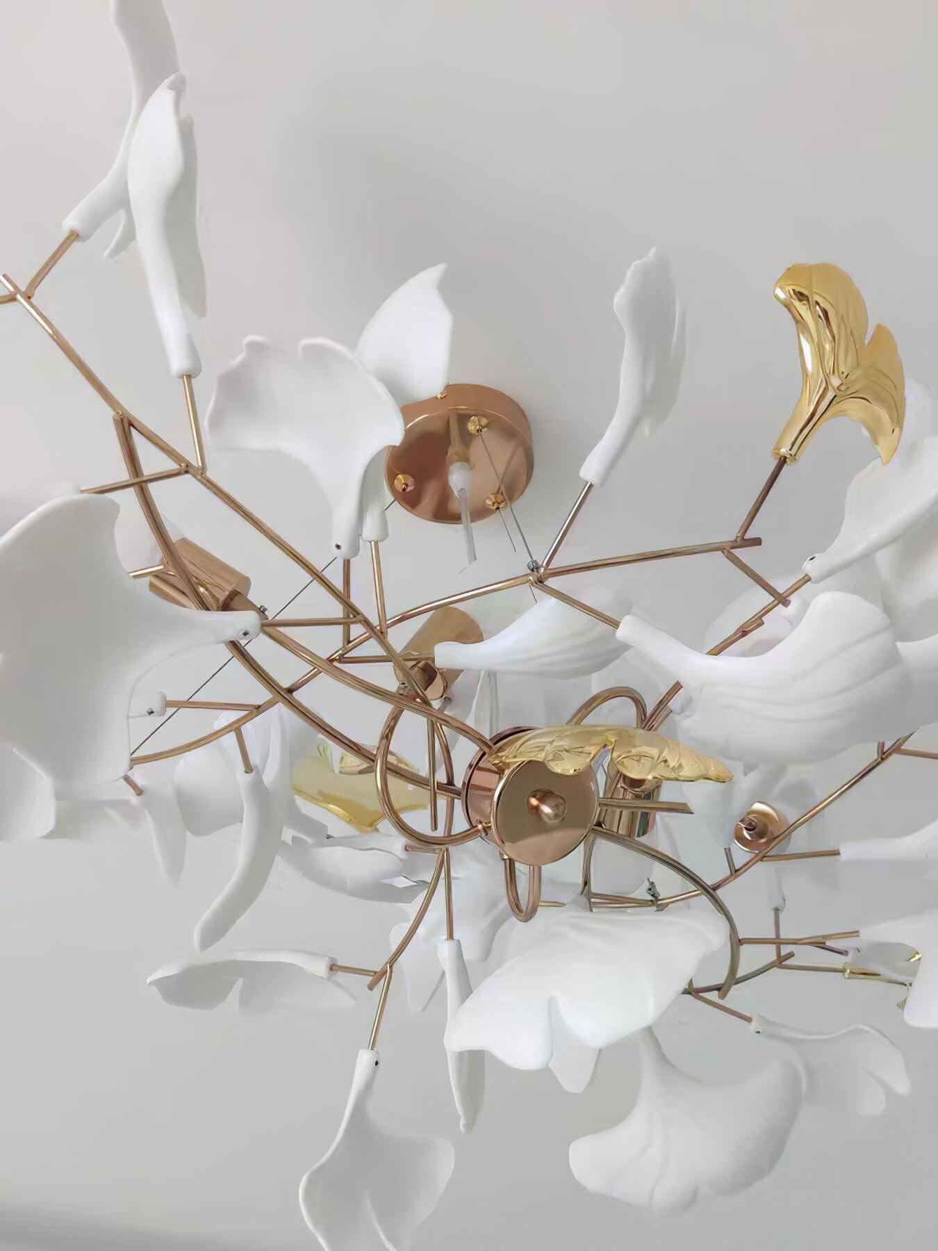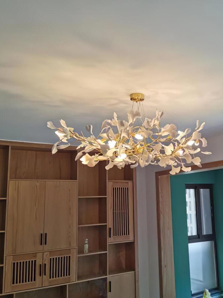 Esta lámpara de araña de cerámica con pétalos de árbol de ginkgo muestra su estilo lujoso en diseño general, materiales y tecnología de fabricación. El cuerpo de la lámpara de latón está cubierto con exquisitos pétalos de cerámica, que reflejan la combinación perfecta de diseño de iluminación y plantas naturales.
