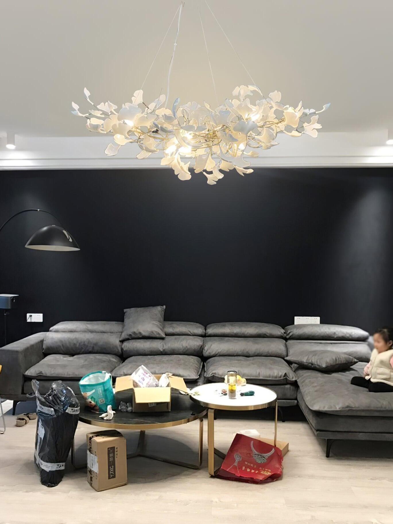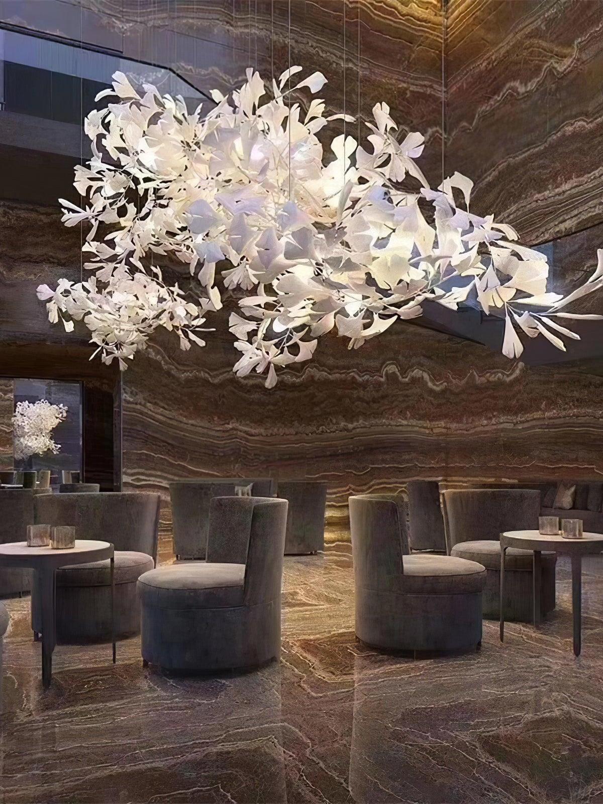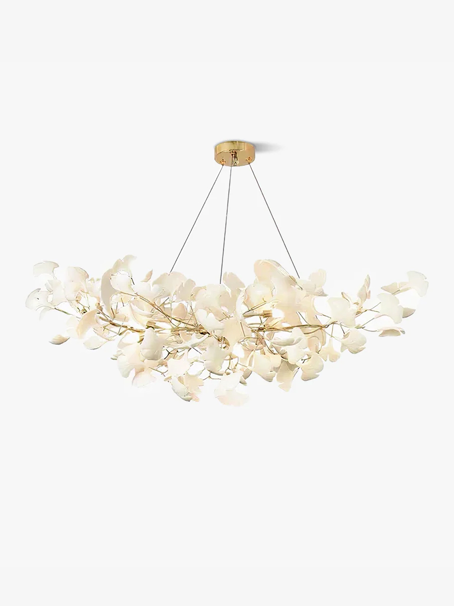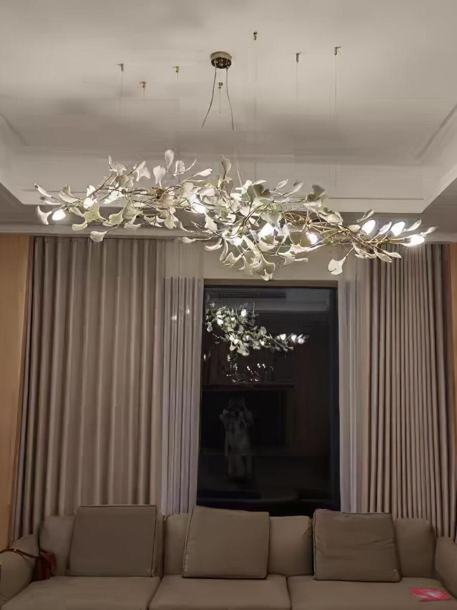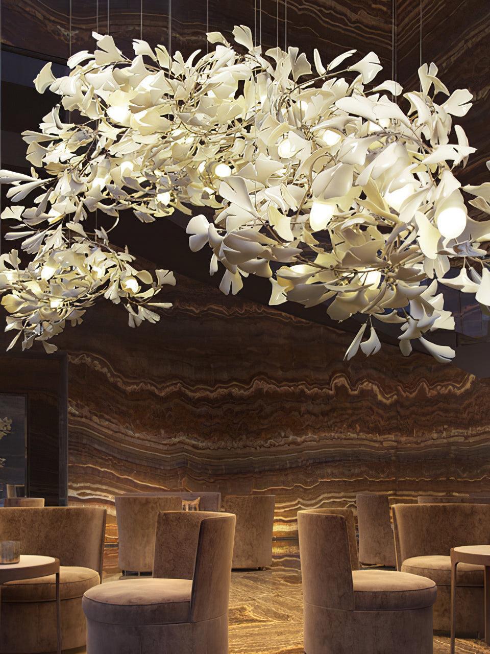 Esta lámpara de araña de cerámica con pétalos de árbol de ginkgo muestra su estilo lujoso en diseño general, materiales y tecnología de fabricación. El cuerpo de la lámpara de latón está cubierto con exquisitos pétalos de cerámica, que reflejan la combinación perfecta de diseño de iluminación y plantas naturales.