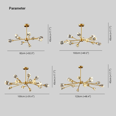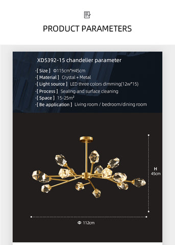 - Esta lámpara de araña presenta pantallas de cristal con una forma irregular única en su tipo. Cada cristal está meticulosamente cortado desde múltiples ángulos para maximizar la transmisión de luz, lo que da como resultado un resplandor puro y transparente que baña su habitación con un brillo fascinante. La forma única añade una dimensión artística, convirtiéndola en algo más que un simple accesorio de iluminación; es una obra de arte que capta la atención.