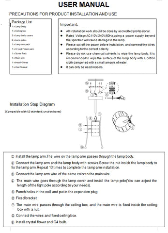 | Tenga en cuenta que puede haber un error de 1 a 3 cm en el tamaño debido a la medición manual. Las imágenes pueden tener un ligero cromatismo debido a la luz y al monitor. Se agradece su comprensión. Se recomienda que la instalación de la lámpara la realice un electricista profesional. | |