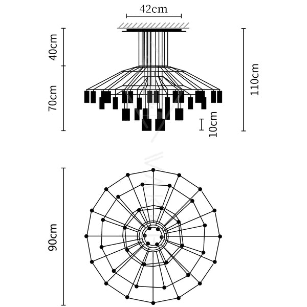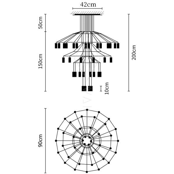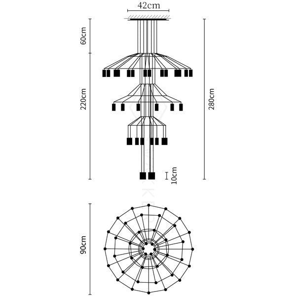 Las lámparas Lines Chandelier están construidas con cable eléctrico negro y una serie de terminales LED de 3 vatios. Disponemos de una colección de Lámparas Wireflow que incluye modelos compuestos por 20, 42 y 46 difusores.