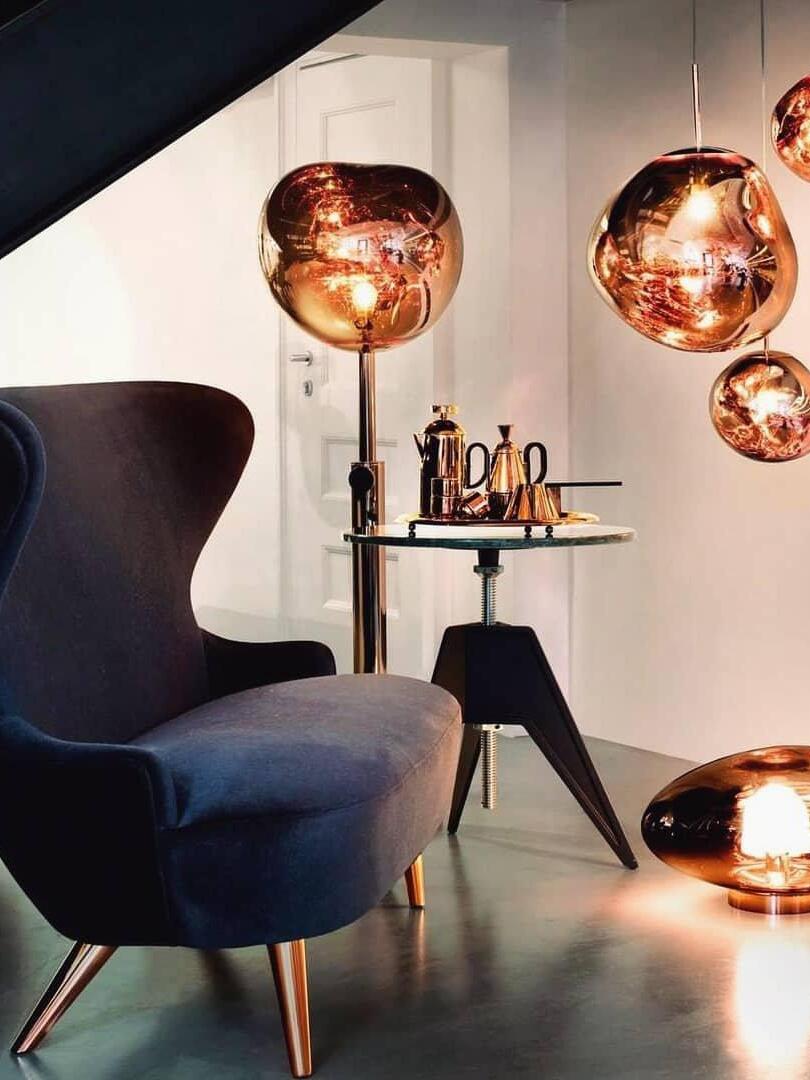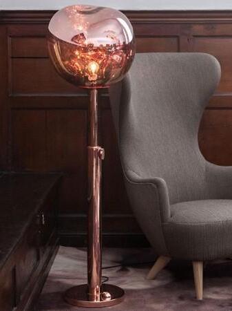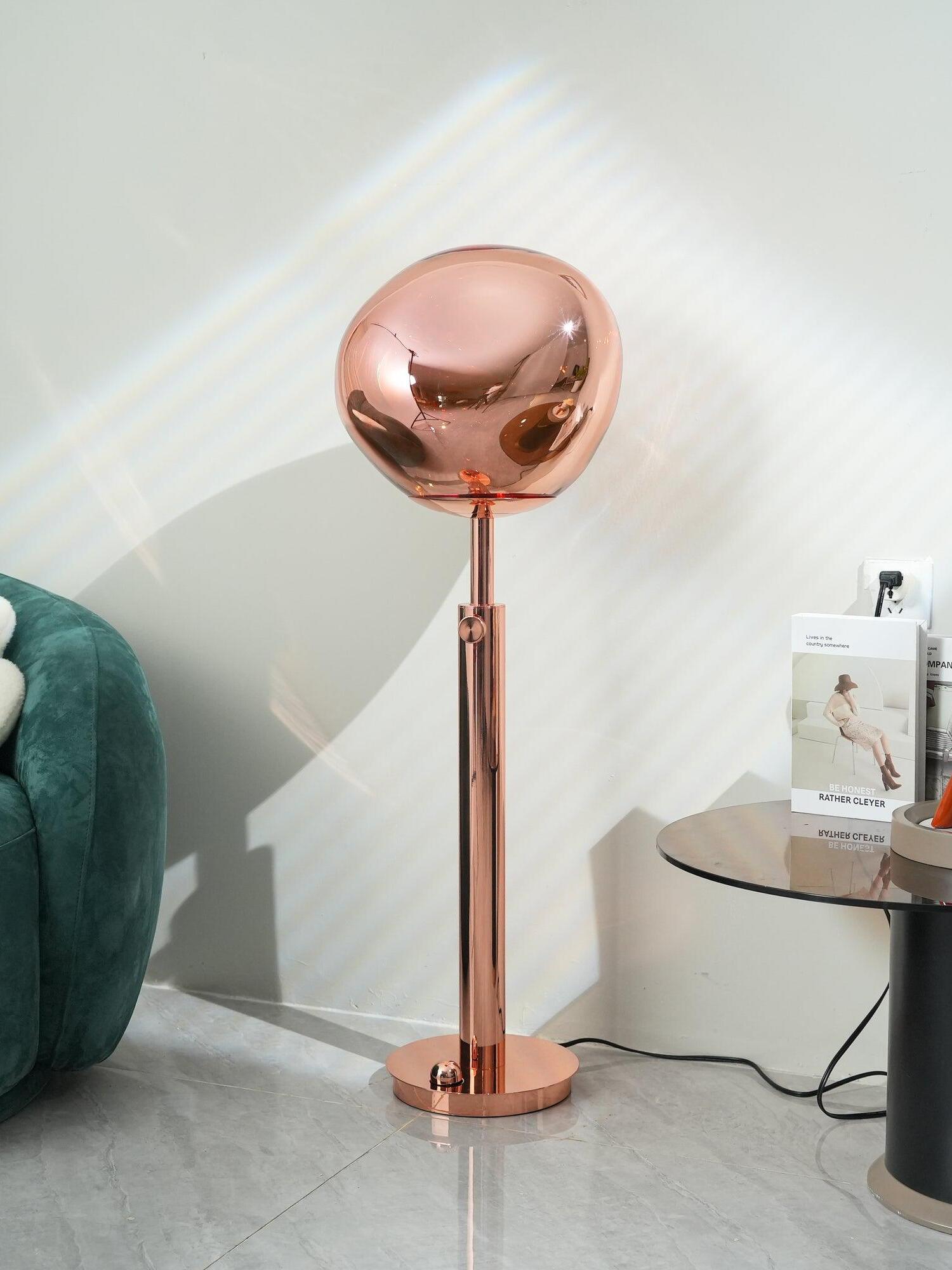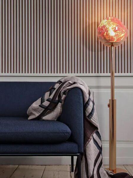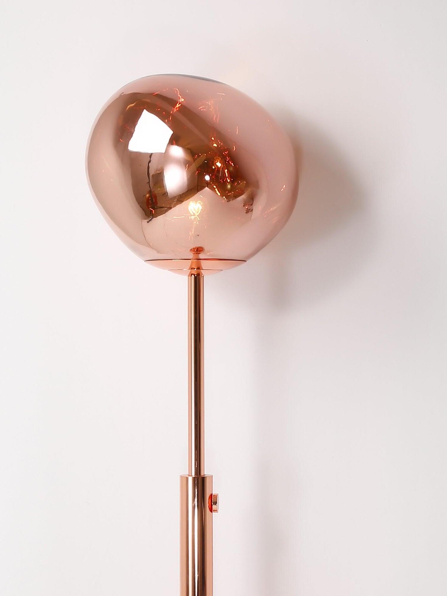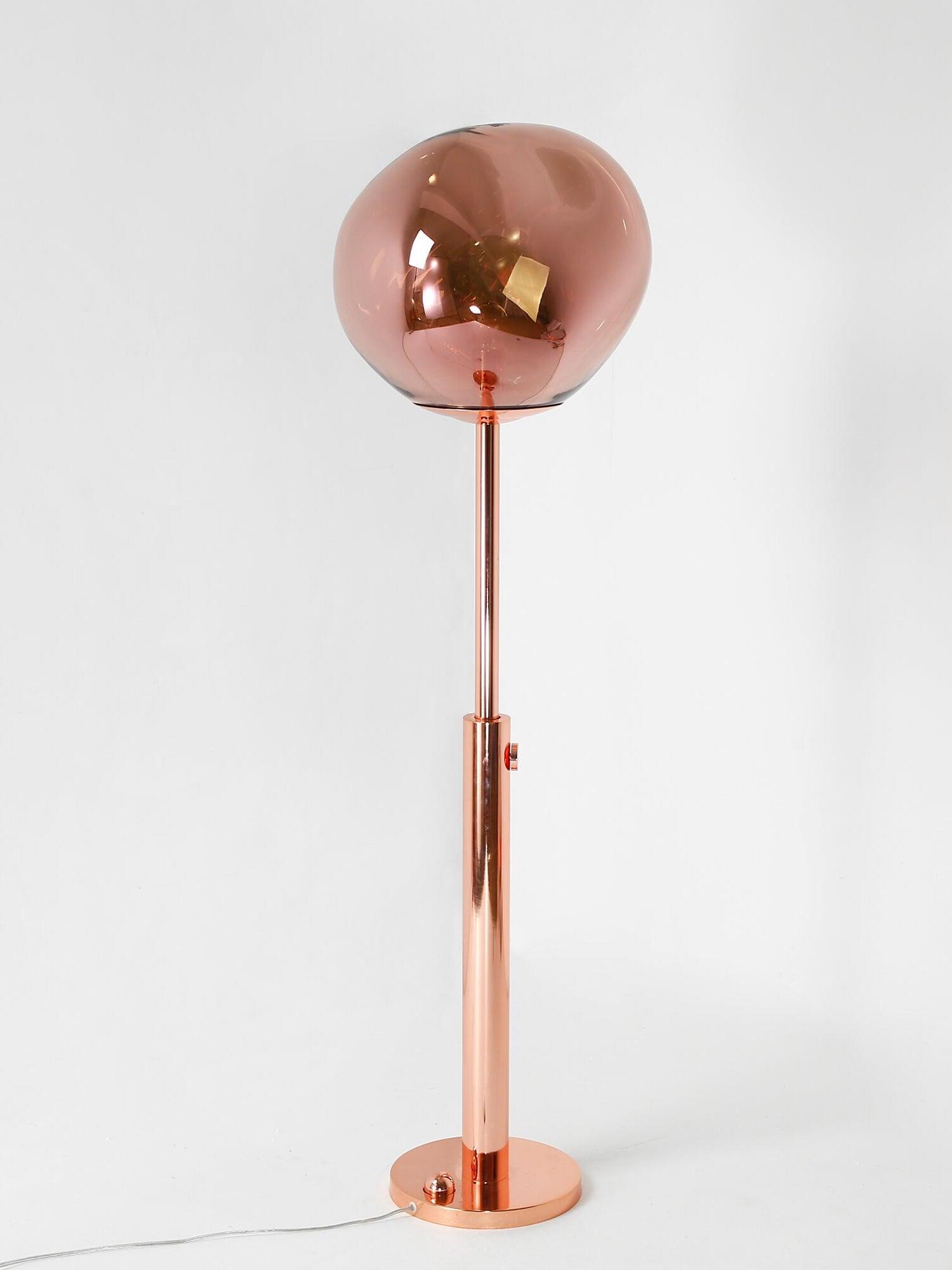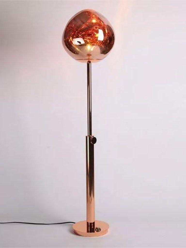 Melt es una lámpara de pie bellamente distorsionada con un moderno acabado en cobre. Al emitir una luz atractiva y ligeramente alucinógena, esta lámpara de pie crea un fascinante efecto de vidrio soplado en caliente cuando está encendida y un efecto de acabado de espejo cuando está apagada. Emite una luz atractiva y ligeramente alucinógena. Las lámparas de pie Melt están disponibles en cobre, cromo y oro.