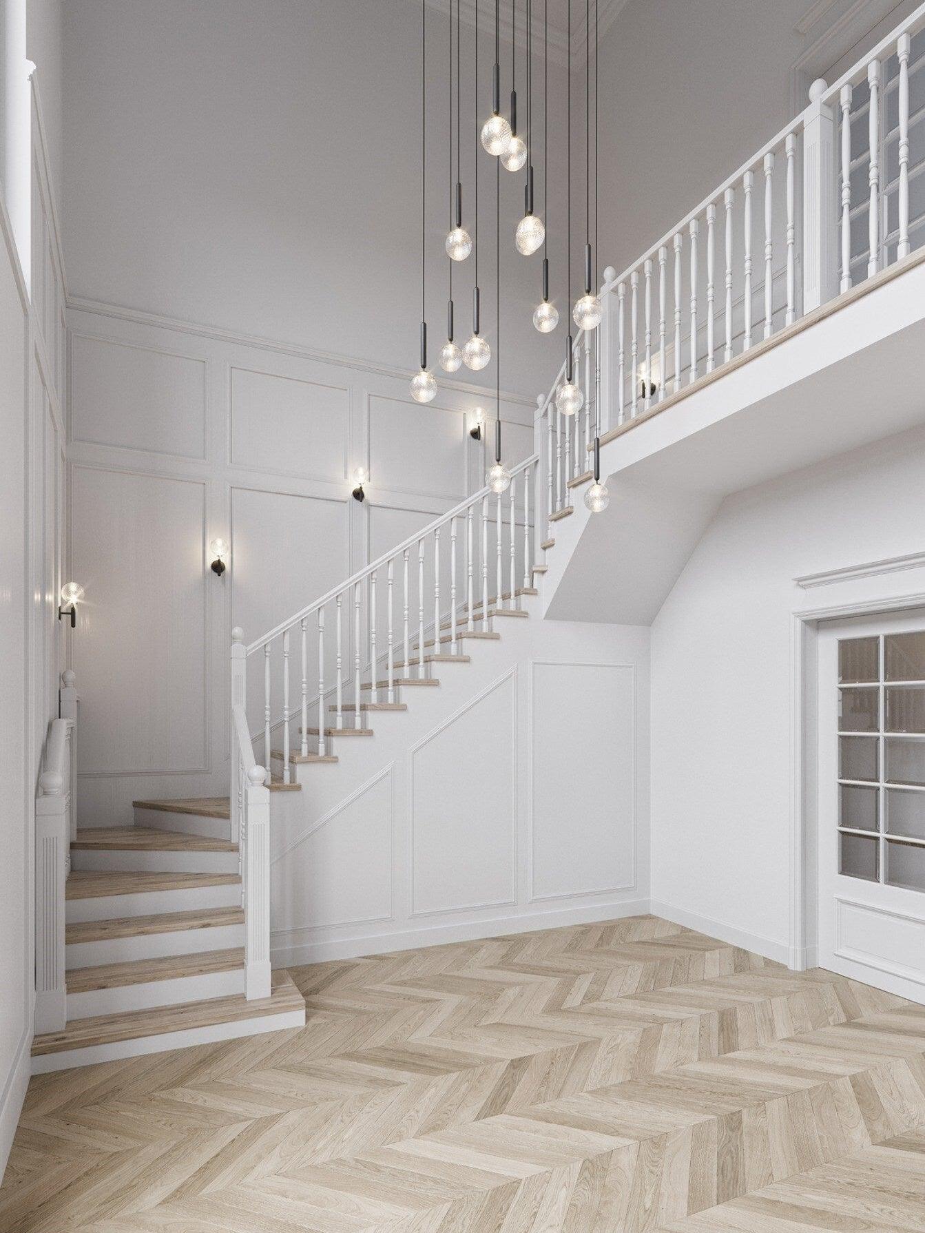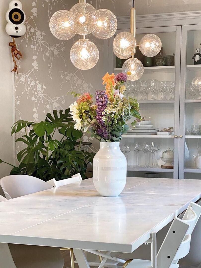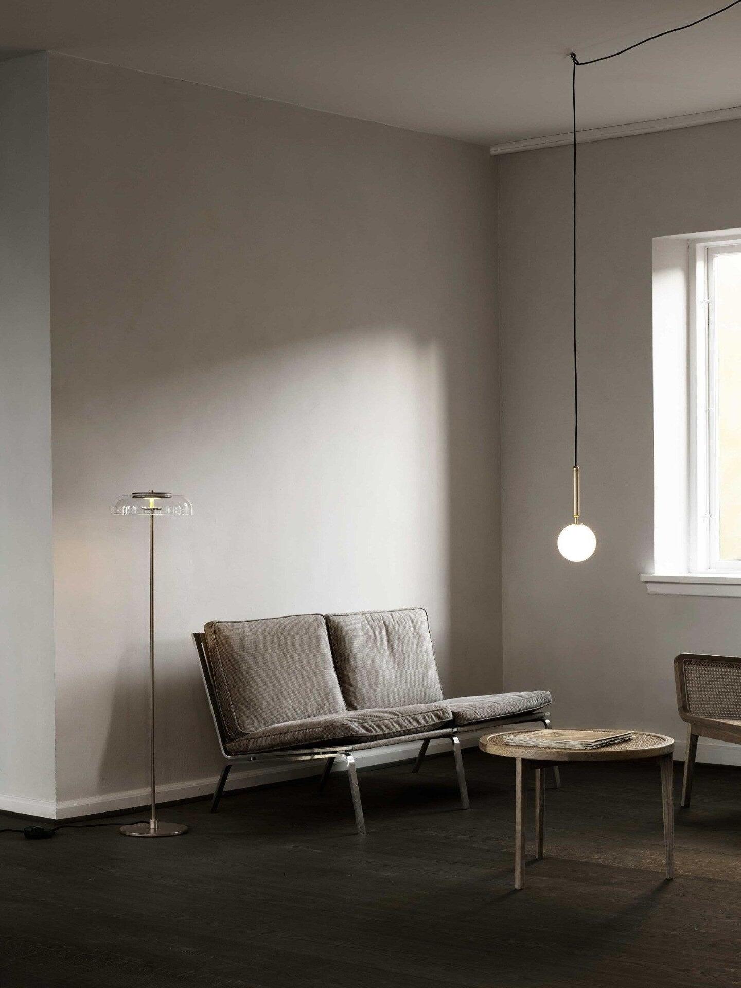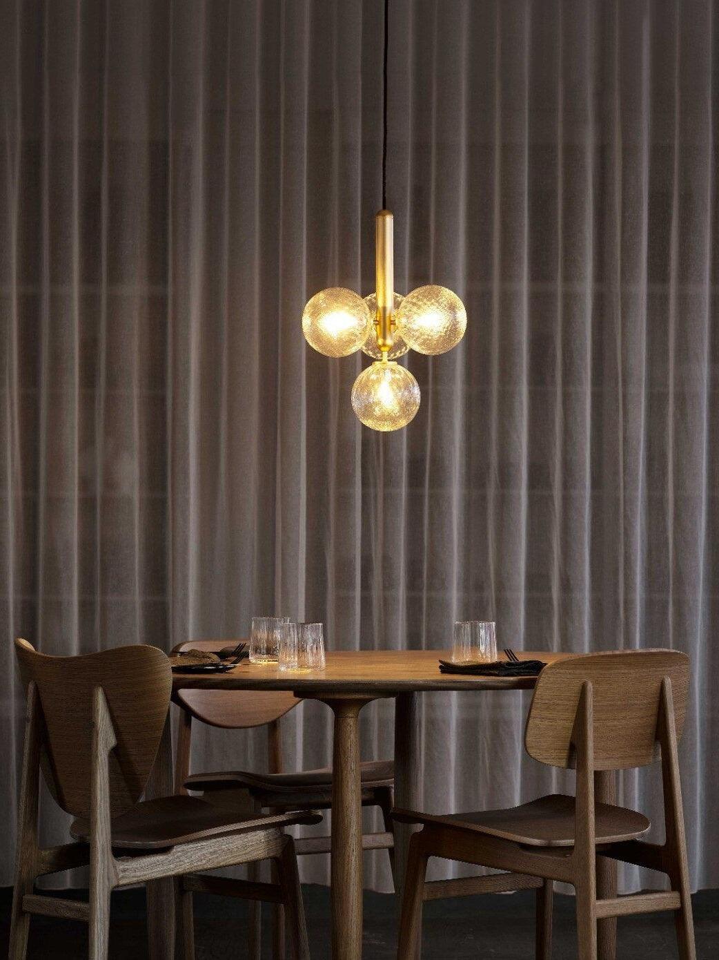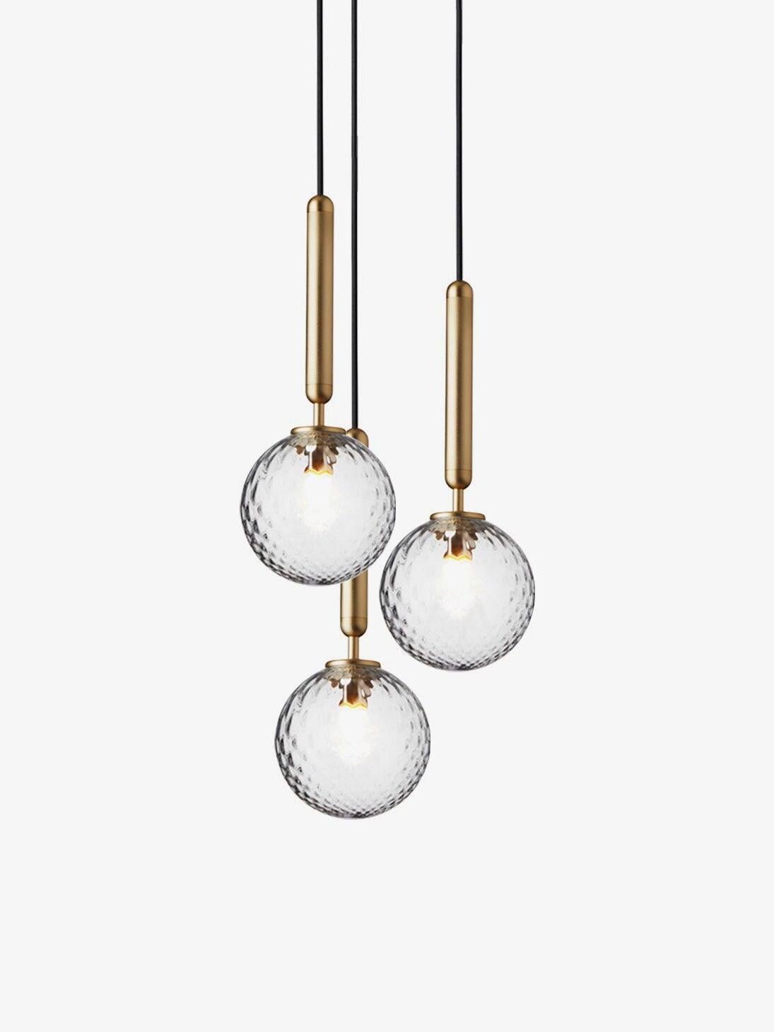 Compuesto por esferas de vidrio soplado y una elegante estructura de metal procesado, el diseño de la lámpara colgante Miira irradia equilibrio y profundidad. La versión de vidrio óptico transparente, con su exclusivo patrón en relieve, aporta una luz y una atmósfera divertidas a la habitación, mientras que la versión de vidrio opalino tiene una sensación inherente de calidez.